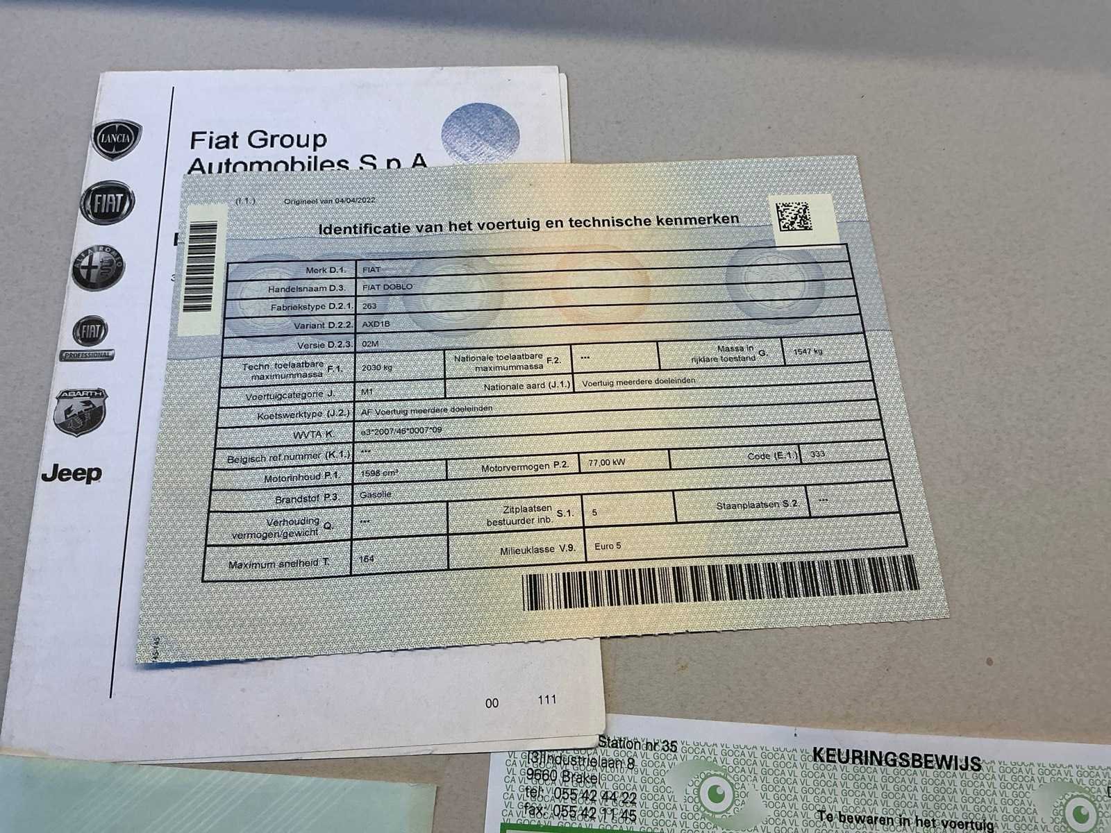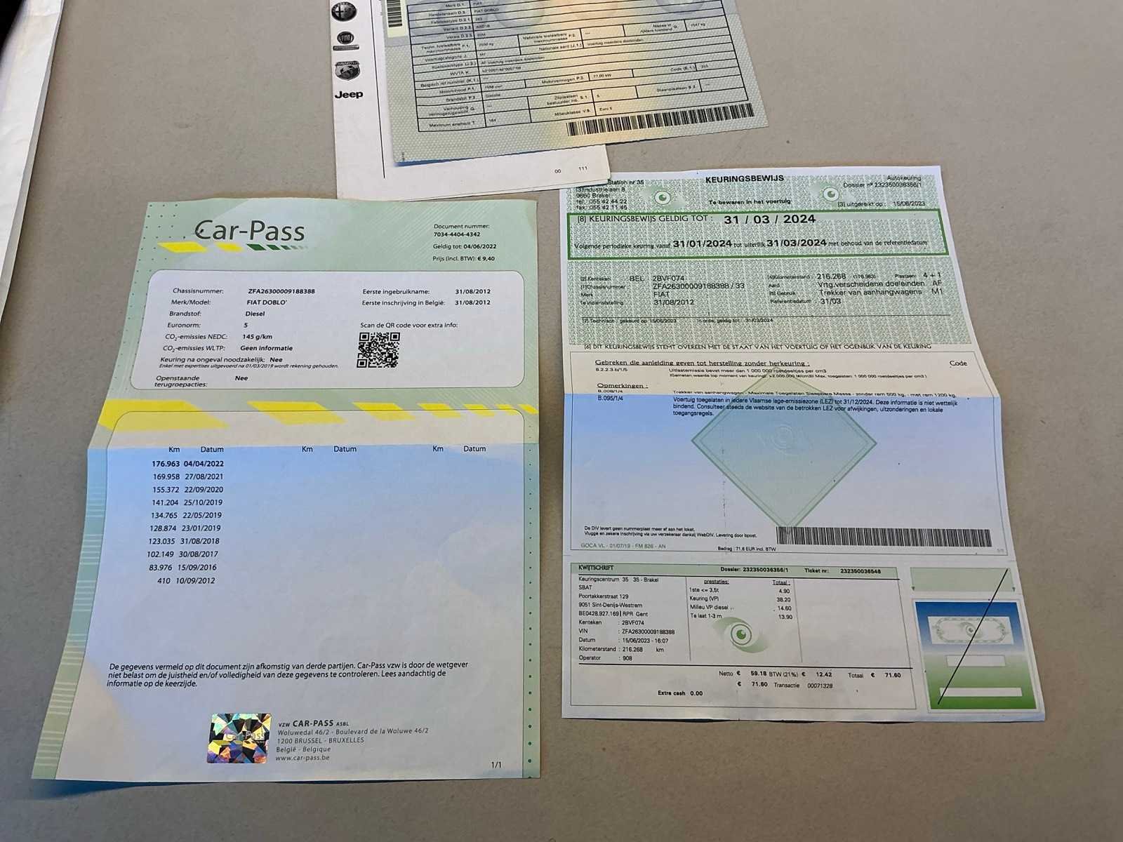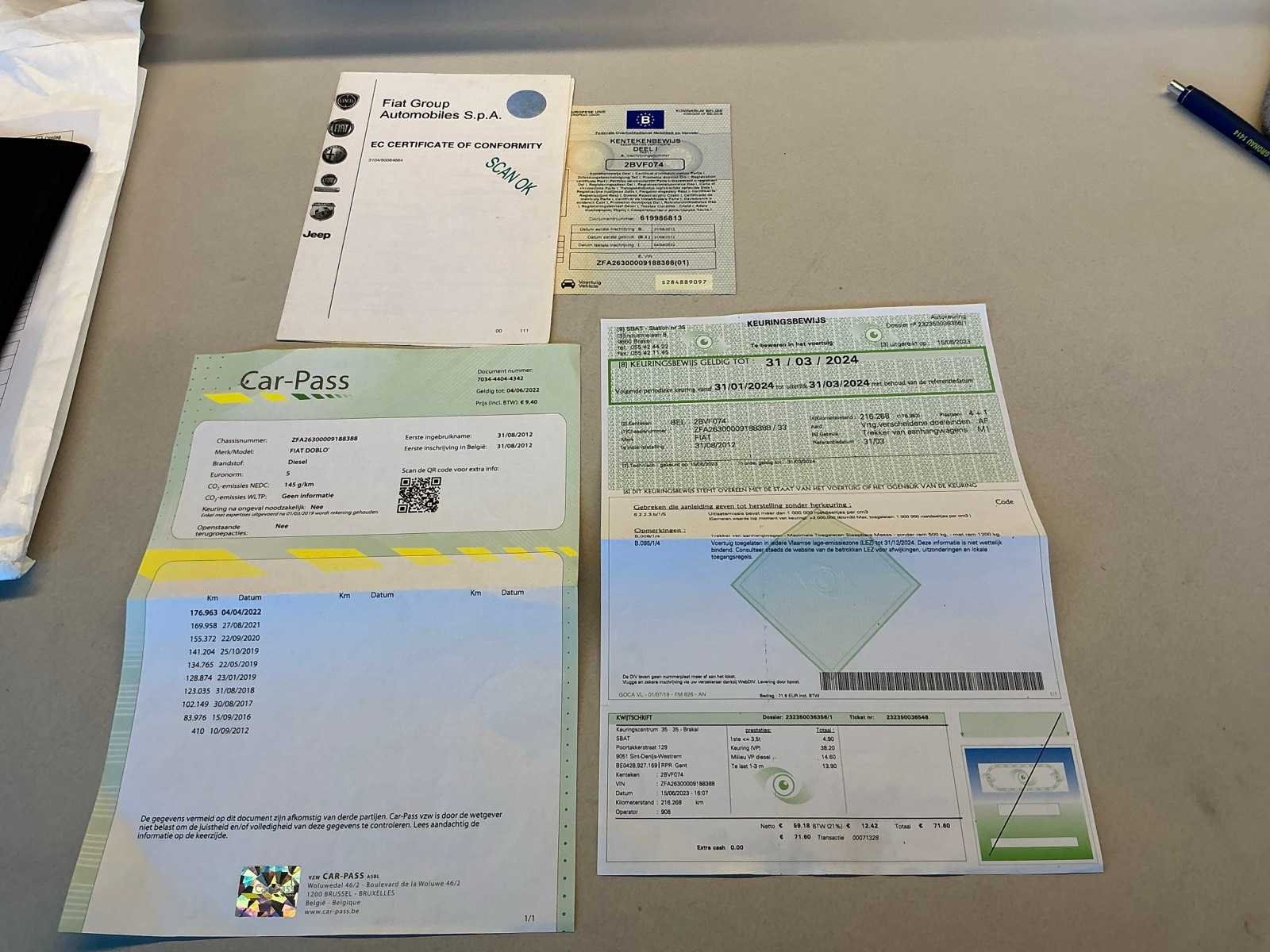 No Merk: Fiat Model: Doblo Bouwjaar: 2012 Afgelezen kilometerstand: 225261km Cilinderinhoud: 1598cc Vermogen (kW): 77kW Brandstof: diesel Chassisnummer: ZFA26300009188388 Datum eerste toelating: 31/08/2012 Transmissie: Handgeschakeld Emissieklasse: Euro 5 Aantal sleutels: 1 Nationaliteit documenten: BELGIË Gelijkvormigheidsattest aanwezig: true Carpass: true Keuringsrapport geldig tot: 31/03/2024 Vavato voert geen technische keuring uit.: true Inschrijvingsbewijs - deel 1 : Aanwezig Inschrijvingsbewijs - deel 2: Niet aanwezig