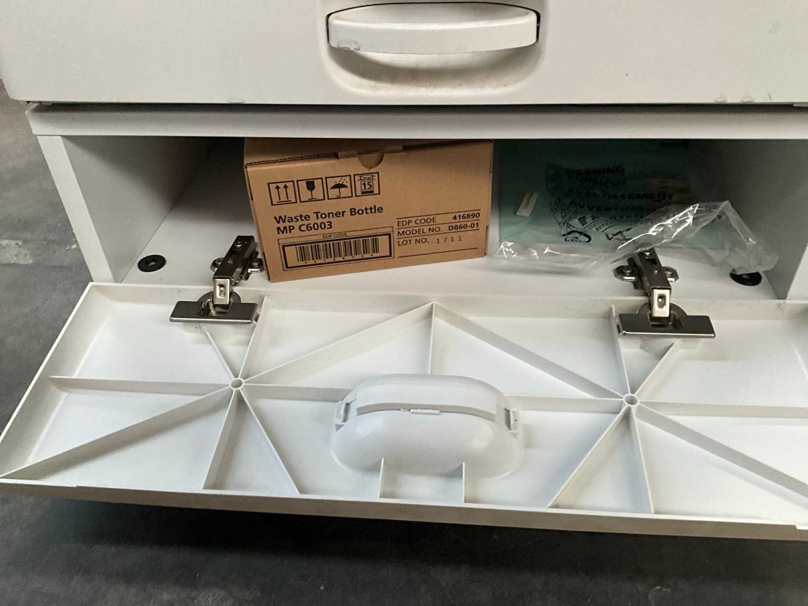 Verrijdbaar en voorzien van 2 schuiven en opbergvak onderaan. Met serienummer C768R220013. No Merk: RICOH Type: MP C2004ex