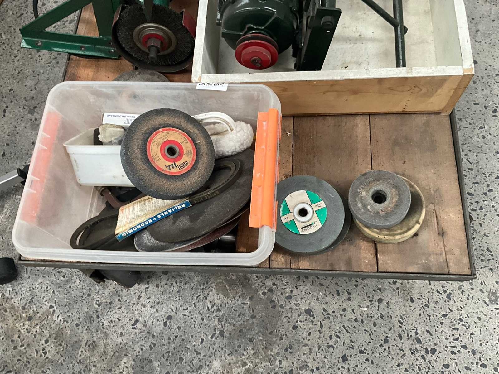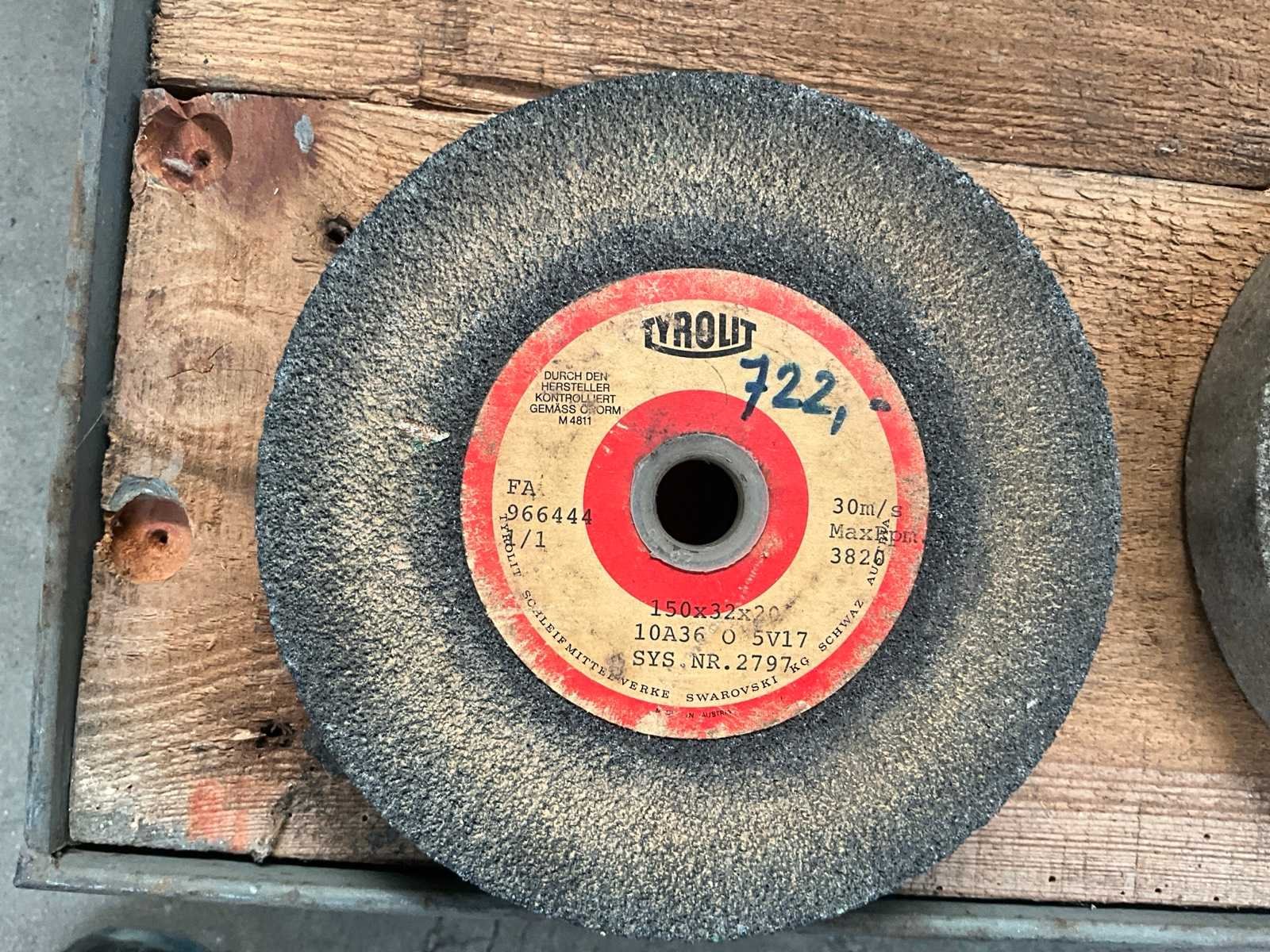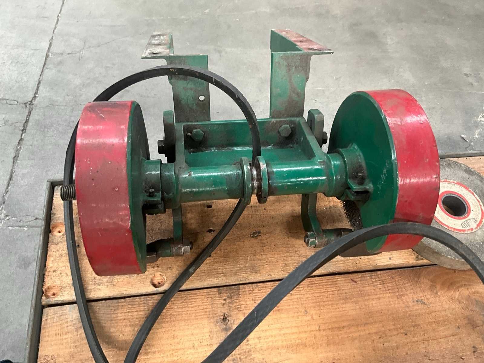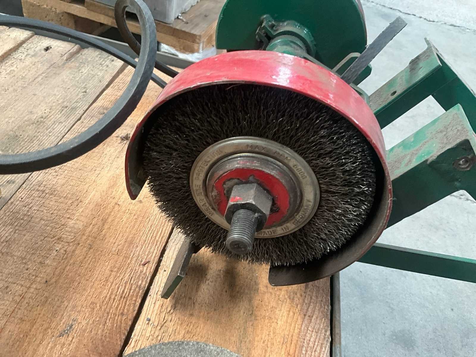 Gedemonteerd van muurwand, op metalen houder en voorzien van Tyrolit slijpsteen diameter 14 cm en 2,5 cm breed en staalborstel, compleet met 2 diverse slijpstenen Tyrolit 15 cm diameter in 2 verschillende diktes. Compleet elektromotor ACEC type AK 80 M 42 R, op metalen houder en voorzien van aan/uit schakelkast. No
