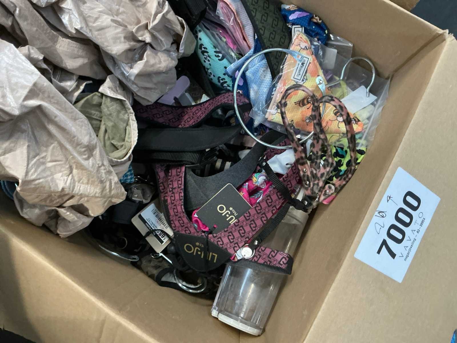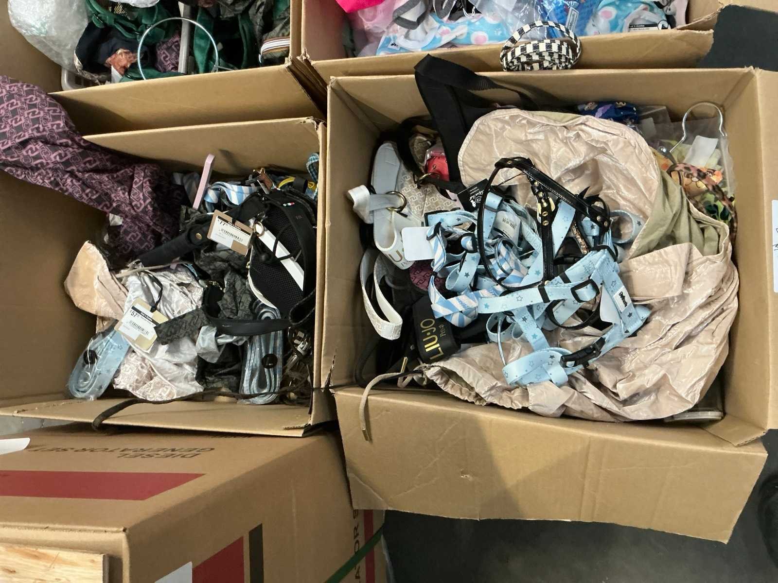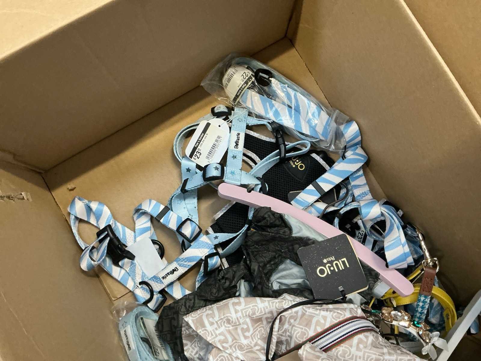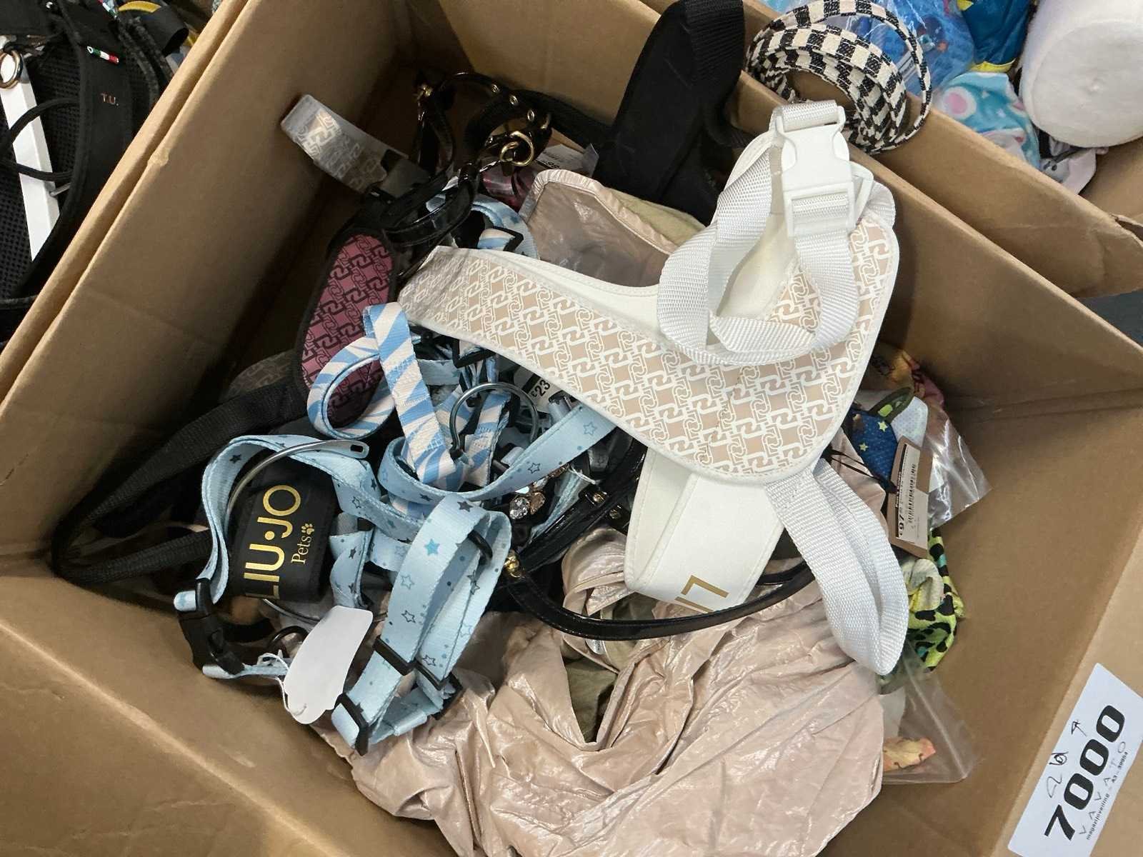 Waaronder LIU-JO Pets, TRILLYTUTTIBRILLY, BARCELONA DOG’S, BULLTASTIC, .., waaronder diverse leibanden, harnassen, bandana’s en enige regenjassen, in diverse uitvoeringen, kleuren en types, liggende in 2 dozen Nee