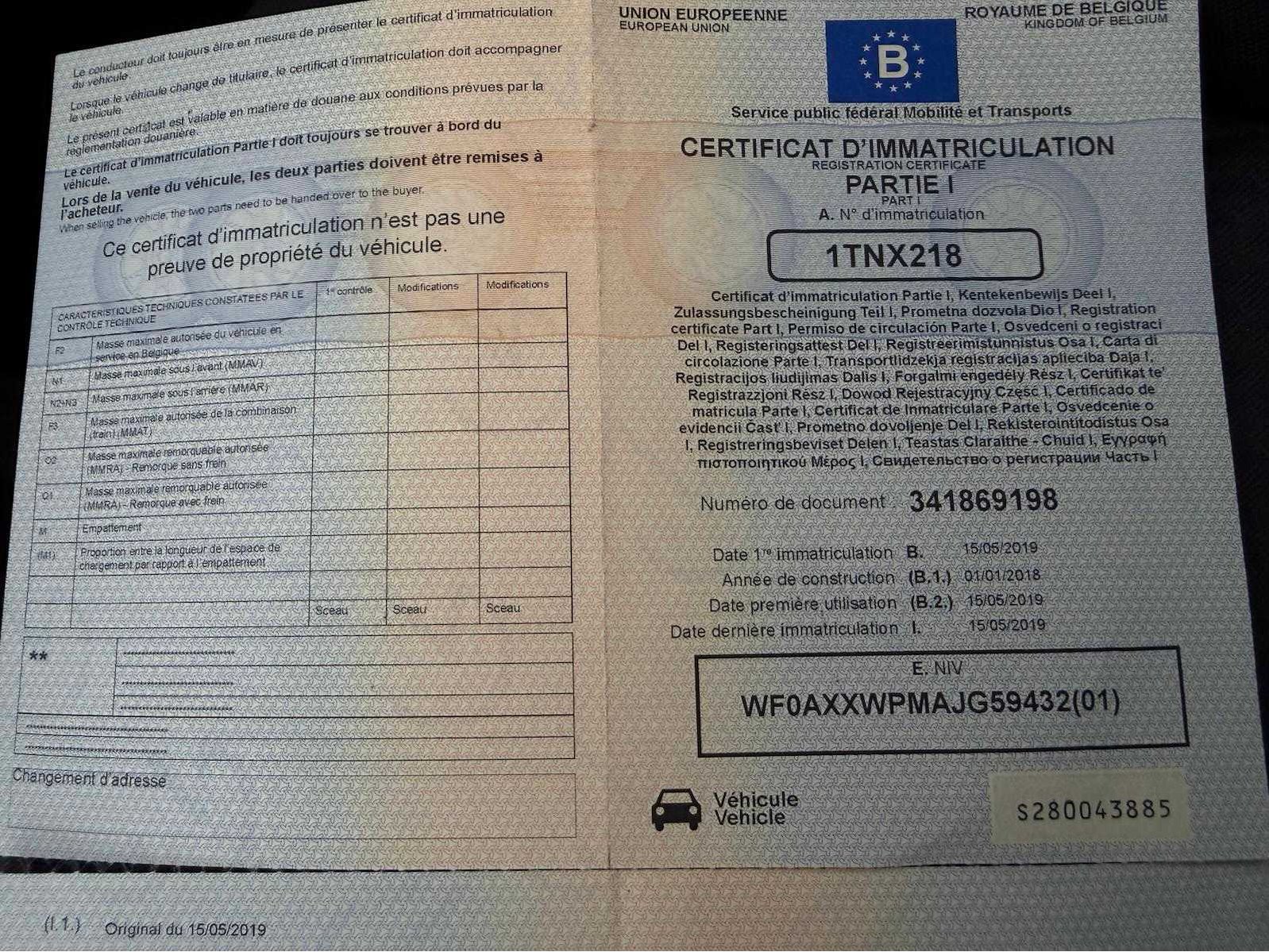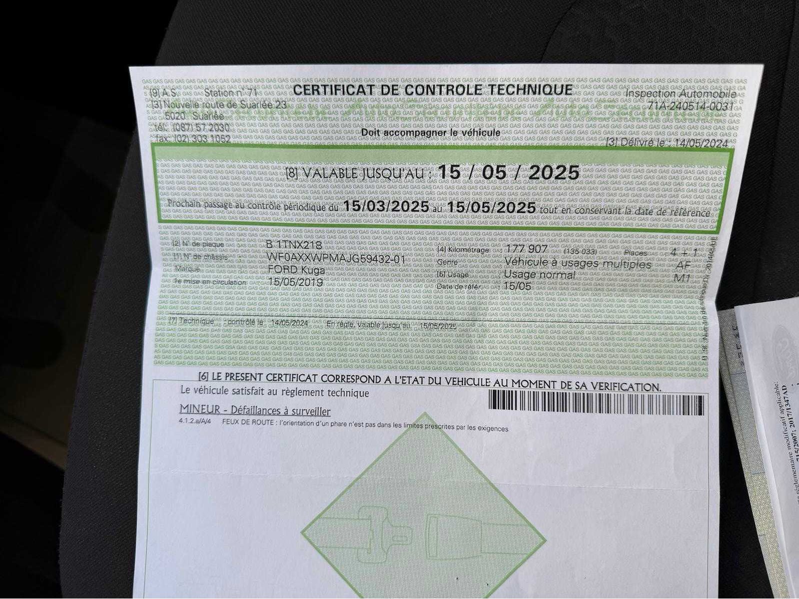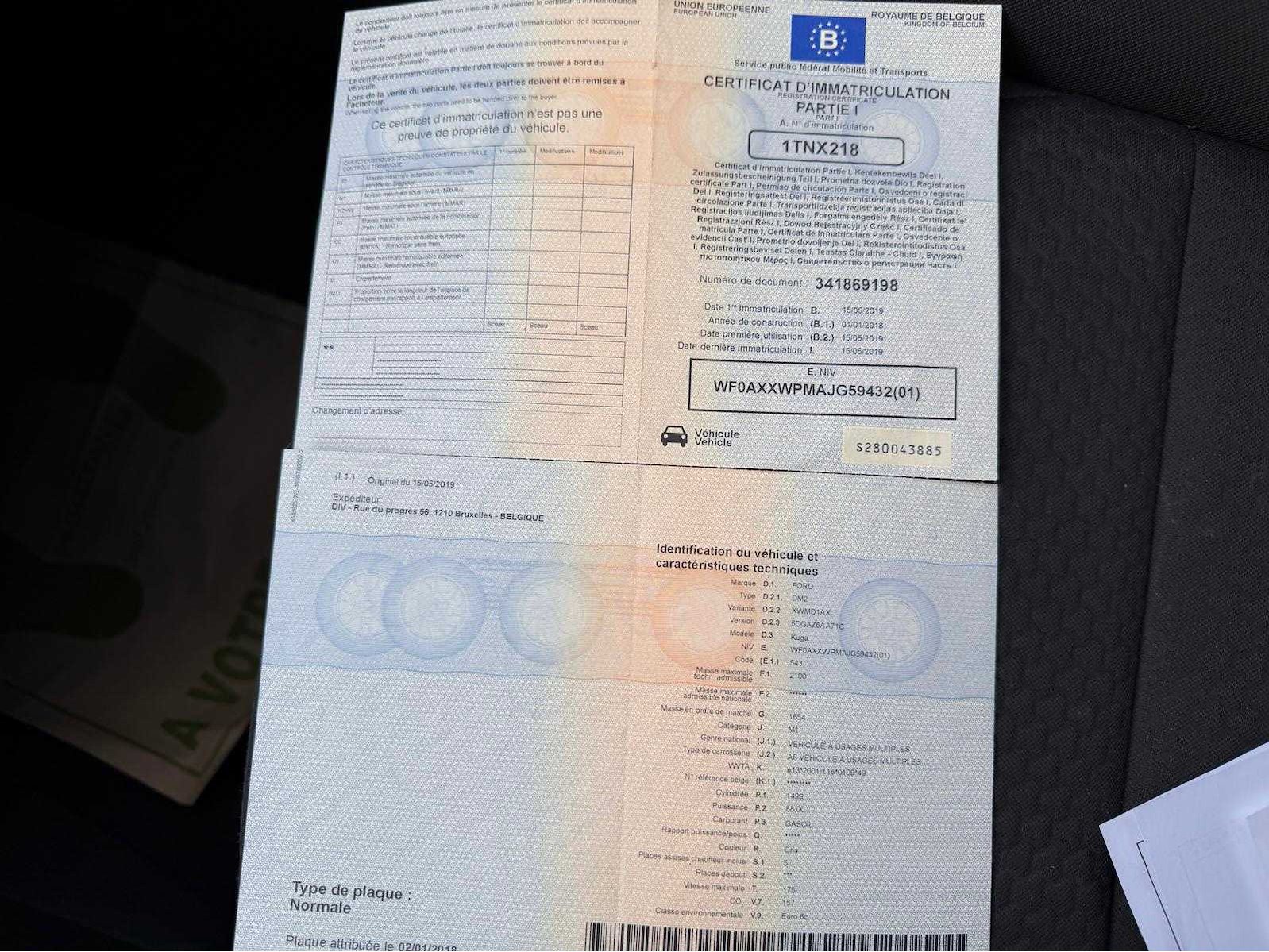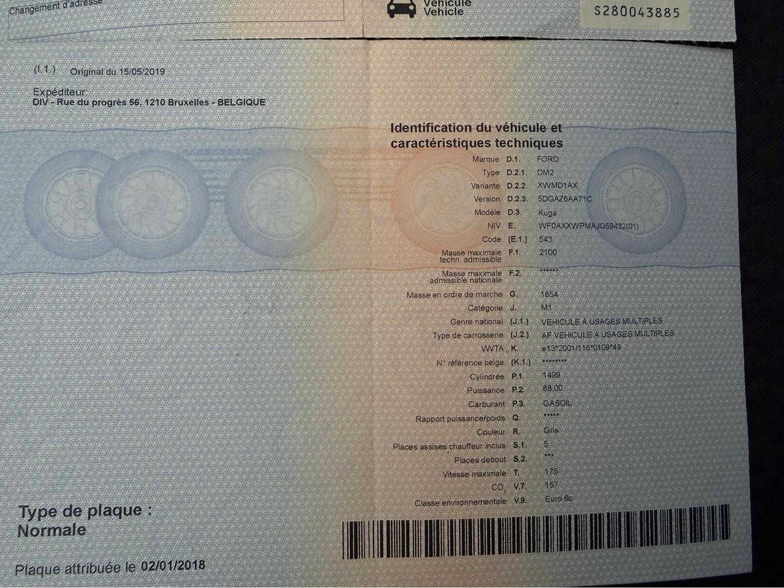 Nee Merk: Ford Model: Kuga Bouwjaar: 2018 Afgelezen kilometerstand: 194693km Cilinderinhoud: 1499cc Vermogen (kW): 88kW Brandstof: diesel Chassisnummer: WF0AXXWPMAJG59432 Datum eerste toelating: 15/05/2019 Kleur: Grijs Transmissie: Handgeschakeld Emissieklasse: Euro 6c Nationaliteit documenten: België Start en rijdt: Ja Vavato voert geen technische keuring uit.: true Inschrijvingsbewijs - deel 1 : Aanwezig Inschrijvingsbewijs - deel 2: Aanwezig