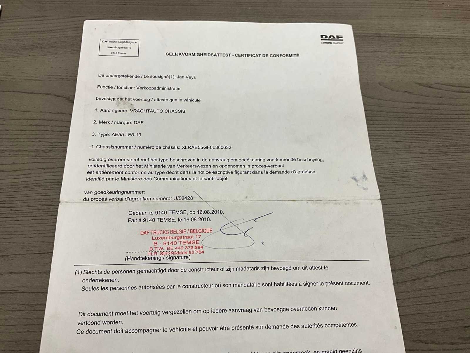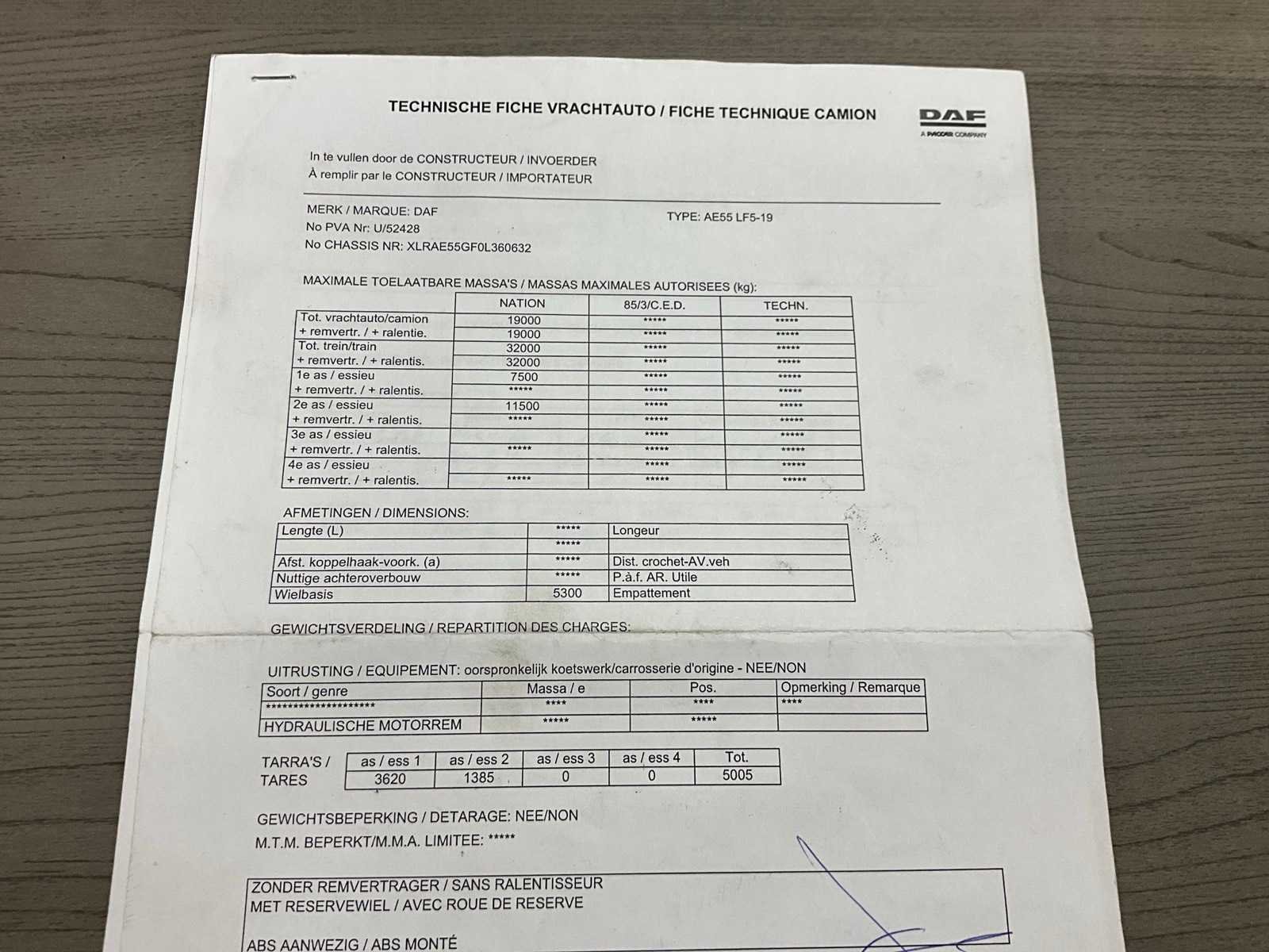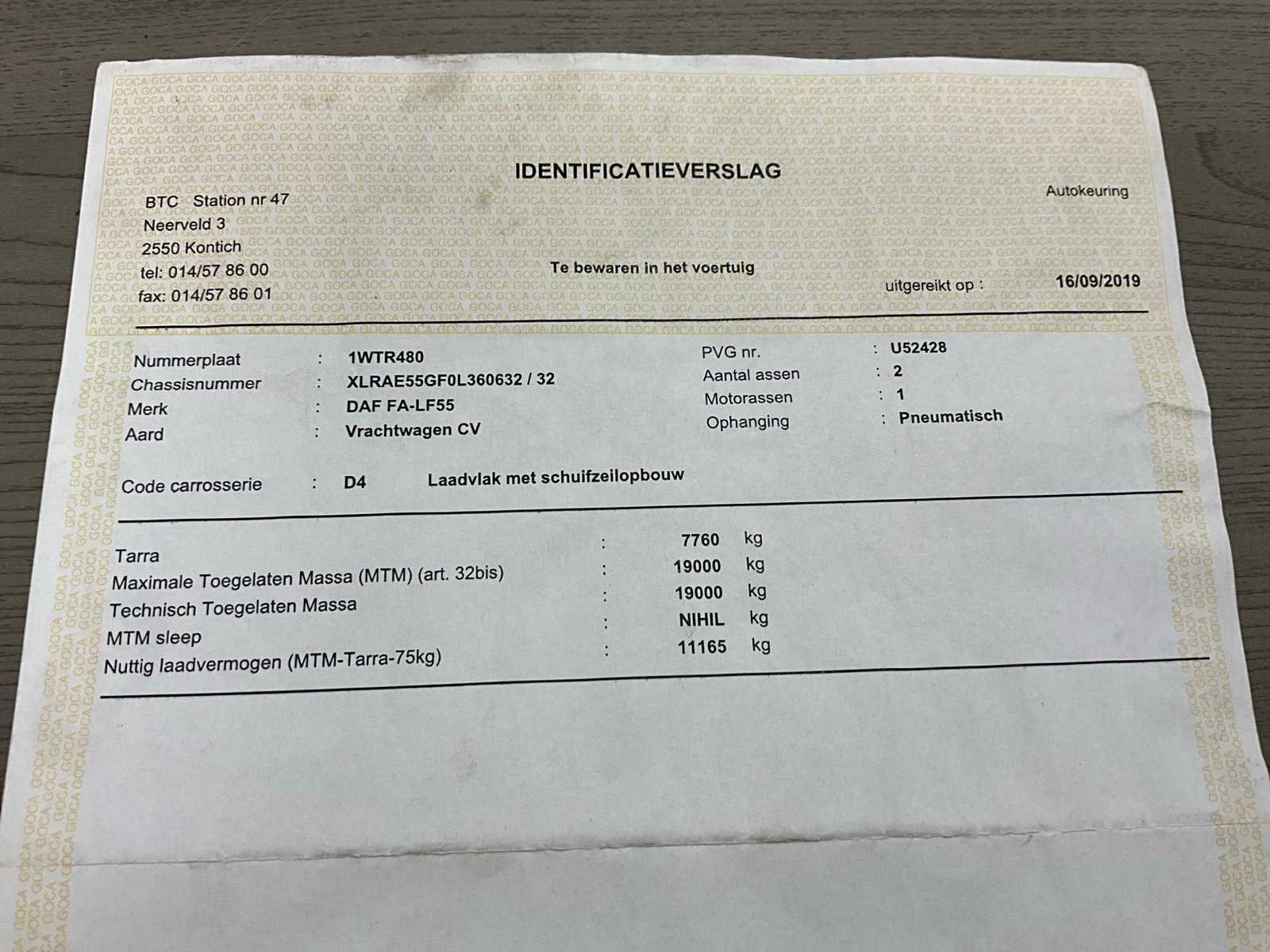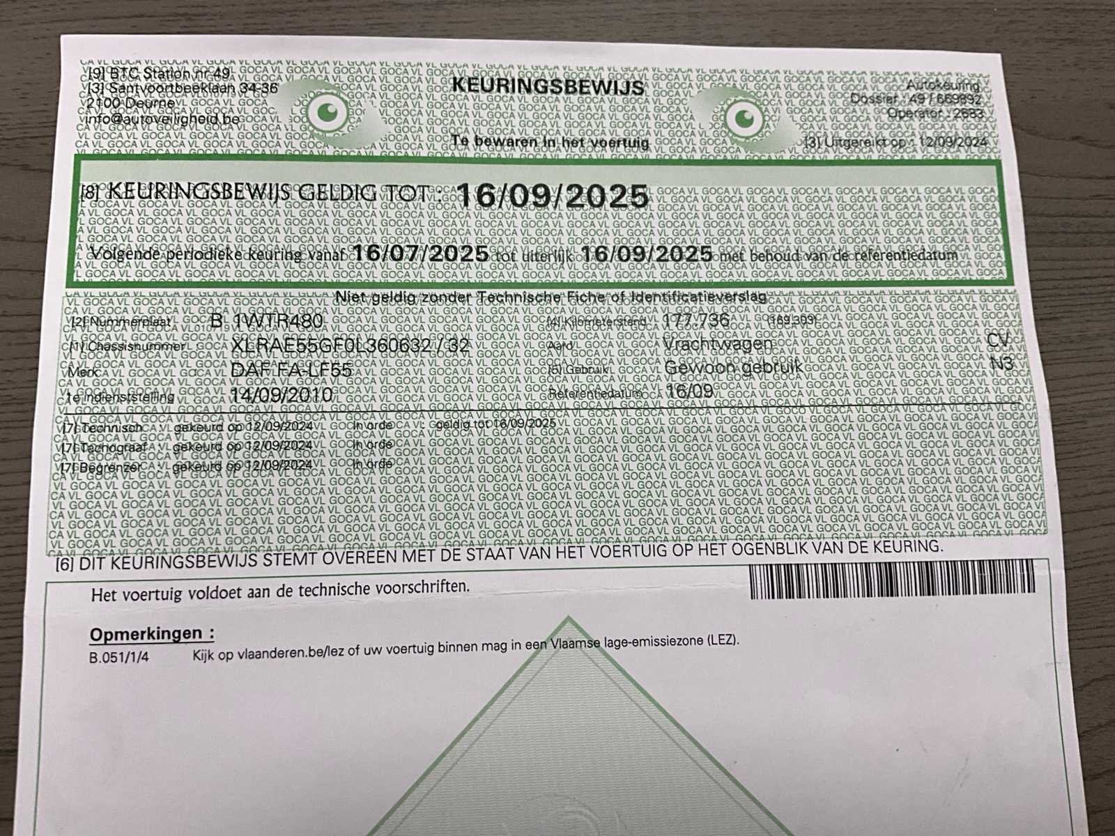 DAF LF 55.250 uit 2010, een zeer betrouwbaar en compleet uitgerust distributievoertuig in goede werkende staat, onmiddellijk inzetbaar voor transport, logistiek en bouwsector. Dit exemplaar onderscheidt zich door LAGE KILOMETERSTAND (183.000 km), automatische versnellingsbak, WERKENDE AIRCO, krachtige 250 pk Euro 5-motor én een perfect functionerende hydraulische laadklep. Het interieur en chassis ogen netjes en goed onderhouden (zie foto’s) - Exterieur: Cabine in gebruikte maar nette staat, Enkele krassen en lakslijtage op bumper en cabine - Zeilopbouw in redelijke staat: Kleine scheurtjes / herstellingen zichtbaar (typisch voor bouwjaar) - Laadklep toont oppervlakteroest, maar geen structurele schade - Chassis: zonder corrosie - Banden: Linker achterband beschadigd → wordt vervangen door verkoper, reserve aanwezig, Overige banden lijken OK - Interieur: Bestuurdersstoel luchtgeveerd, lichte gebruikssporen, Bedieningselementen compleet en werkend, Cabine proper voor bouwjaar - Technisch: Motor loopt goed, Dashboard bevestigt correcte olietemperatuur, luchtdruk en geen direct kritieke foutmeldingen - Hydraulische laadklep werkt Nee Merk: DAF Type: LF 55.250 Bouwjaar: 2010 Chassisnummer VIN: XLRAE55GF0L360632 Cilinderinhoud: 6693cc Kilometerstand bij opname: 183349km Datum eerste toelating: 14/9/2010 Type transmissie: Automatisch Aantal assen: 2 Laadvermogen: 11165kg Emissieklasse: Euro 5 Eigen gewicht: 7760kg Kentekenpapieren compleet?: true Aantal zitplaatsen: 2 Automaat: true Diesel: true