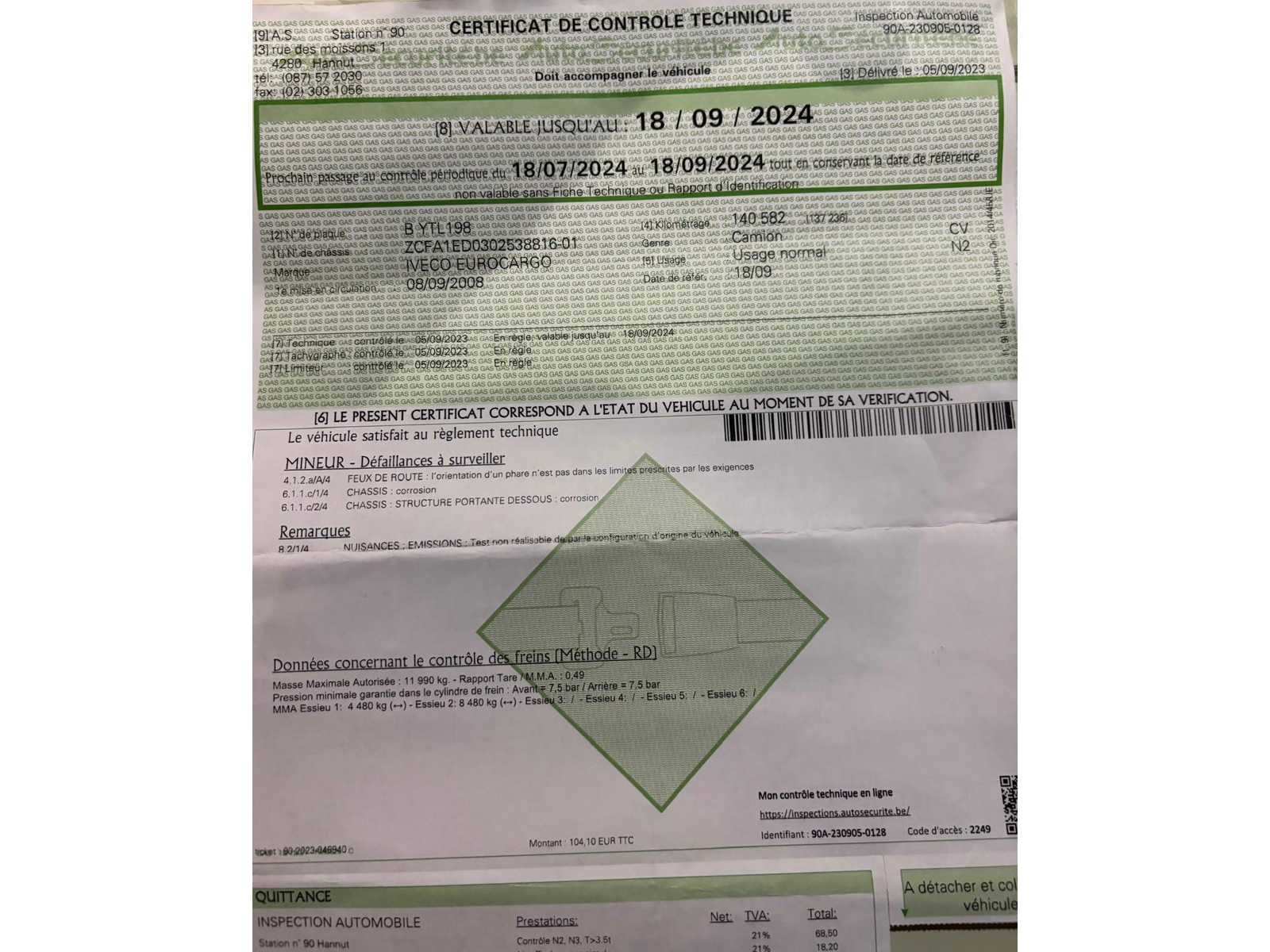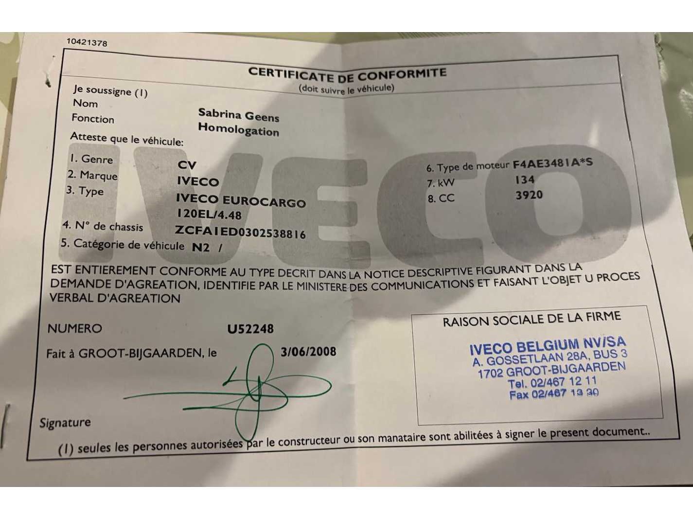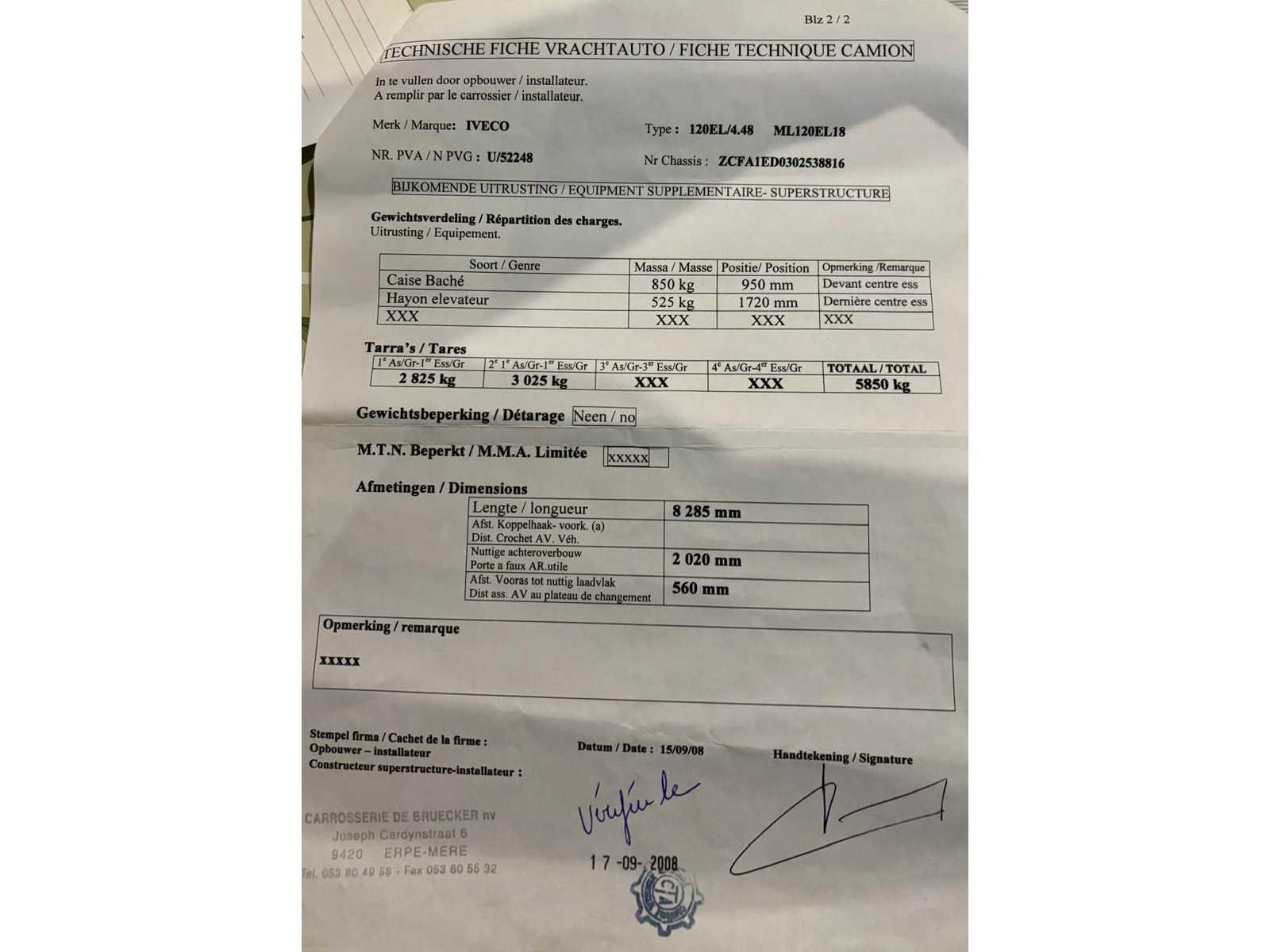 Een goed onderhouden Iveco Eurocargo 120EL18 uit 2008, uitgerust met een gesloten opbouw met schuifzeilen en een hydraulische laadklep. Deze 12-tons vrachtwagen is ideaal voor distributie, logistiek, bouwtransport, pallets en volumegoederen - Euro 5 motor → ook in lage-emissiegebieden inzetbaar - hydraulische laadklep 525kg - Belgische papieren compleet - Laatste technisch keuring 5/9/2023 (en nadien niet meer mee gereden volgens verklaring verkoper): Enkel lichte opmerkingen: Oppervlakteroest aan chassis/Lichte corrosie dragende structuur/Koplampafstelling te controleren - Motor start goed met booster; batterij is aan vervanging toe. Door de lage accuspanning was de kilometerstand niet leesbaar bij opname - vrachtwagen wordt verkocht ZONDER INHOUD Nee Merk: Iveco Type: Eurocargo 120EL18 Bouwjaar: 2008 Chassisnummer VIN: ZCFA1ED0302538816 Cilinderinhoud: 3920cc Kilometerstand bij opname: 140000km Datum eerste toelating: 8/9/2008 Type transmissie: Handmatig Aantal assen: 2 Fuel Type: Diesel Laadvermogen: 6100kg Emissieklasse: Euro 5 Hydraulische laadklep: true Eigen gewicht: 5890kg Totale afmeting L: 8200mm Nationaliteit documenten: B Kentekenpapieren compleet?: true Aantal zitplaatsen: 3 Zelf rijdend exporteren: Mogelijk Handgeschakelde versnellingsbak: true Diesel: true