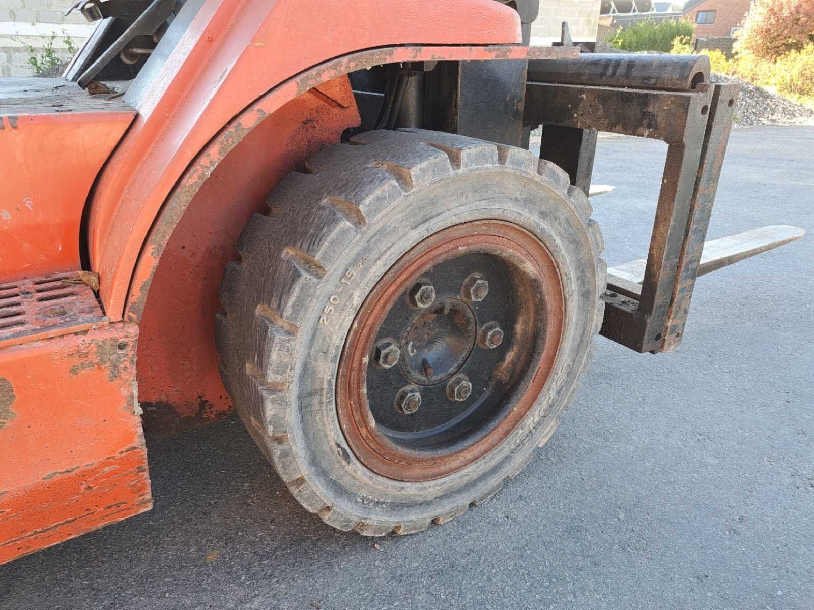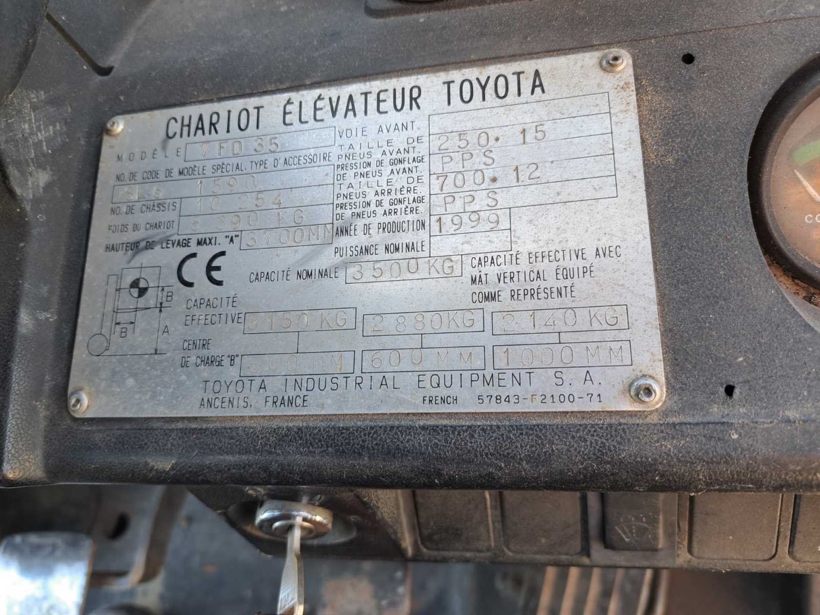 De heftruck in zeer goede staat werkt perfect No Merk: Toyota Type: 7FD35 Bouwjaar: 1999 Serienummer: SL6 1590 10 254 Brandstof: Diesel Aantal wielen: 4 Afgelezen urenstand: 1554 Eigen gewicht: 5390kg Hefvermogen: 3150kg Max. hefhoogte: 3500mm