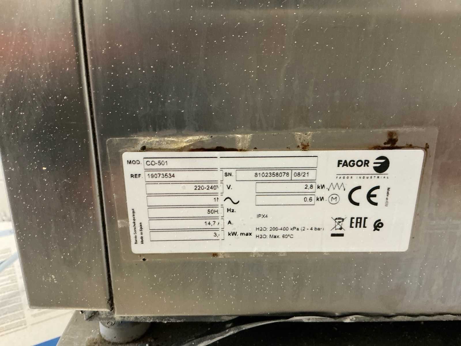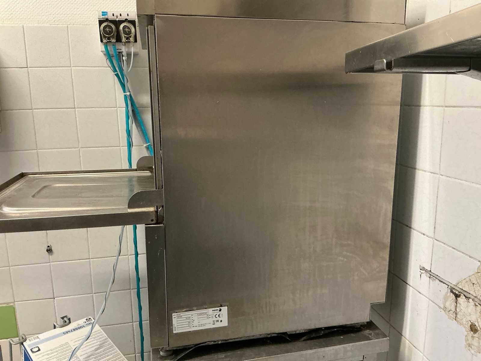 Fagor CO-501 Professionele Vaatwasmachine – Fagor Concept Serie Degelijke horeca-vaatwasmachine van het merk Fagor, model CO-501. Ideaal voor restaurants, cafés, snackbars en grootkeukens. Uitgerust met meerdere wasprogramma’s, RVS behuizing en een eenvoudig bedieningspaneel met vier functiesymbolen. De machine heeft een krachtige waspomp (0,6 kW) en een verwarmingselement van 2,8 kW voor snelle en efficiënte reiniging. Binnenin bevindt zich een uitneembaar rek geschikt voor glazen, servies en bestek. Machine verkeert in gebruikte staat met normale slijtage. Betrouwbare horeca-vaatwasser van Fagor – klaar voor intensief gebruik. No Merk: FAGOR Model: CO-501 Spanning: 230V Lengte: 61cm Breedte: 60cm Hoogte: 85cm