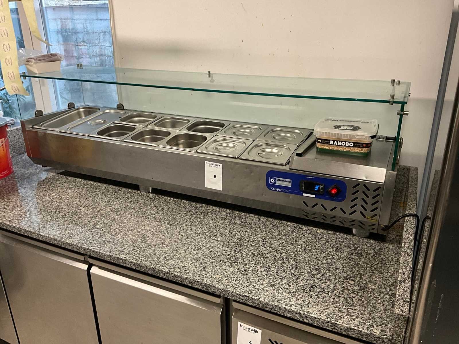 Voorzien van 12 norm bakken deels met deksel, glazen opstand Nee Merk: Diamond Type: Compact line Ingebouwde koelcompressor: true Aansluiting: 220V Temperatuurbereik min.: 2°c Totale afmeting L: 400mm Totale afmeting Breedte: 1600mm Totale afmeting Hoogte: 470mm
