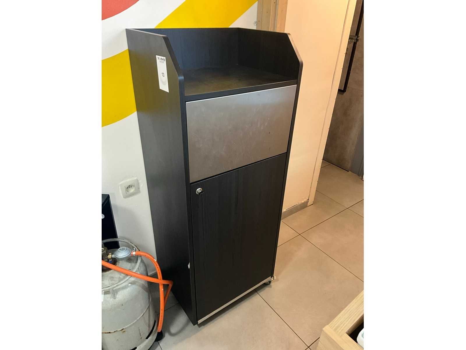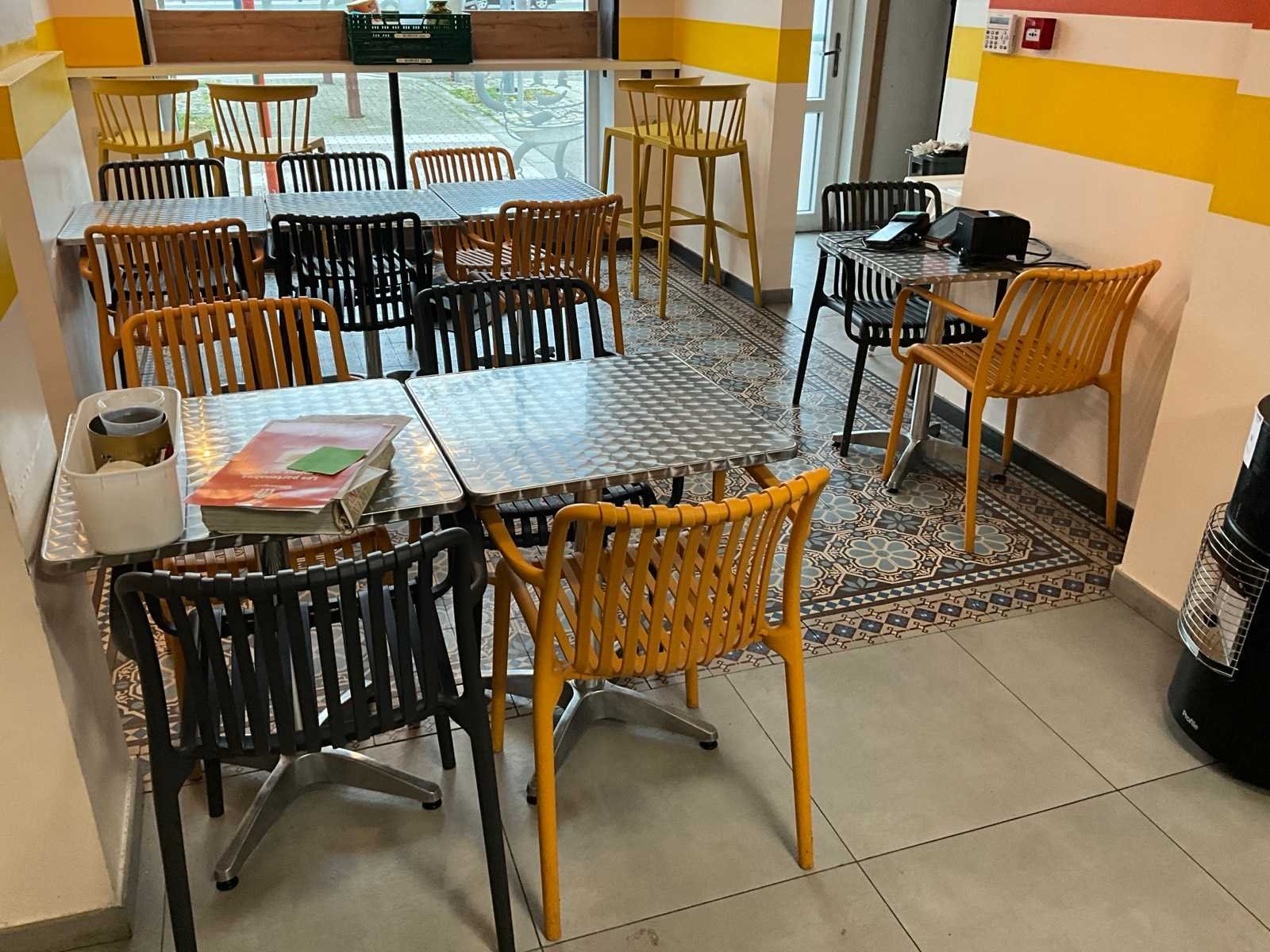 Bestaand uit 6x vierkant roestvrije tafeltjes afmetingen 60x60x72 cm, + 16 x bijhorende kunststof design stoelen in twee kleuren geel en zwart, + 4x barkruk kunststof kleur geel, + afdienkast met vuilnisluik, +1x kinderstoel Nee