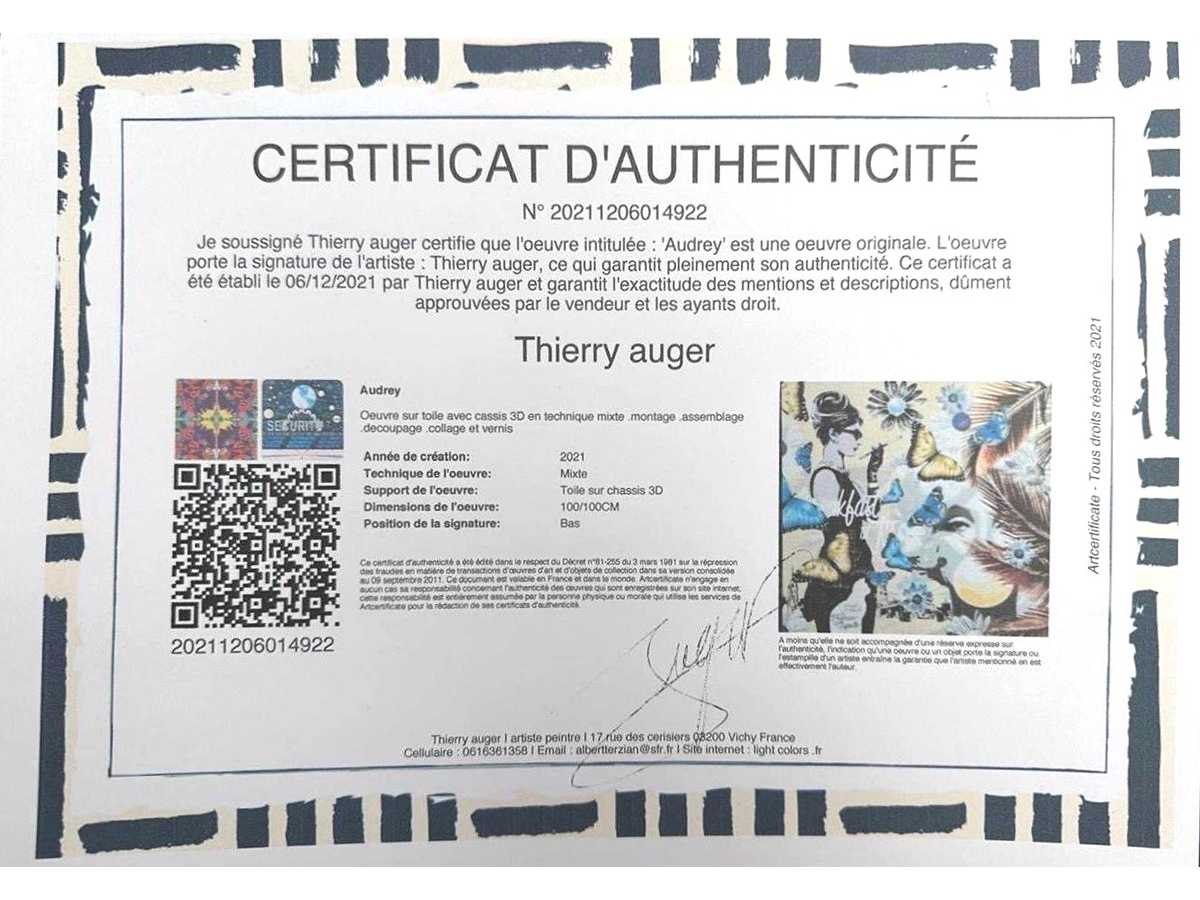 Met echtheidscertificaat - galerieprijs: 1.250 € - Franse kunstenaar Thierry Auger laat zich inspireren door de pop-art. In zijn werk combineert hij iconische beelden en felle kleuren met expressieve composities die balanceren tussen figuratie en abstractie. Zijn schilderijen zijn opgenomen in diverse Franse en internationale collecties. Nee Kunstenaar: Thierry Auger (Vichy, 1968) Titel van werk: Audrey Techniek: Gemengde techniek op doek Handtekening/oplage: true Oplage: Origineel Gesigneerd: Gesigneerd Hoogte: 100cm Breedte: 100cm Frame: false