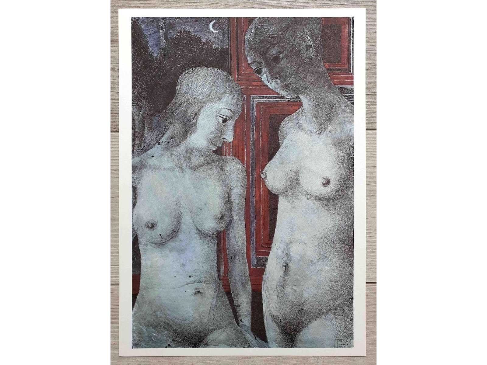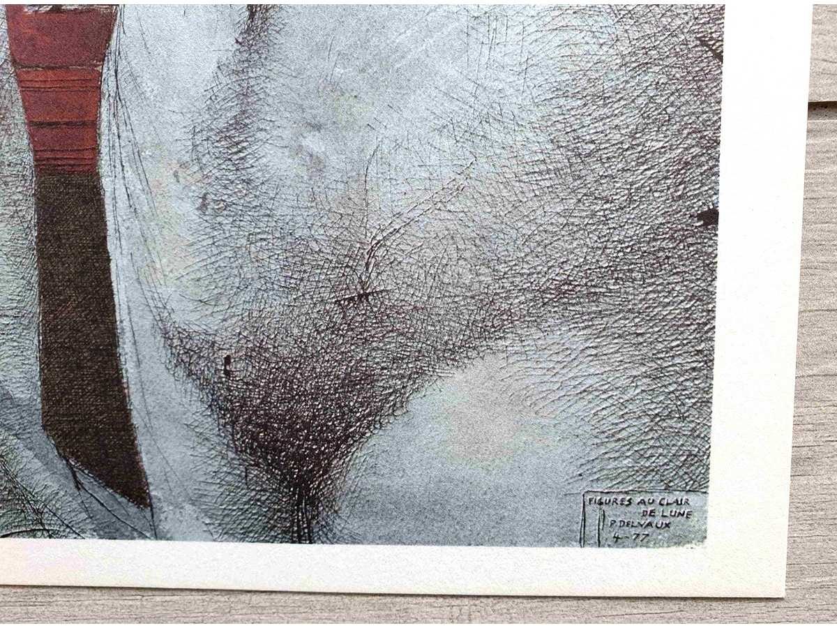 Offset litho op handgeschept papier, getekend en gedateerd in de plaat, naar gelijknamig origineel werk van 1977, afkomstig uit de map 'Hedendaagse Belgische tekenaars' Nee Kunstenaar: Paul Delvaux (1897 – 1994) Titel van werk: Figures au clair de lune Periode: 1977 Techniek: Offset Handtekening/oplage: false Hoogte: 45cm Breedte: 33cm Frame: false