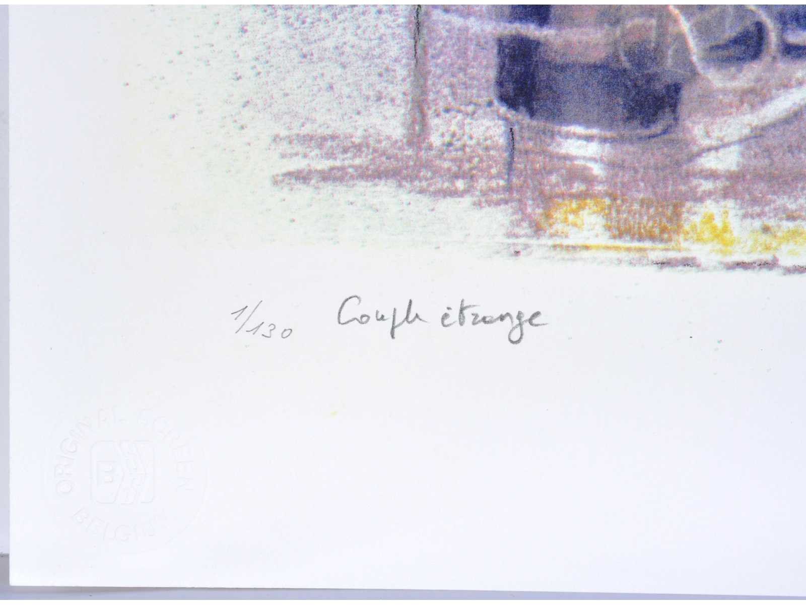 Betreft exemplaar nr 1 van de oplage - Uit de verzamelmap 'Jubileumuitgave Peter Bekaert 1971-1996' - Drukatelier: Original screen - Uitgever: Bekaert - In puntgave staat, nooit voorheen ingelijst, steeds in de grafiekmap bewaard - Nee Kunstenaar: André Goezu (Antwerpen, 1939) Titel van werk: Couple étrange Periode: 1996 Techniek: Kleurenzeefdruk Handtekening/oplage: true Oplage: 1/130 Gesigneerd: Gesigneerd en genummerd Hoogte: 60cm Breedte: 80cm Frame: false