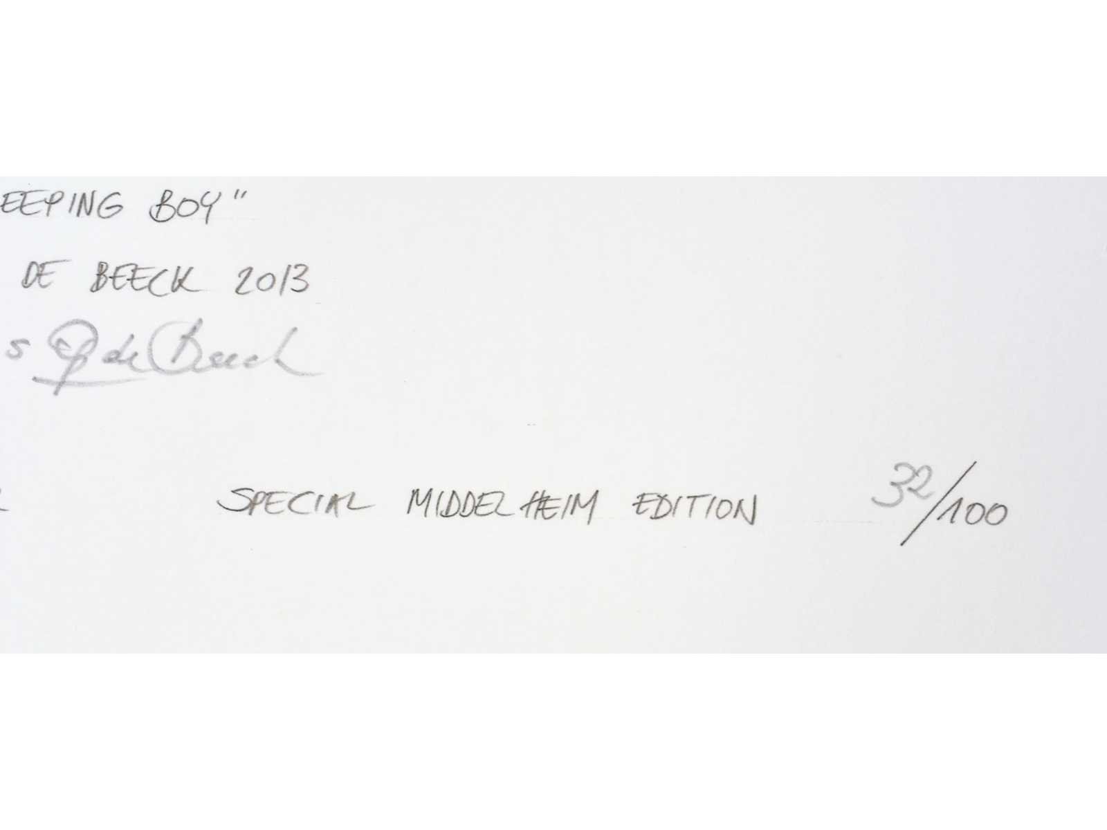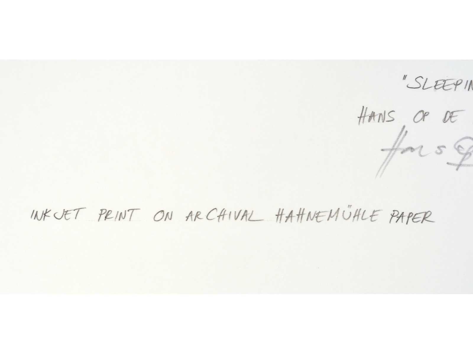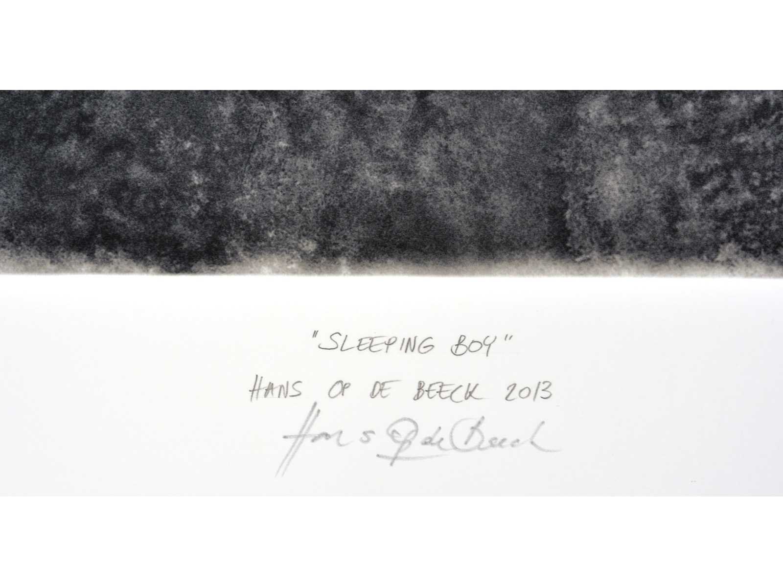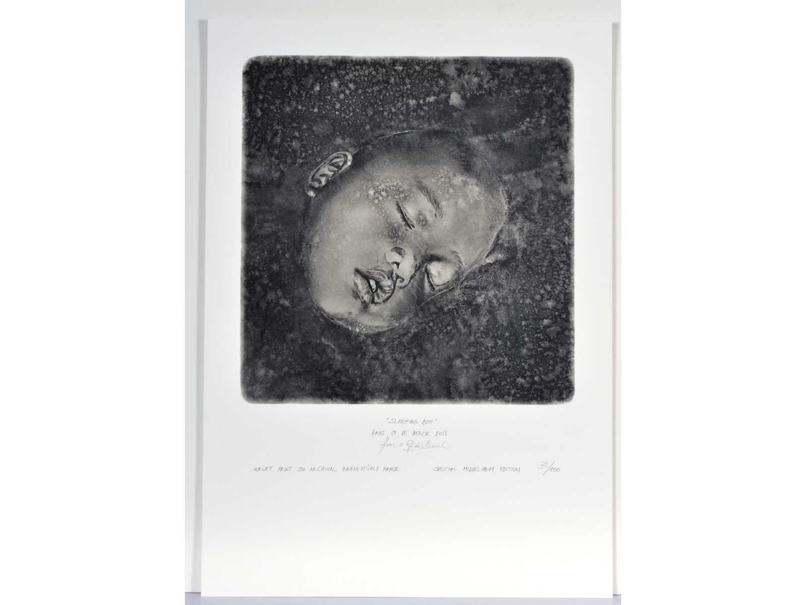 Uitgever: Middelheim Promotors (Antwerpen) Nee Kunstenaar: Hans Op de Beeck (Turnhout, 1969) Titel van werk: Sleeping boy Datering: 2013 Techniek: inkjet print Materiaal: op Archival Hahnemülhe papier Handtekening/oplage: true Oplage: 32/100 Gesigneerd: Gesigneerd en genummerd Hoogte: 30cm Breedte: 21cm Frame: false