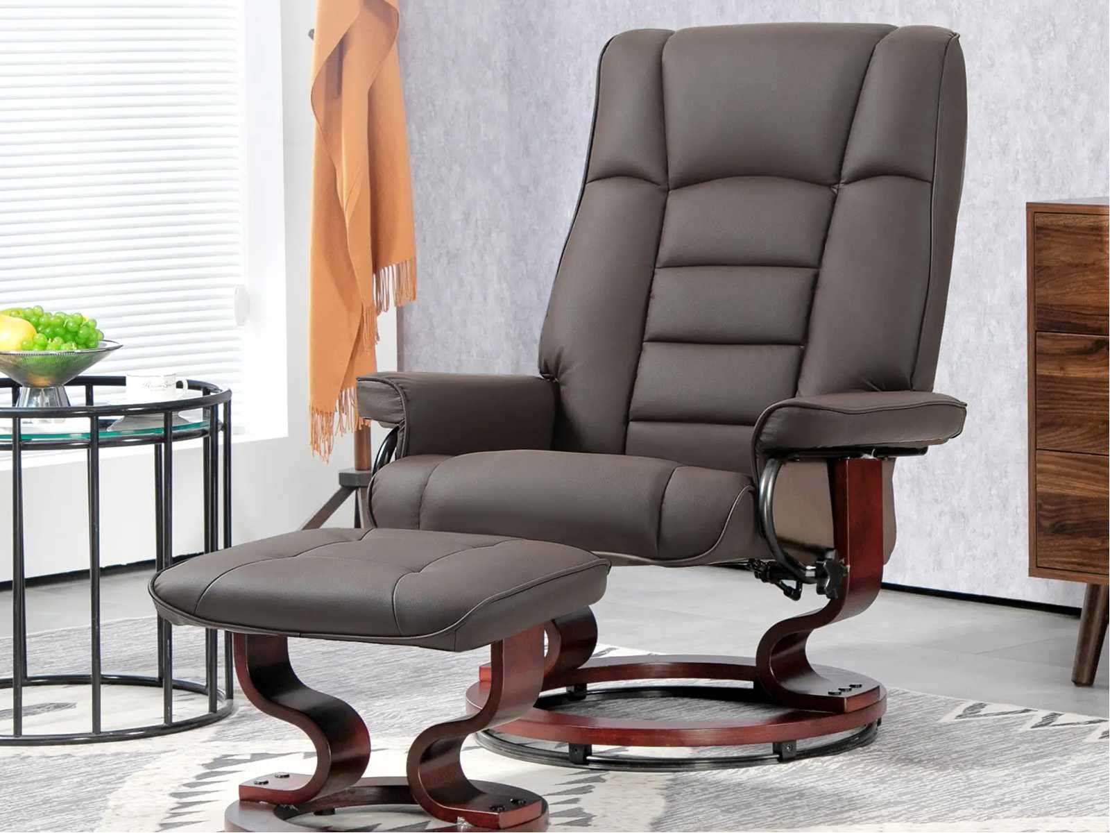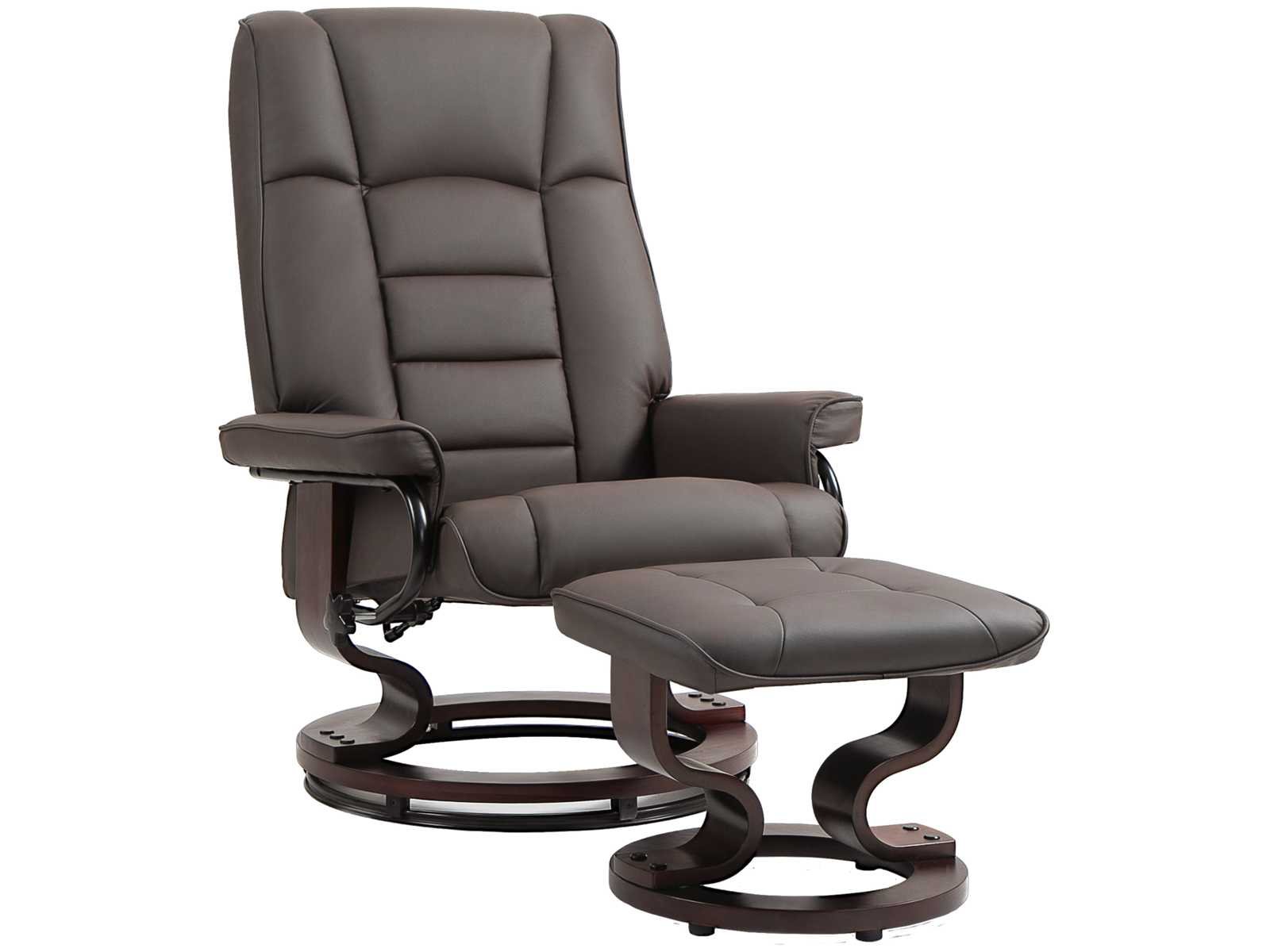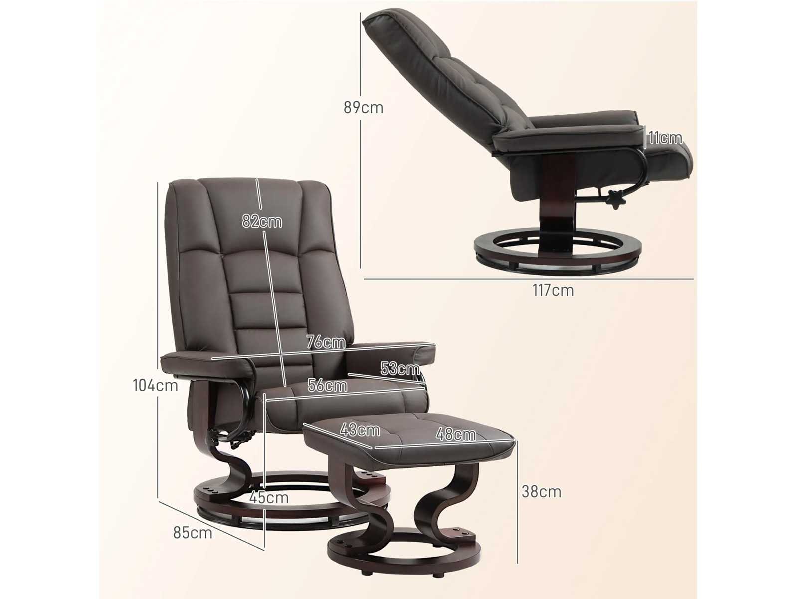 Spécifications: - Couleur : marron - Matériaux : revêtement synthétique, mousse, bois courbé - Dimensions droit : 76L x 85l x 104H cm - Dimensions position allongée : 76L x 117l x 89H cm - Dimensions du pouf : 48L x 43l x 38H cm - Dim. du siège : 56L x 53l x 45H cm - Épaisseur du siège : 13 cm - Dim. du dossier : 82L x 64l cm - Épaisseur du dossier : 14 cm - Dim. de l'accoudoir : 52L x 13l x 11H cm - Distance minimale au mur : 80 cm - Charge max. recommandée : 150 kg Non