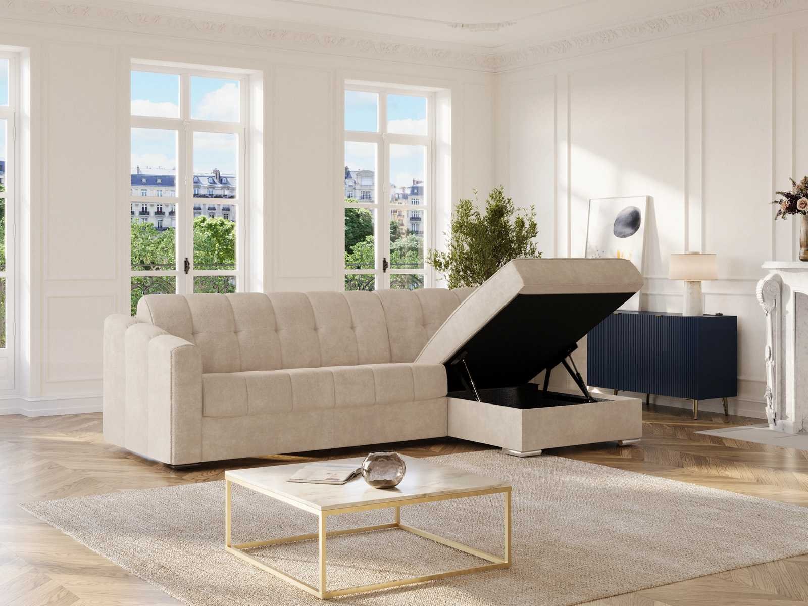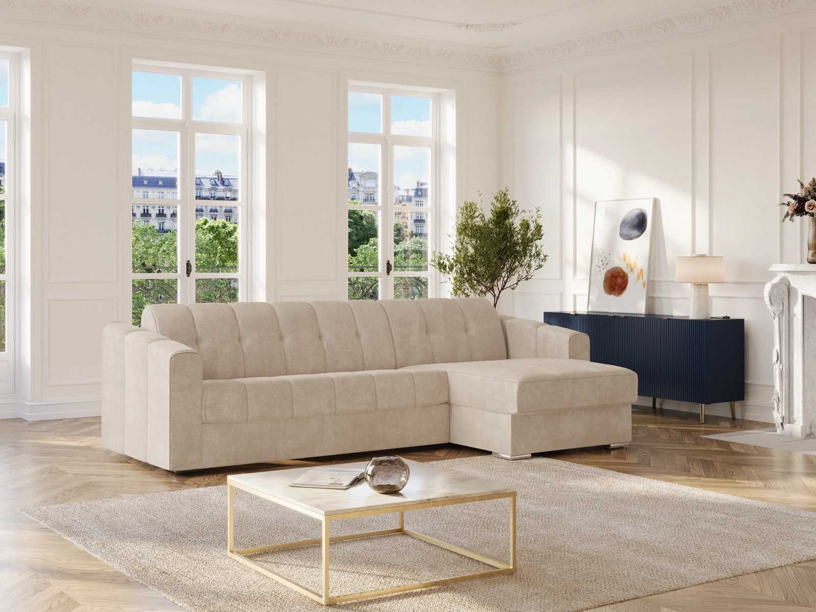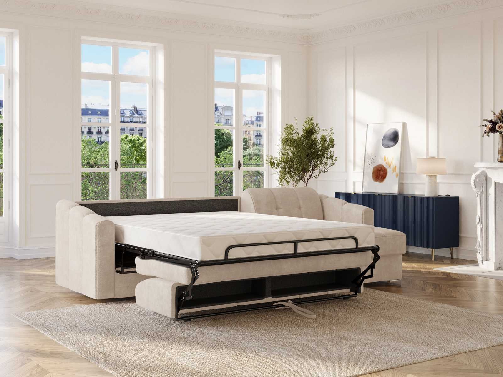 Caractéristiques Technologie matelas (densité) : 28 kg/m³ Couleur (nuance) : Beige Matière : 100 % Polyester Structure : Bois, Panneau de particules, Métal Finition : Texturé Type d'angle : Angle droit, Angle gauche, Angle réversible Nombre de places : 4 places Garnissage de l'assise : Mousse polyuréthane haute résilience Densité assise : 30 kg/m³ Suspension de l'assise : Sangles élastiques entrecroisées Garnissage du dossier : Flocons de mousse polyuréthane Avec accoudoirs Type de convertible : Convertible express Couchage quotidien Technologie matelas : Mousse à mémoire de forme Avec sommier Type de sommier : Métal Type de rangement : Range-oreillers 1 coffre Gamme : Good for Planet, À la carte Produit éco-responsable : Fabriqué en Europe Charge maximale supportée : 480 kg À monter soi-même Dimensions Longueur : 275 cm Hauteur : 90 cm Profondeur : 223 cm, 152 cm Epaisseur matelas : 22 cm Hauteur des pieds : 8 cm Hauteur d'assise : 55 cm Profondeur d'assise : 56 cm Profondeur d'assise de la méridienne : 113 cm Largeur du couchage : 140 cm Longueur du couchage : 190 cm Non