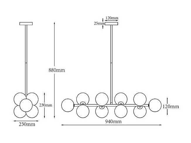 Caractéristiques Couleur (nuance) : Doré Matière : Laiton Indice de protection : IP20 Puissance max par lumière (Watts) : 25 W Type de douille : G9 Nombre de douilles : 10 Livré monté Dimensions Longueur : 94 cm Hauteur : 88 cm Profondeur : 23 cm Dimensions des globes : D.12 cm Non