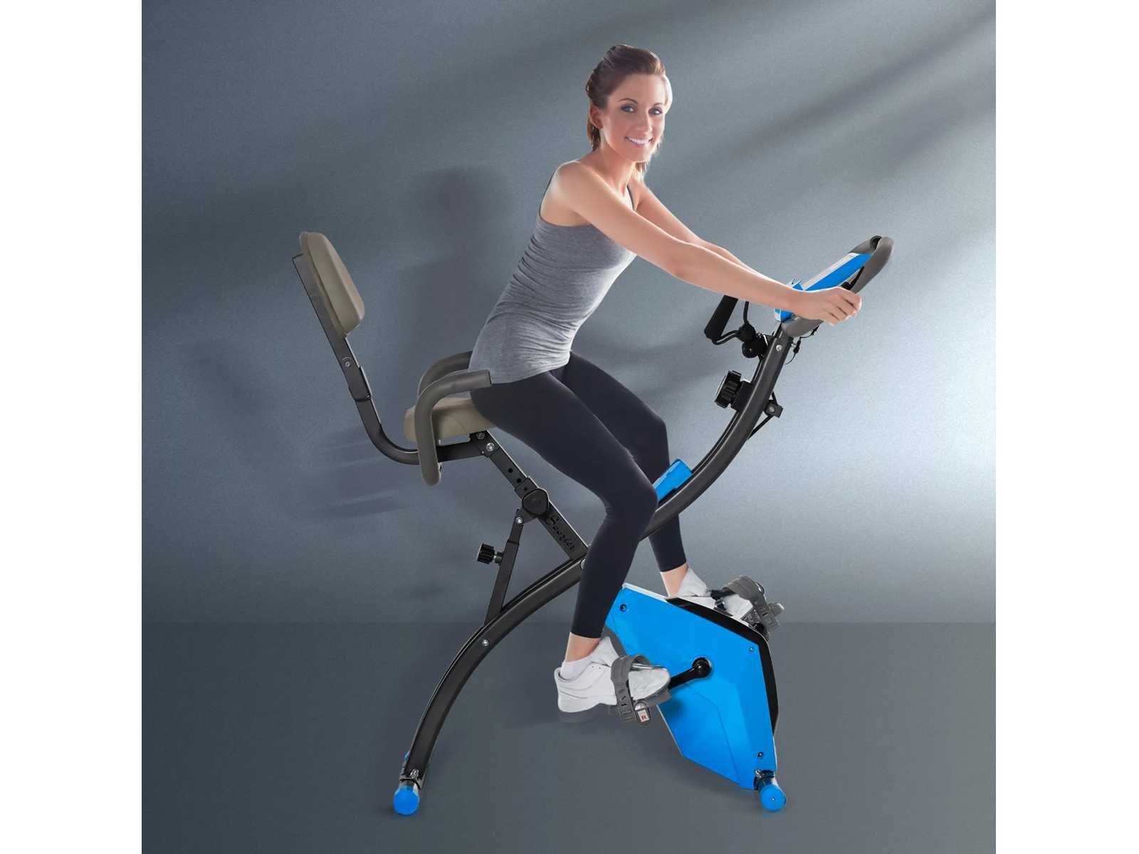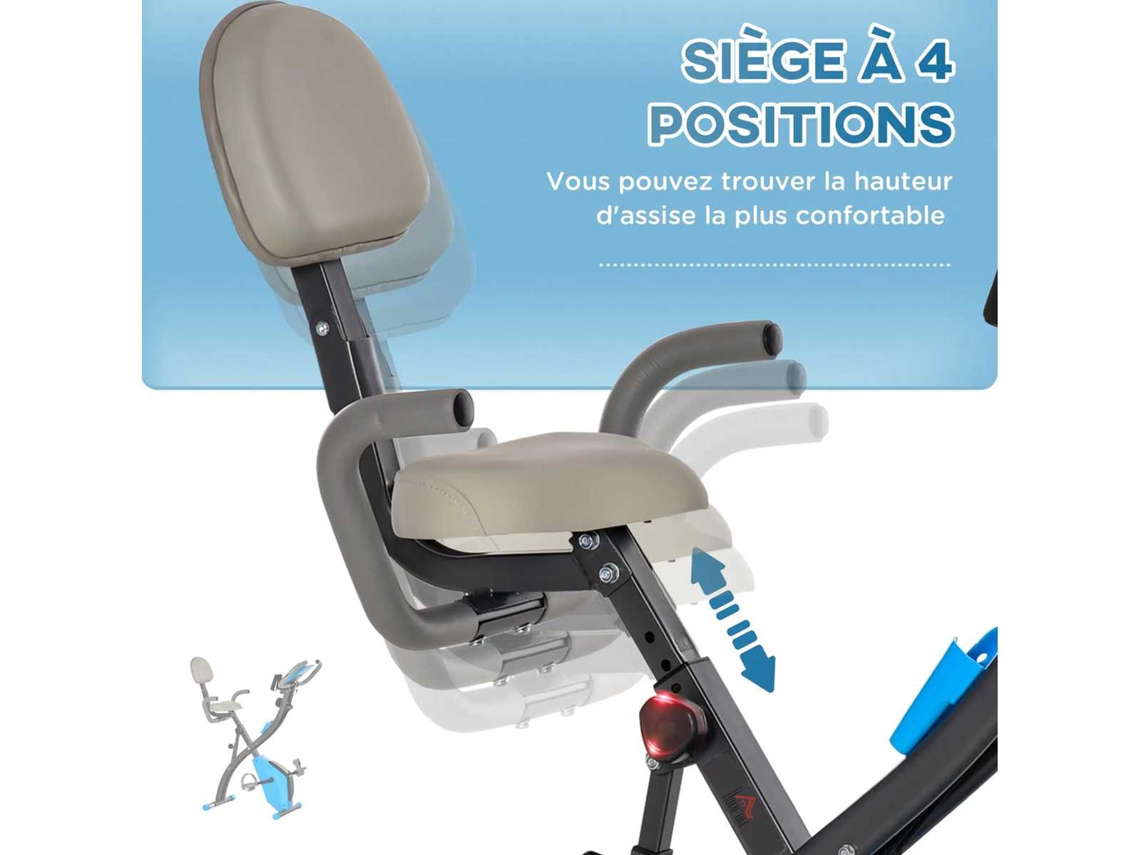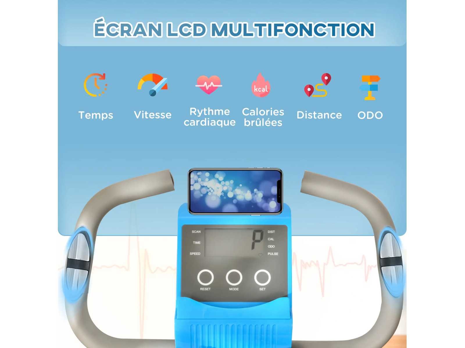 Spécifications: - Couleurs : bleu, gris - Matériaux : acier, ABS - Dim. totales : 105L x 48l x 118H cm - Dim. pliées : 50L x 48I x 135H cm - Dim. selle : 27L x 23I x 73-90H cm - Dim. dossier : 23L x 20l cm - Dim. écran LCD : 21L x 15,5l cm - Hauteur accoudoirs : 115 cm (jusqu'à sol) - Dim. pédales : 12L x 9l cm - Ø châssis tubulaire : 3,8 cm - Volant d'inertie : 2,5 kg - Piles requises : 2 x AAA, pas fournies - Certifications normes CE-EMC, RoHS, EN20957-1-5 - Charge max. recommandée : 120 Kg Non