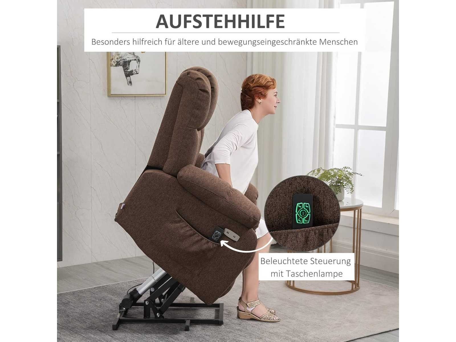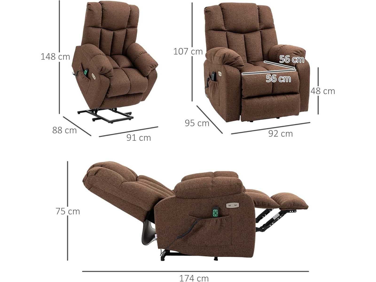 Fauteuil 2 en 1 avec fonction inclinable, convient aux personnes âgées et aux personnes souffrant de problèmes physiques Le repose-pieds intégré vous permet d'étirer les jambes et de prendre une posture détendue Ressorts ensachés pour une assise douce et confortable Mousse haute densité et housse douce pour la peau offrant un confort élevé Poche latérale spacieuse pour ranger la manette et d'autres objets importants Particulièrement confortable et pratique : 2 ports de charge USB intégrés La livraison comprend une télécommande filaire et un sac de rangement pratique ; Assemblage requis Couleur : noir Couleur : marron Matériau et matériau Polyester imitation lin, acier Dimensions totales (droit) 92L x 95l x 107H cm Dimensions position allongée : 92L x 174l x 75H cm Dimensions lors du levage 91L x 88l x 148H cm Dimensions du siège : 56L x 56l x 48H cm Tension d'entrée : 100-240 V - 50/60 Hz Tension de sortie : 29 V/58 W Longueur du câble d'alimentation : 1,5 m Charge maximale : environ 120 kg Non