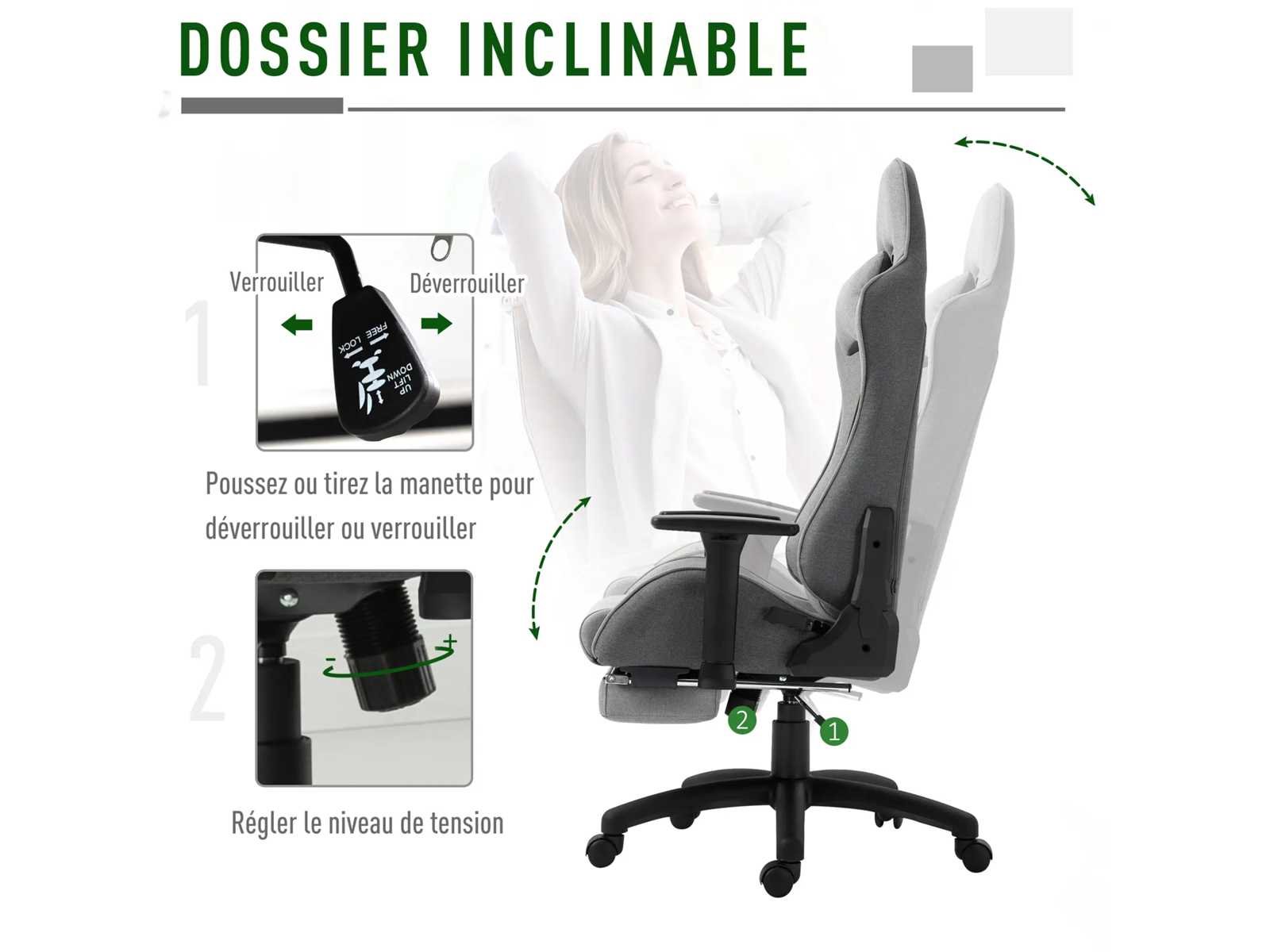 Spécifications: - Couleur : gris - Matériaux : lin, garnissage mousse, PP, nylon - Dim. totales : 73l x 57P x 127-135H cm - Dim. position allongée : 73l x 160P x 80-88H cm - Inclinaison maximale : 150° - Dim. assise : 55,5l x 54P x 44-51,5H cm - Dim. dossier : 54l x 86H cm - Dim. accoudoirs : 9l x 18-25H cm ( juasqu'à assise) - Dim. reposepieds : 30L x 19l cm - Écartement réglable de l'accoudoir (avant et arrière) : 07 cm - Angle réglable de l'accoudoir (gauche et droite) : 30° - Charge max. recommandée : 120 Kg Non