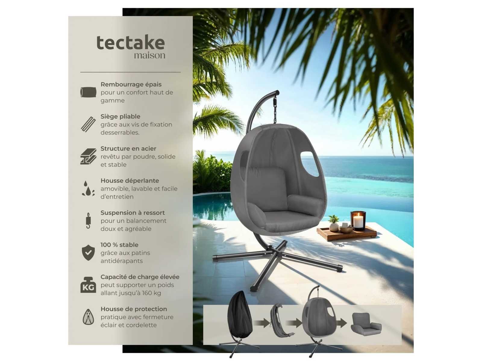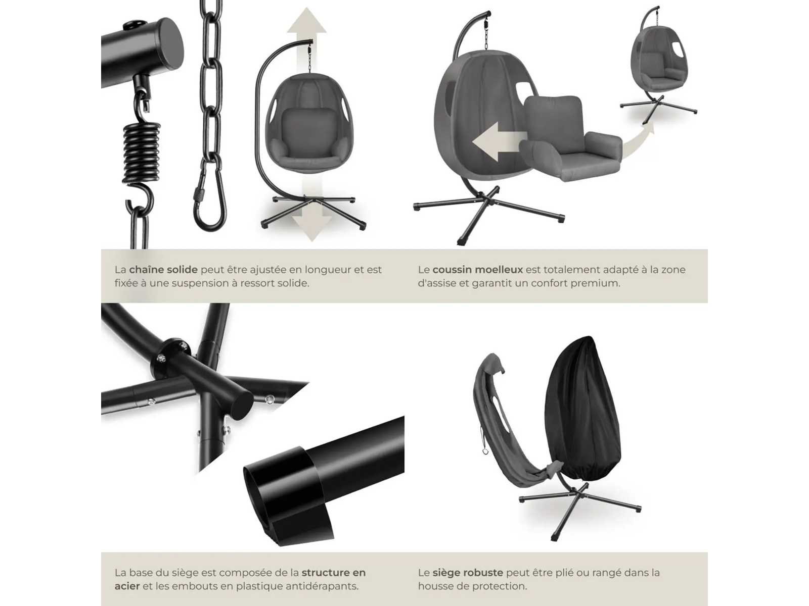 Dimensions totales (lxPxH) : env. 100 x 97 x 201 cm Nacelle (lxPxH) : env. 86 x 68 x 108 cm Coussin d'assise (lxPxH) : env. 57 x 49 x 6 cm Dossier (lxPxH) : env. 57 x 13 x 58 cm Accoudoirs latéraux (lxPxH) : env. 15 x 49 x 20 cm Hauteur d'assise : env. 50 - 68 cm Capacité de charge : 160 kg Poids : env. 23,3 kg Matériaux : acier laqué époxy, polyuréthane, polypropylène, 100 % polyester Non
