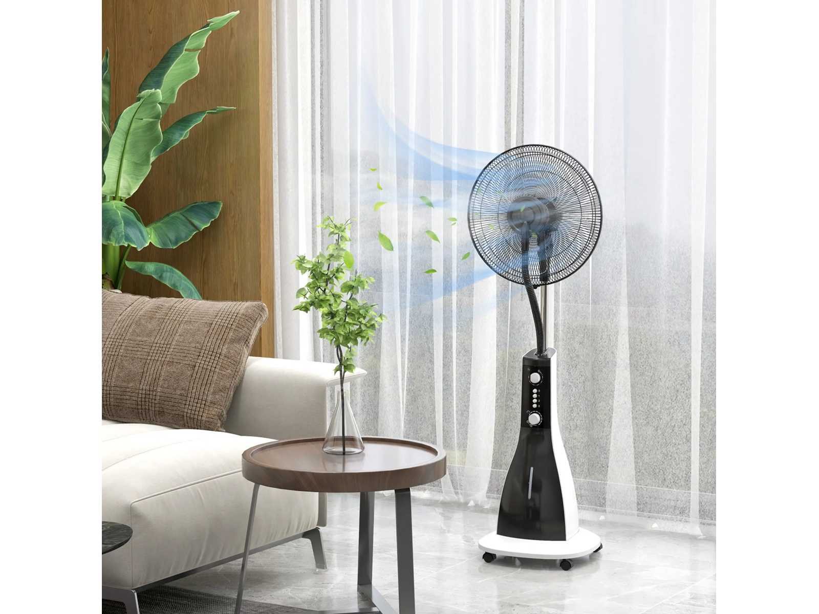 Spécifications: - Couleur: Noir - Matériel: Métal, ABS - Dimensions totales: 44,5L x 38,5l x 120H cm - Taille de la base: 38,5L x 38,5P cm - Longueur du câble: 1,6 m - Pulvérisation maximale: 220±20 mL/h - Vent max: 44,98 m³/min - Capacité du réservoir d'eau: 3 L - Bruit: 59,68 dB - Entrée: 220-240 V, 50 Hz - Puissance: 90W - 1 x Ventilateur sur Pied avec Brumisateur Non