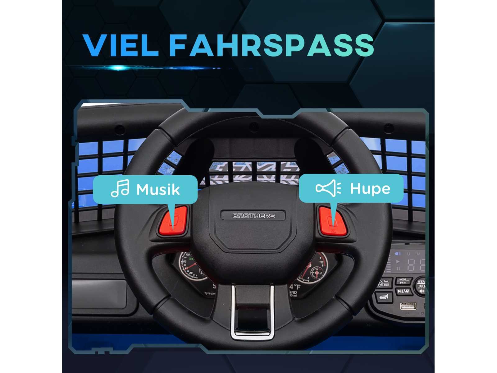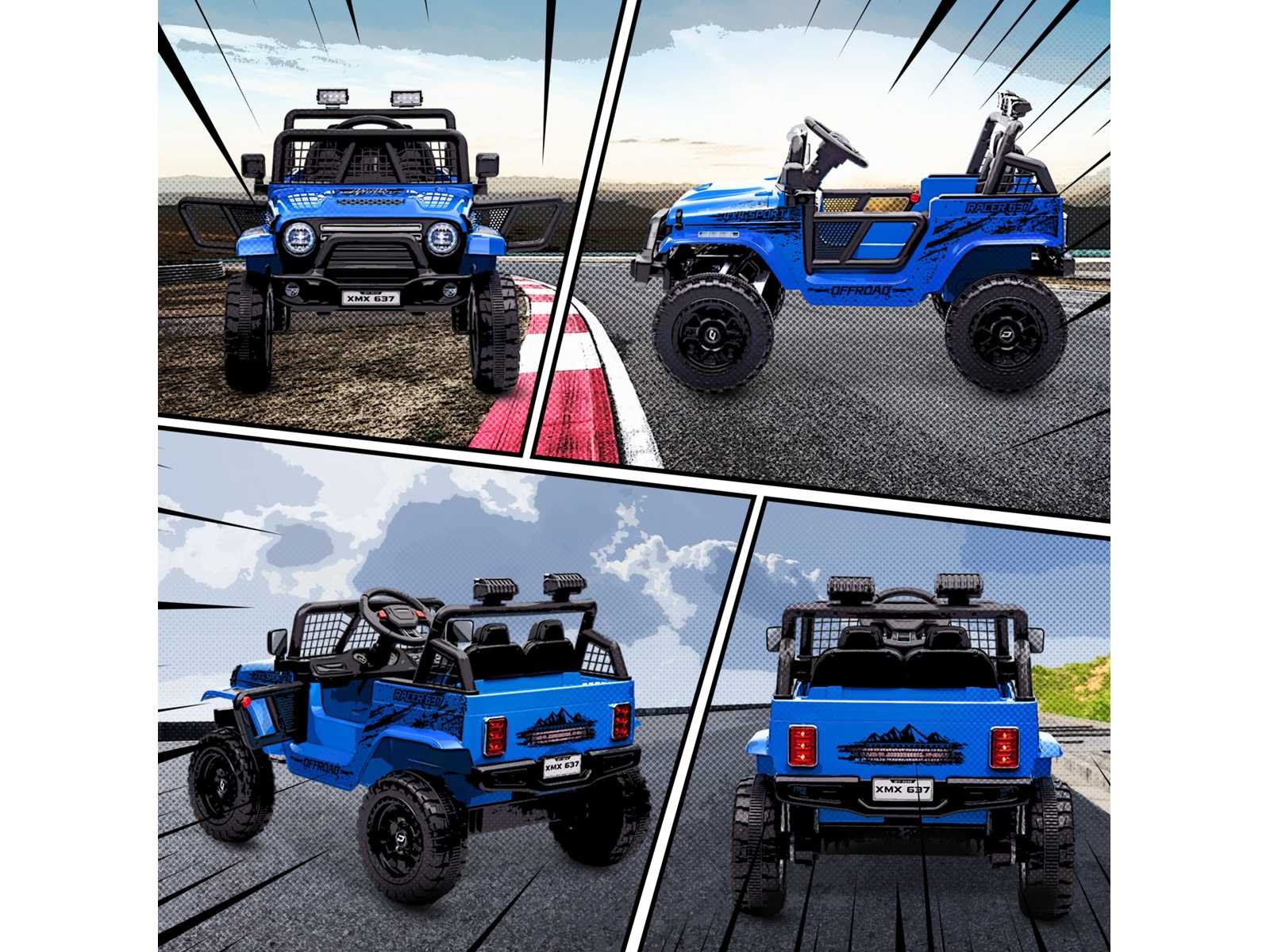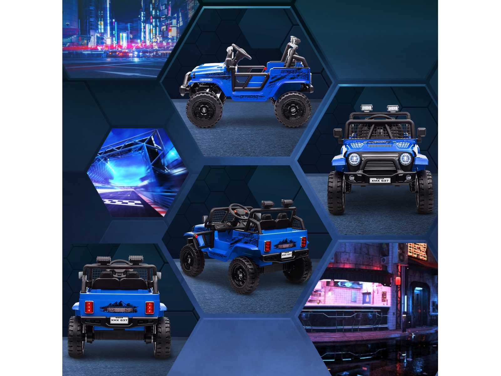 Spécifications: - Couleur : Bleu - Matériel : Plastique, métal - Dimensions totales : 109L x 67l x 68,5H cm - Taille du siège : 37L x 18P cm - Hauteur du siège : 35 cm (du sol) - Diamètre des roues : Ø28 cm - Rayon de la télécommande : = 15 m - Batterie : 12V 4,5AH - Moteur : 2 x 12V - Temps de charge : 8-10 heures (initiale). 8-12 heures (régulière) - Autonomie : 50 min - Vitesse : 3-5 km/h - Capacité de poids : 50 kg - Âge recommandé : 3-6 ans Non