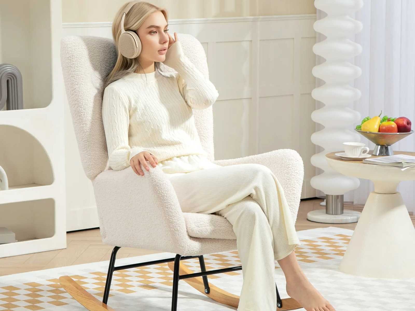 Fauteuil à bascule, revêtement pelucheux, rembourrage épais