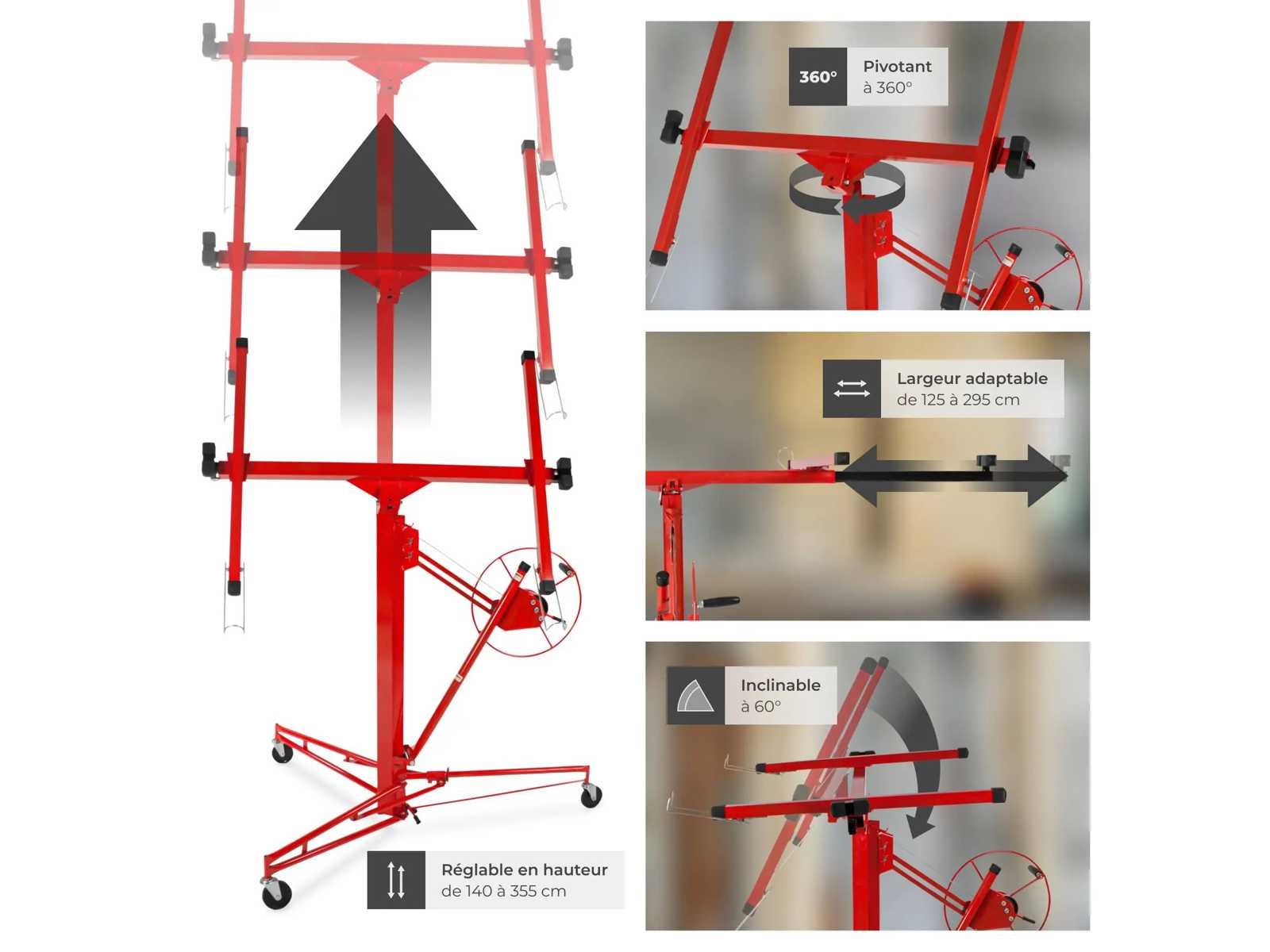 Dimensions dans la position normale (LxlxH) : environ 153 cm x 140 cm x 185 cm. Largeur minimum / maximum : environ 125 cm / environ 295 cm. Hauteur minimum / maximum : environ 140 cm / environ 335 cm. Hauteur minimum du bord inférieur de la plaque en position verticale maximale : environ 90 cm. Hauteur maximum du bord inférieur de la plaque en position verticale maximale : environ 290 cm. Charge utile jusqu'à 68 kg. Poids : environ 42 kg Matière : Acier. Non