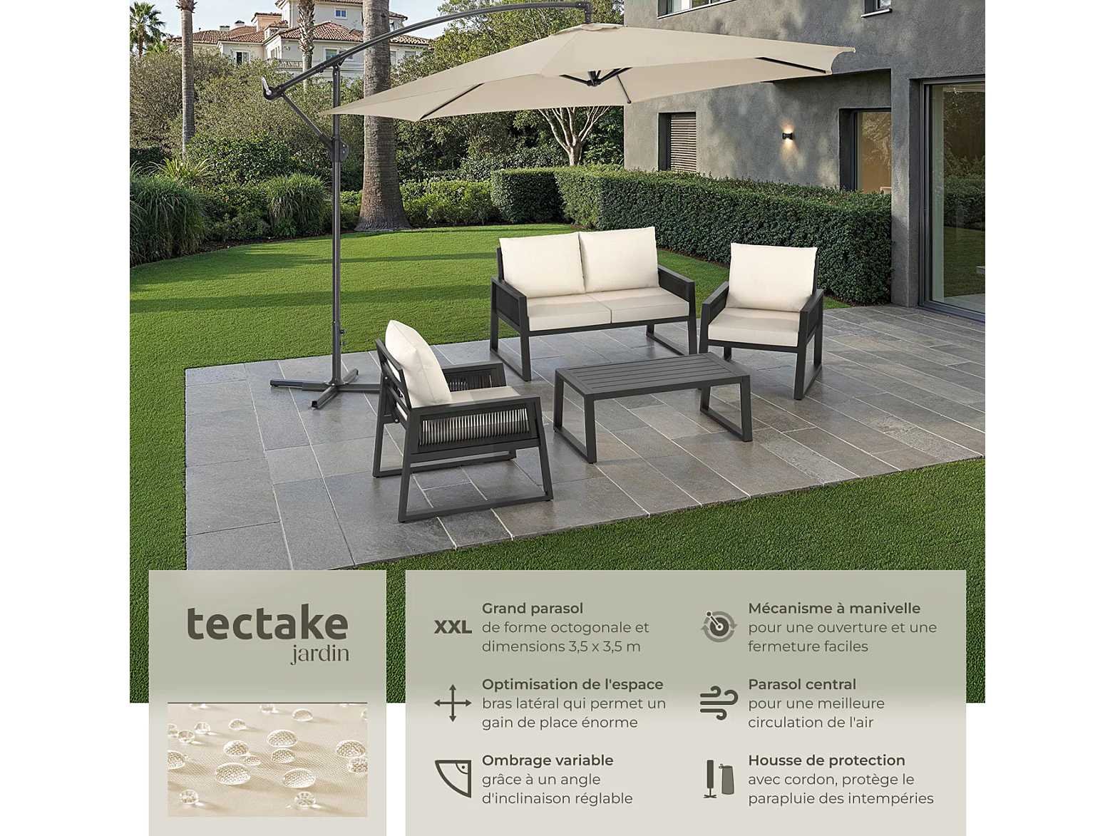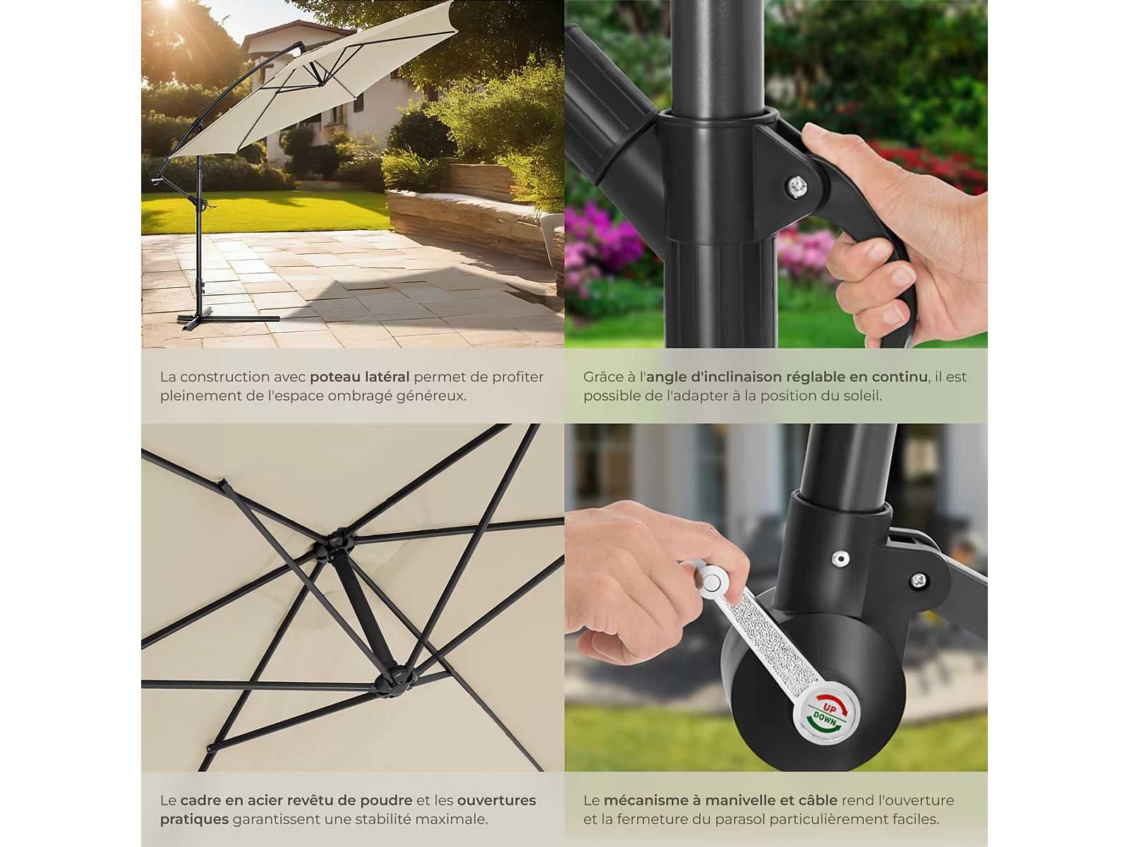 Protection contre les UV. Parasol excentré : 3,5 m de diamètre. L'angle d'inclinaison du parasol est orientable en continu. Ouverture et fermeture par manivelle. Coloris : Structure grise Petites ouvertures d'aération (à 20 cm de la pointe). Housse de protection incluse avec cordelette de serrage pour fixation. Pied : 1 x 1 mètre. Hauteur parasol déplié : 2,60 m. Hauteur parasol fermé : 2,90 m. Diamètre du tube : 5,4 cm. Diamètre du parasol : 3,5 m. Poids : 12,5 kg. Matériaux : Structure : métal Toile : 100% Polyester. 1 Parasol. 1 Base parasol. 1 Pied parasol. Non
