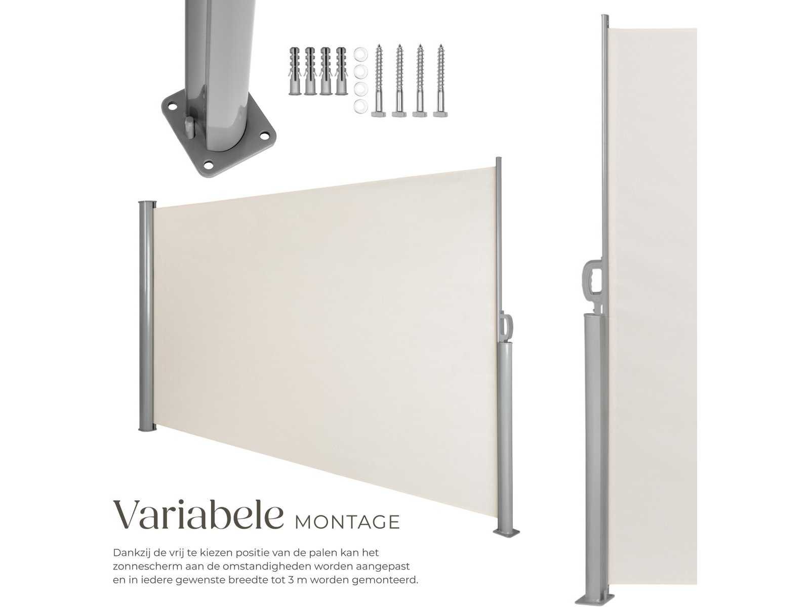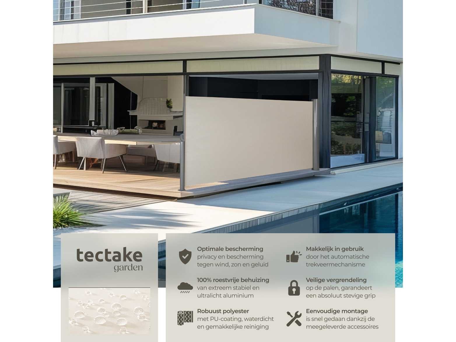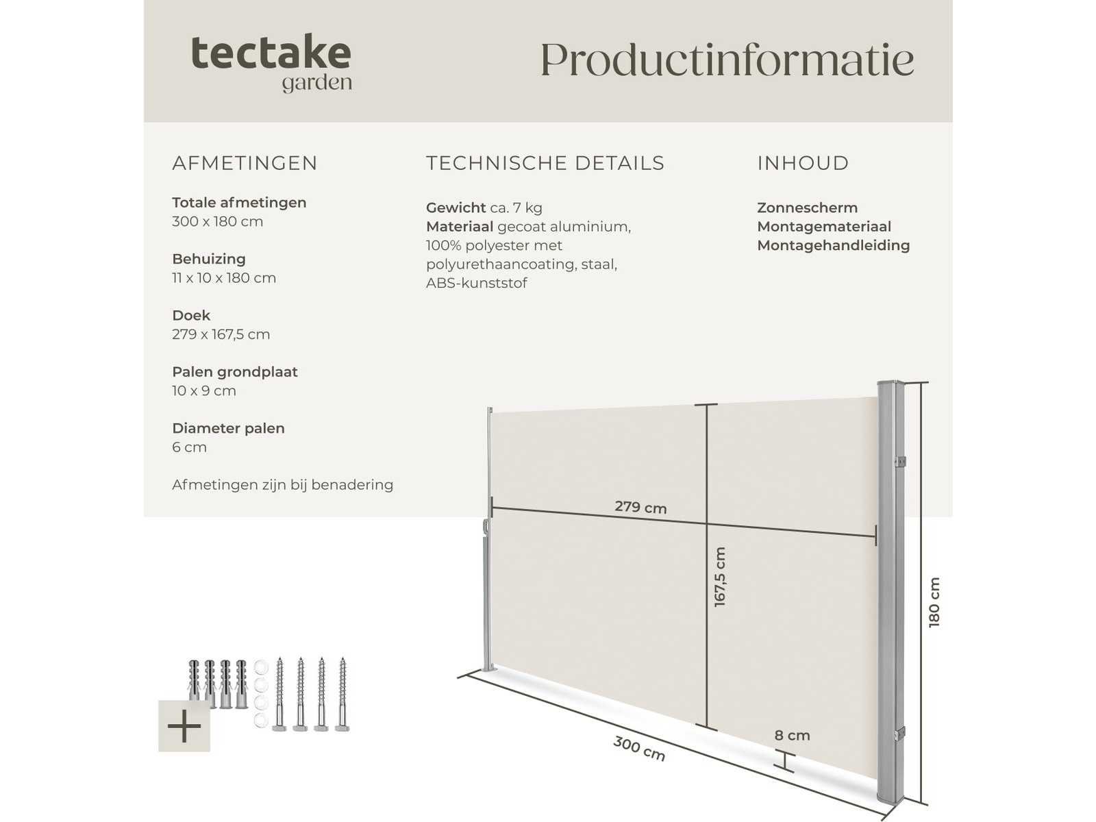 Détails techniques: Dimensions totales une fois sorti (LxH): max.300 cm x 180 cm (boîtier inclus) Dimensions boîtier (LxlxH): 11 x 10 x 180 cm Dimensions des poteaux de la plaque de base (Lxl): 10 x 9 cm Diamètre des poteaux: Ø 60 mm Dimensions de le tissu (LxH): environ 279 x 167,5 cm Hauteur du tissu à partir du sol: environ 8 cm Poids: 7 kg Matériau: tissu de composition textile 100% polyester (240 g / m²), revêtement PU, boîtier d'écran et poteaux de support en revêtement par poudre aluminium, éléments en plastique Non