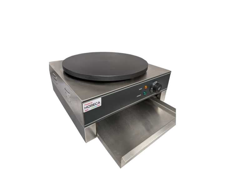 The Simple GDCG811, een professionele elektrische crêpemaker die ideaal is voor koks die elke keer heerlijke en uniforme pannenkoeken willen bereiden. Met een gietijzeren plaat voor perfect gouden pannenkoeken en 3000W vermogen voor snelle verwarming, combineert deze crêpemaker prestaties en eenvoud. De roestvrijstalen behuizing zorgt voor uitzonderlijke duurzaamheid, terwijl de instelbare temperatuur zorgt voor kookprecisie die op jouw wensen is afgestemd. Ideaal voor het maken van een grote verscheidenheid aan culinaire creaties, van gastronomische ontbijten tot verfijnde desserts. Eenvoudig in gebruik, is deze crêpemaker geschikt voor zowel amateurs als professionals. De standaardmaat van 450 x 470 x 230 mm en een bakplaatdiameter van 400 mm maken het een ideale keuze voor alle voorbereidingen. Non Merk: Matériel Horeca Model: Crêpière Electrique professionnelle simple 3000 W Lengte: 45cm Breedte: 47cm Hoogte: 23cm Materiaal: Roestvrij Staal / Plaat: Gietijzer