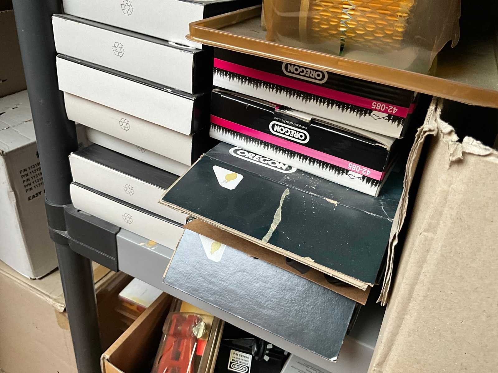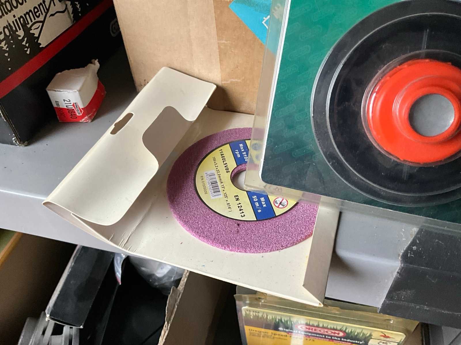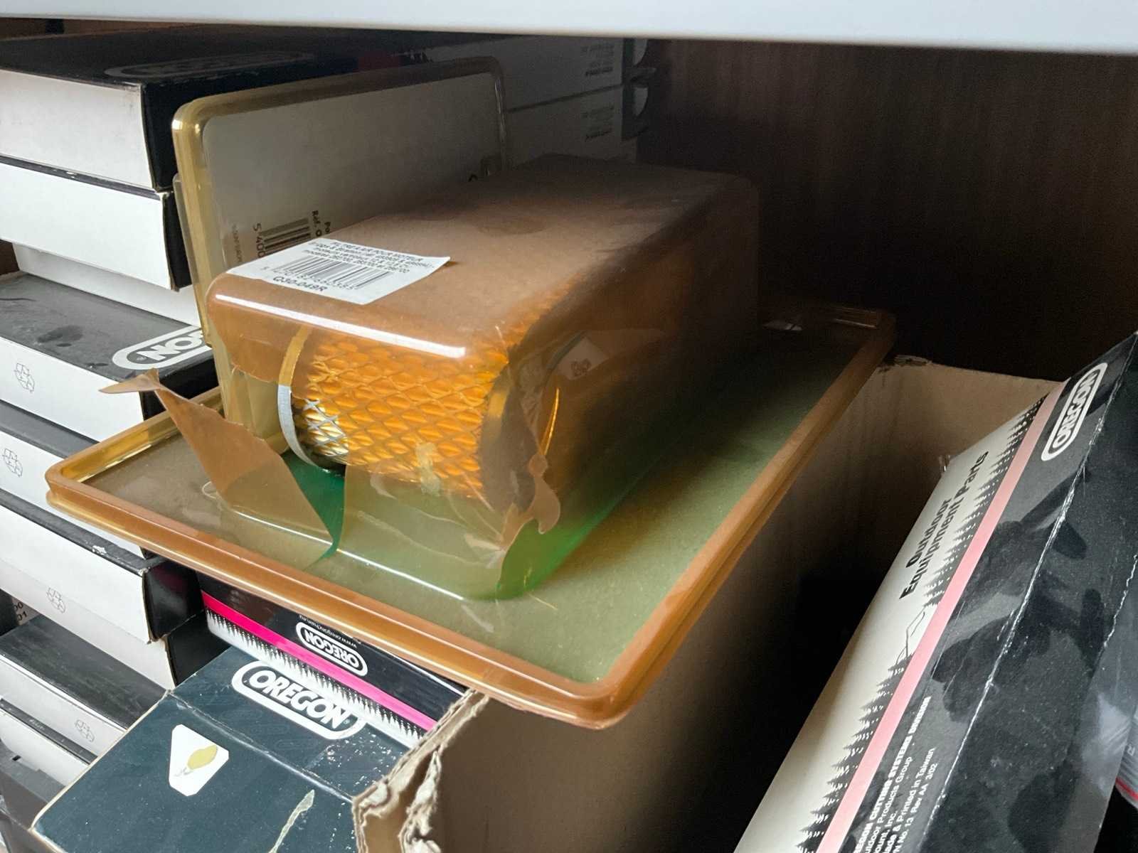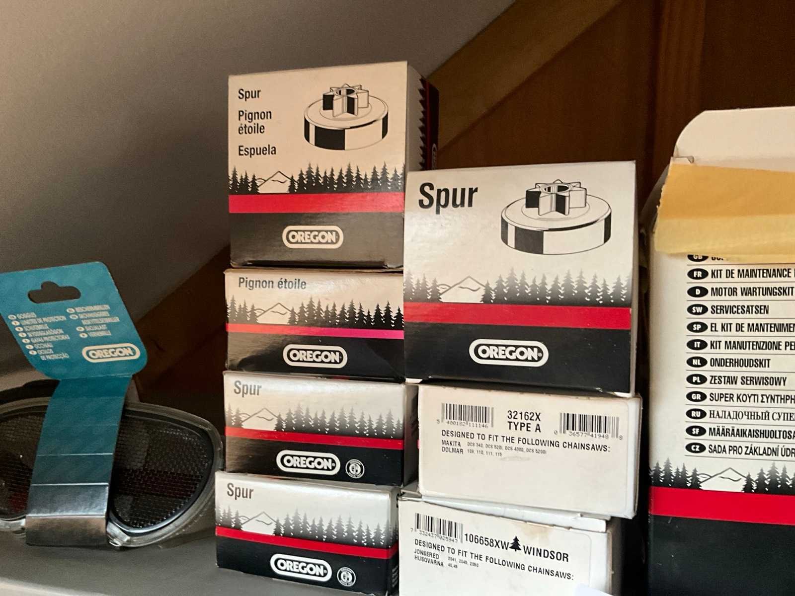 Grote partij diverse accesoires voor kettingzaag en bosmaaier waaronder diverse filters, diverse kabels, diverse maaikoppen en maaikopdraad, kettinzaagvijlen, geleidercorrecties, elektrische zaagbladslijpers, afgifte volgens aanwijzing Nee
