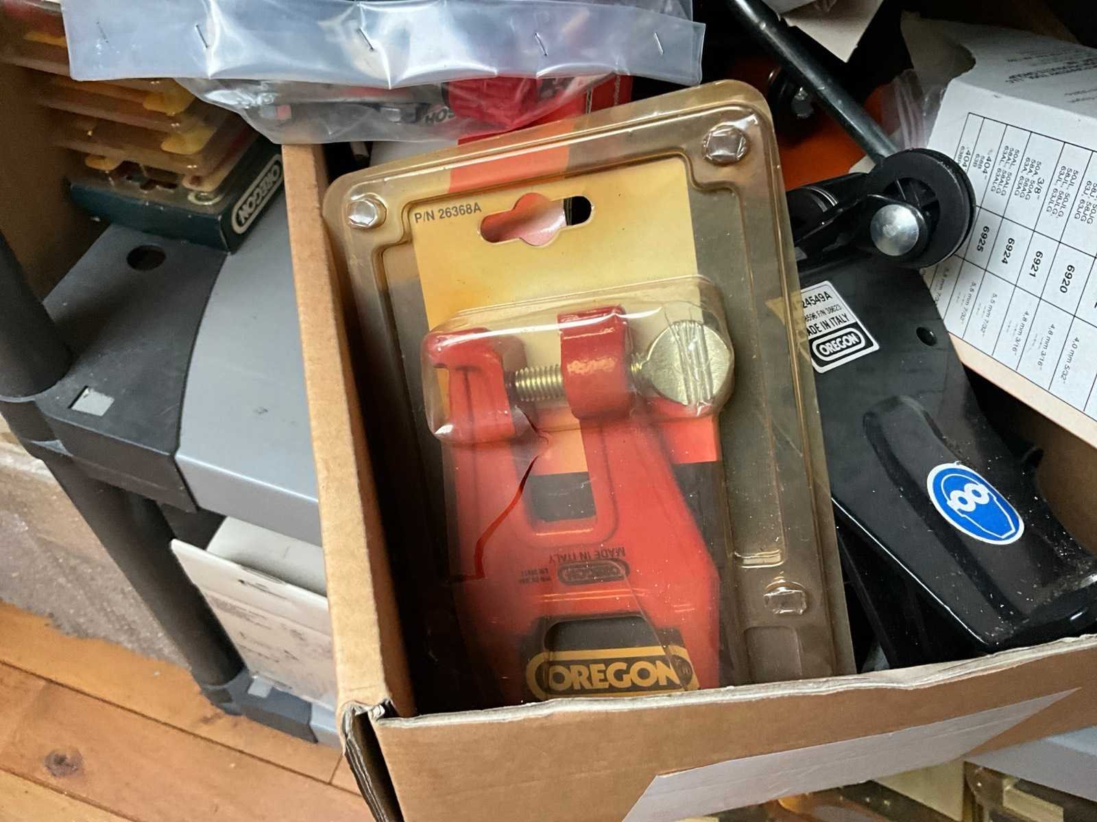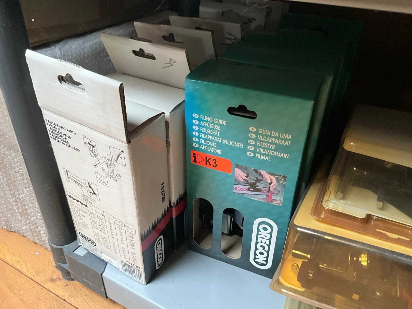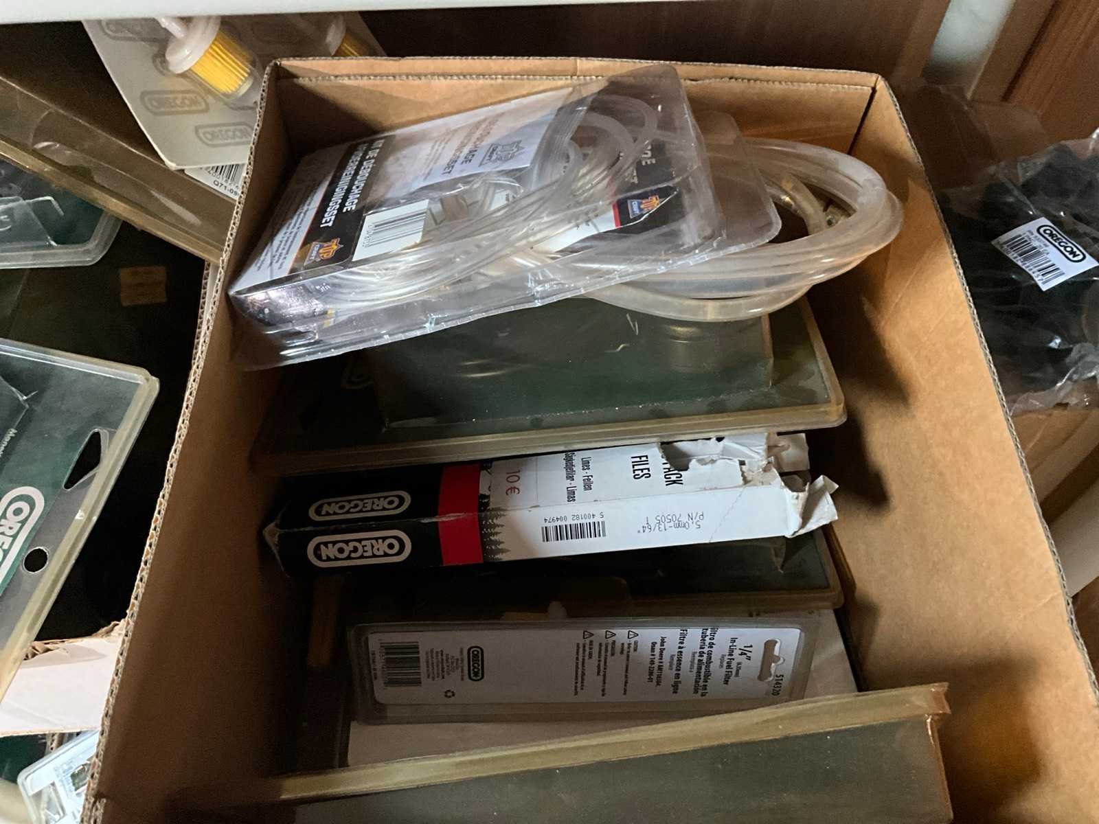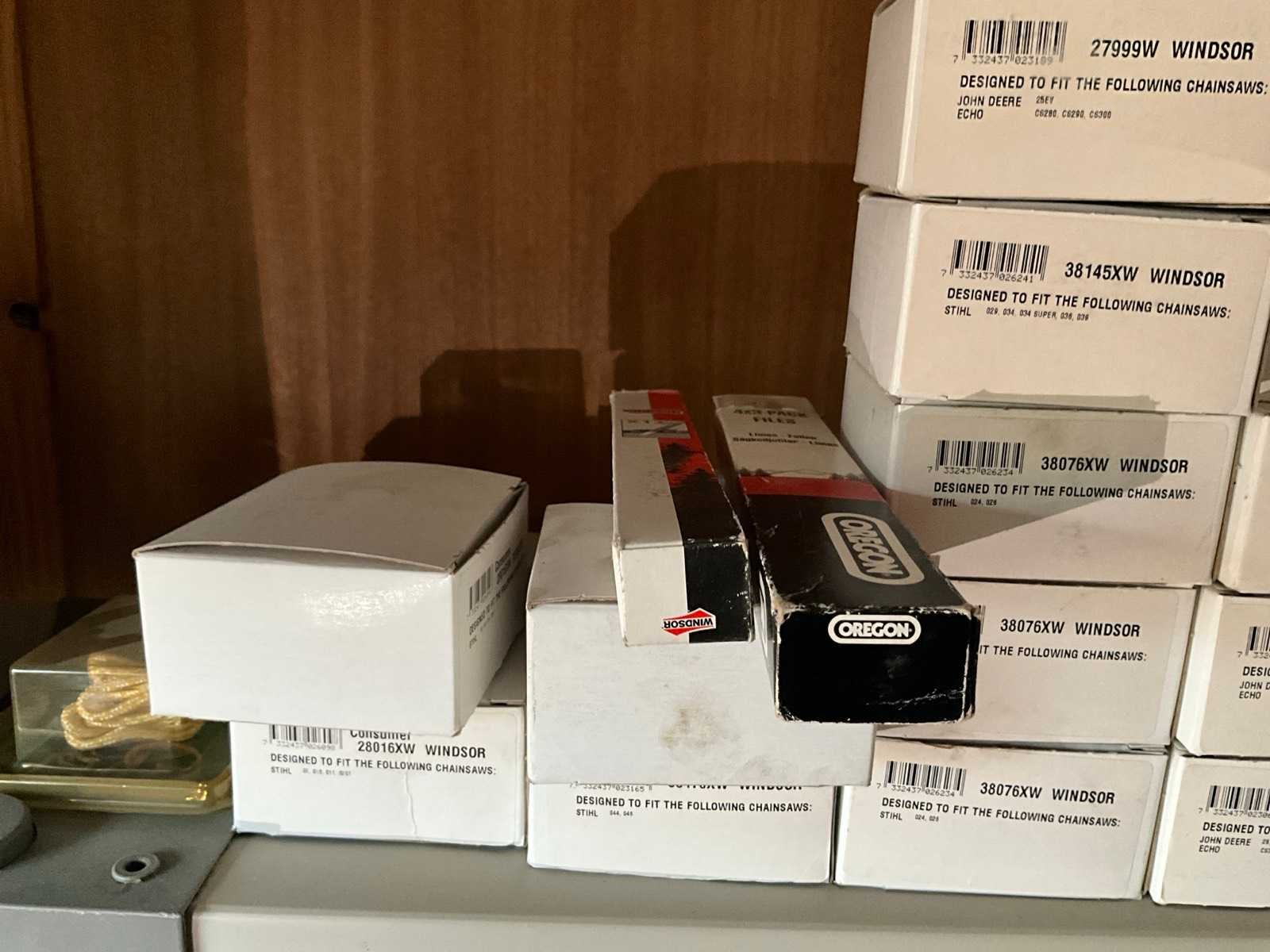 Grote partij diverse accesoires voor kettingzaag en bosmaaier waaronder diverse filters, diverse kabels, diverse maaikoppen en maaikopdraad, kettinzaagvijlen, geleidercorrecties, elektrische zaagbladslijpers, afgifte volgens aanwijzing Nee