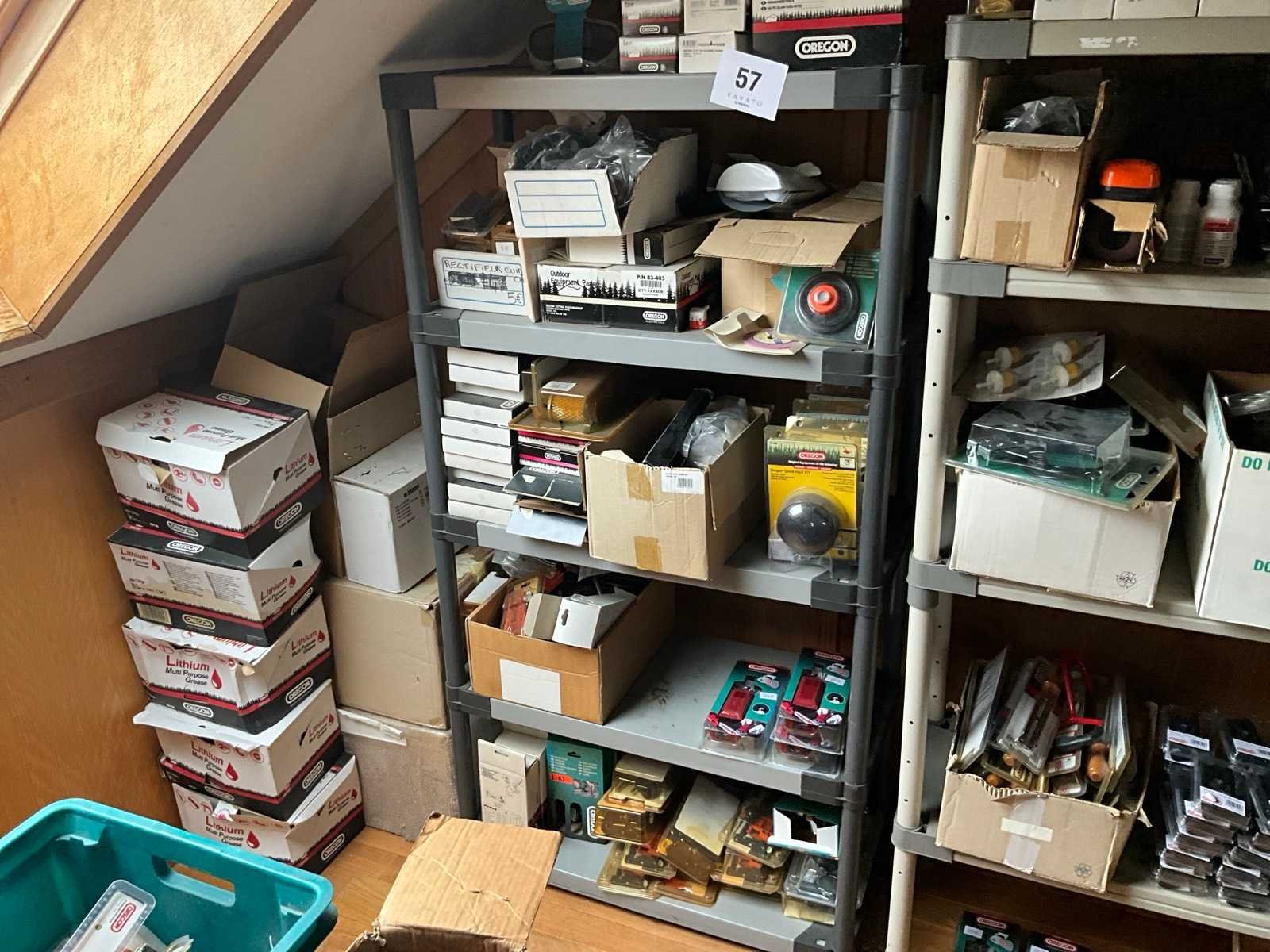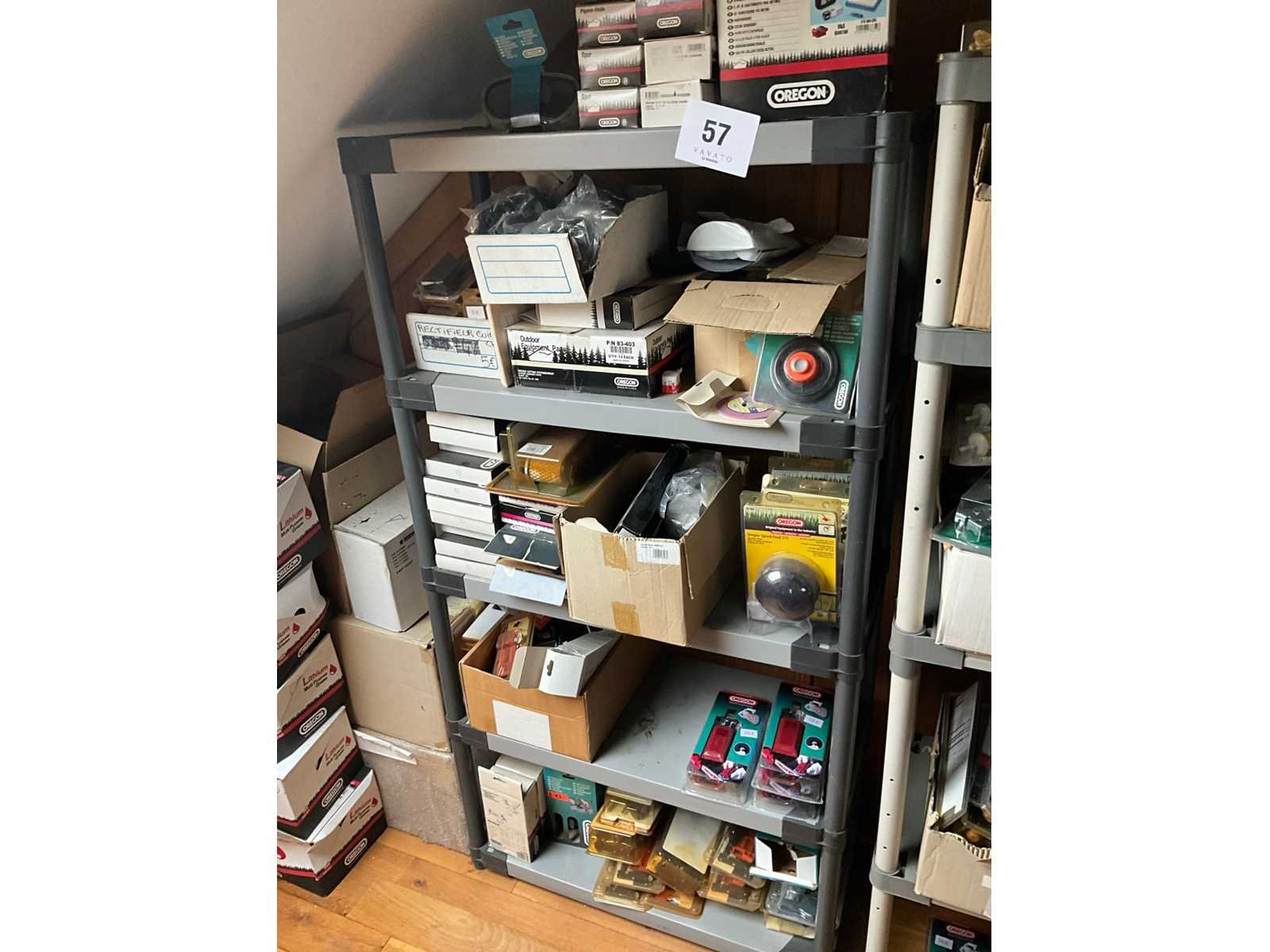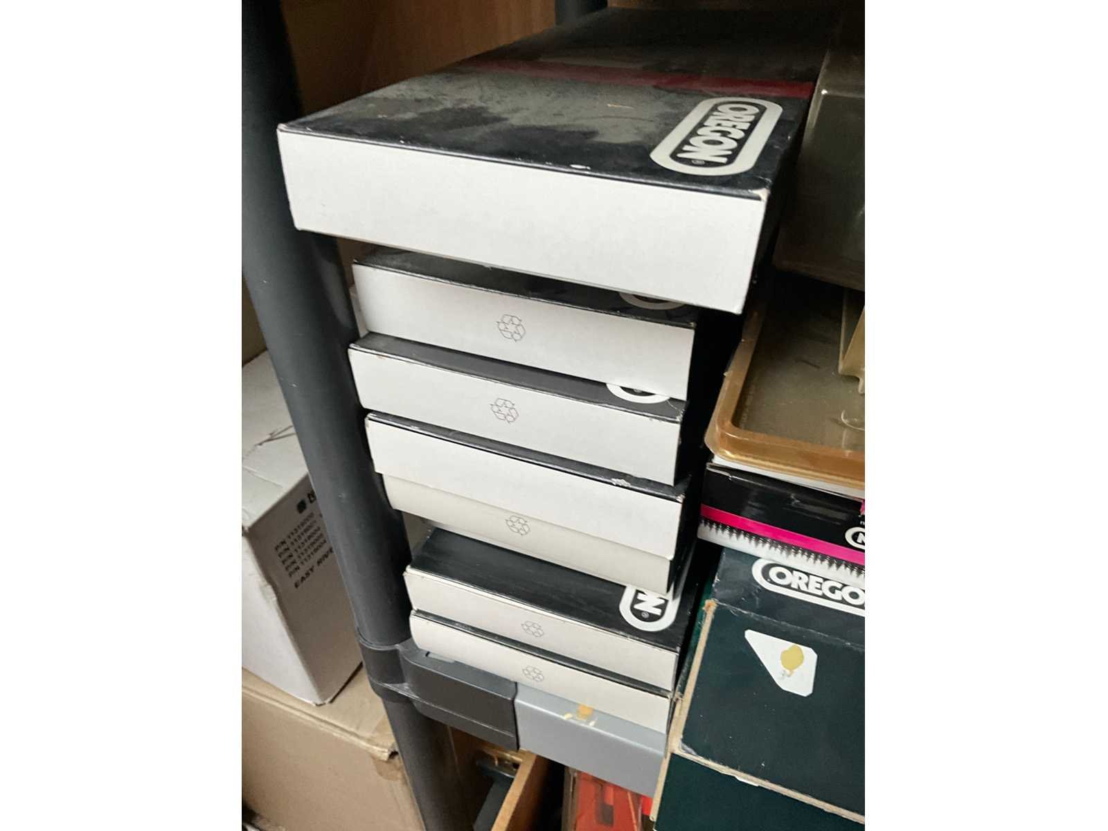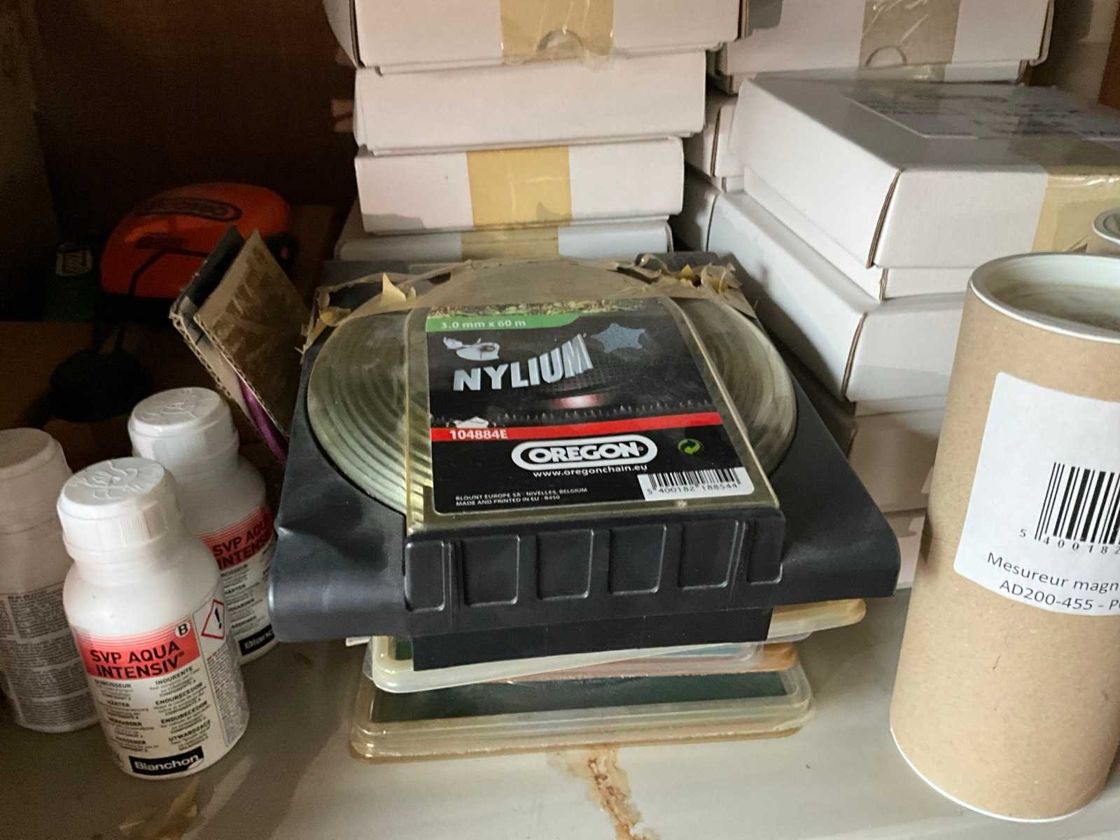 Grote partij diverse accesoires voor kettingzaag en bosmaaier waaronder diverse filters, diverse kabels, diverse maaikoppen en maaikopdraad, kettinzaagvijlen, geleidercorrecties, elektrische zaagbladslijpers, afgifte volgens aanwijzing Nee