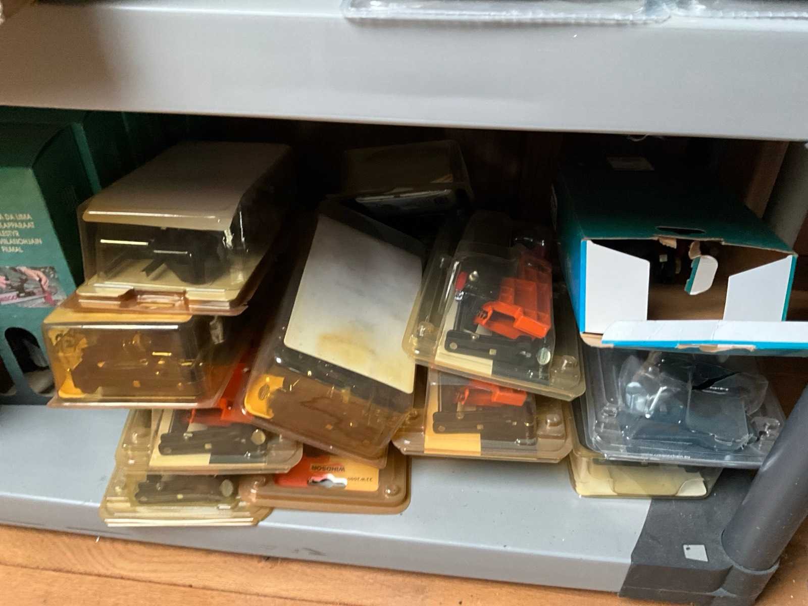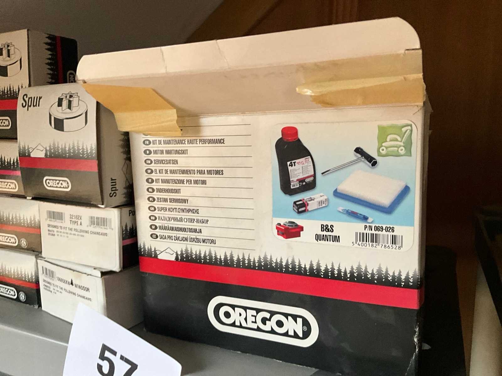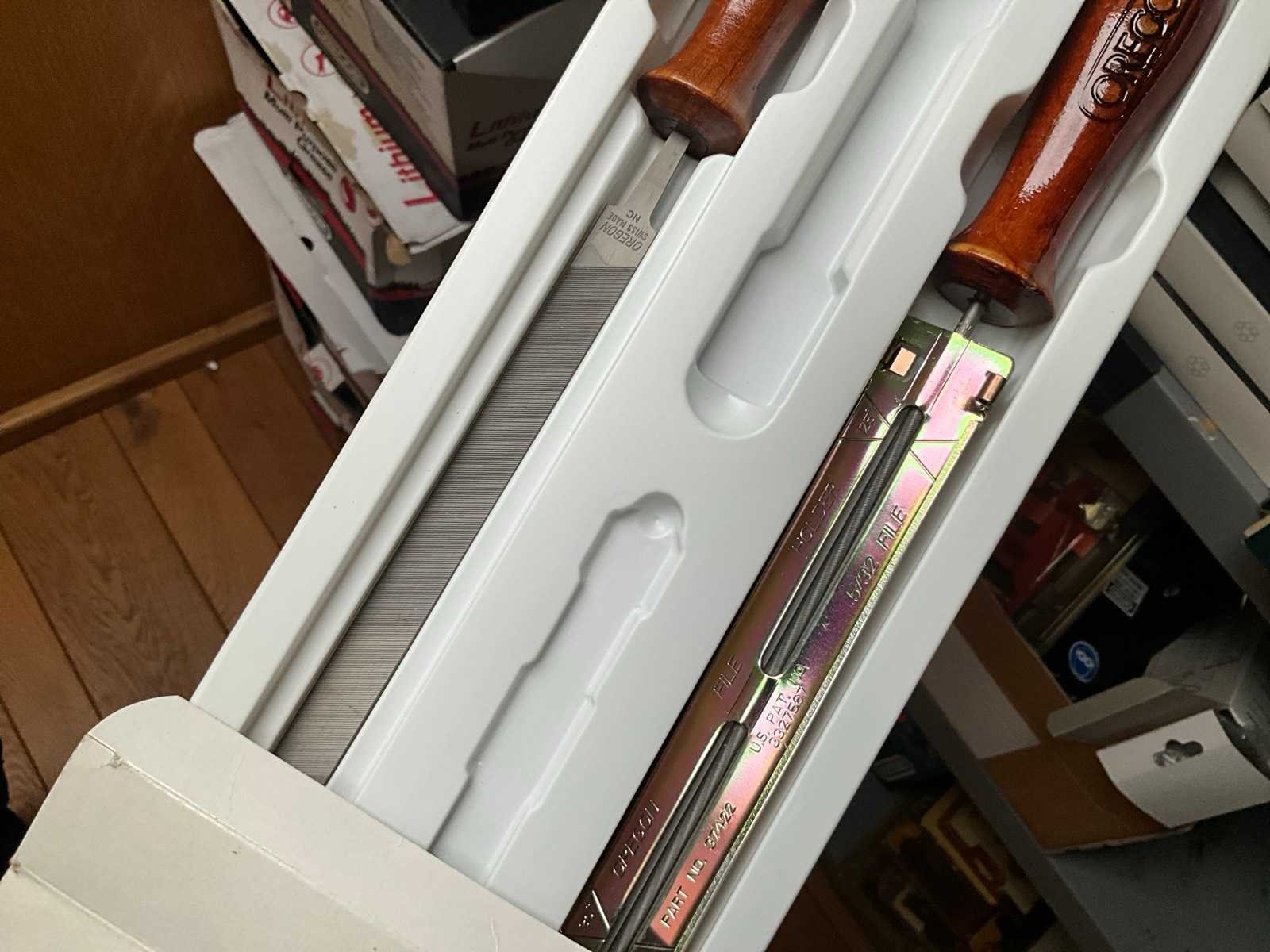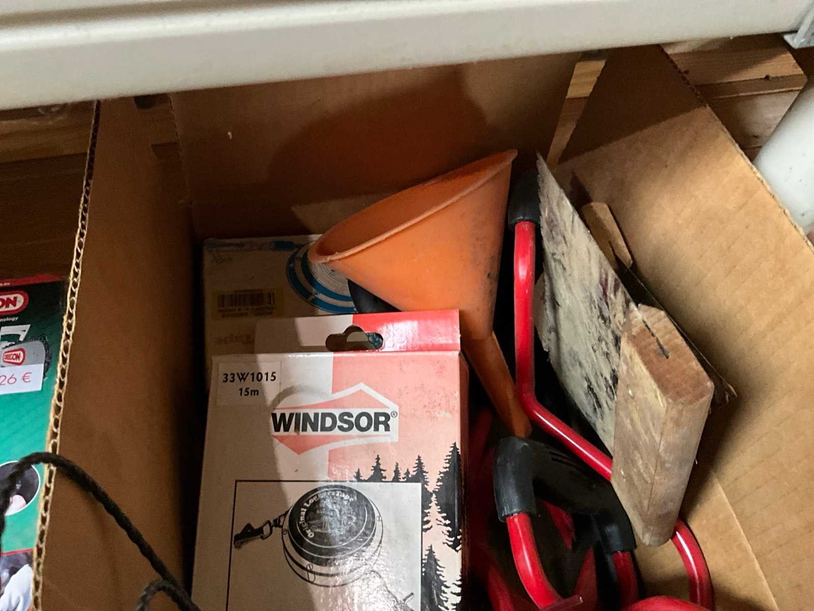 Grote partij diverse accesoires voor kettingzaag en bosmaaier waaronder diverse filters, diverse kabels, diverse maaikoppen en maaikopdraad, kettinzaagvijlen, geleidercorrecties, elektrische zaagbladslijpers, afgifte volgens aanwijzing Nee