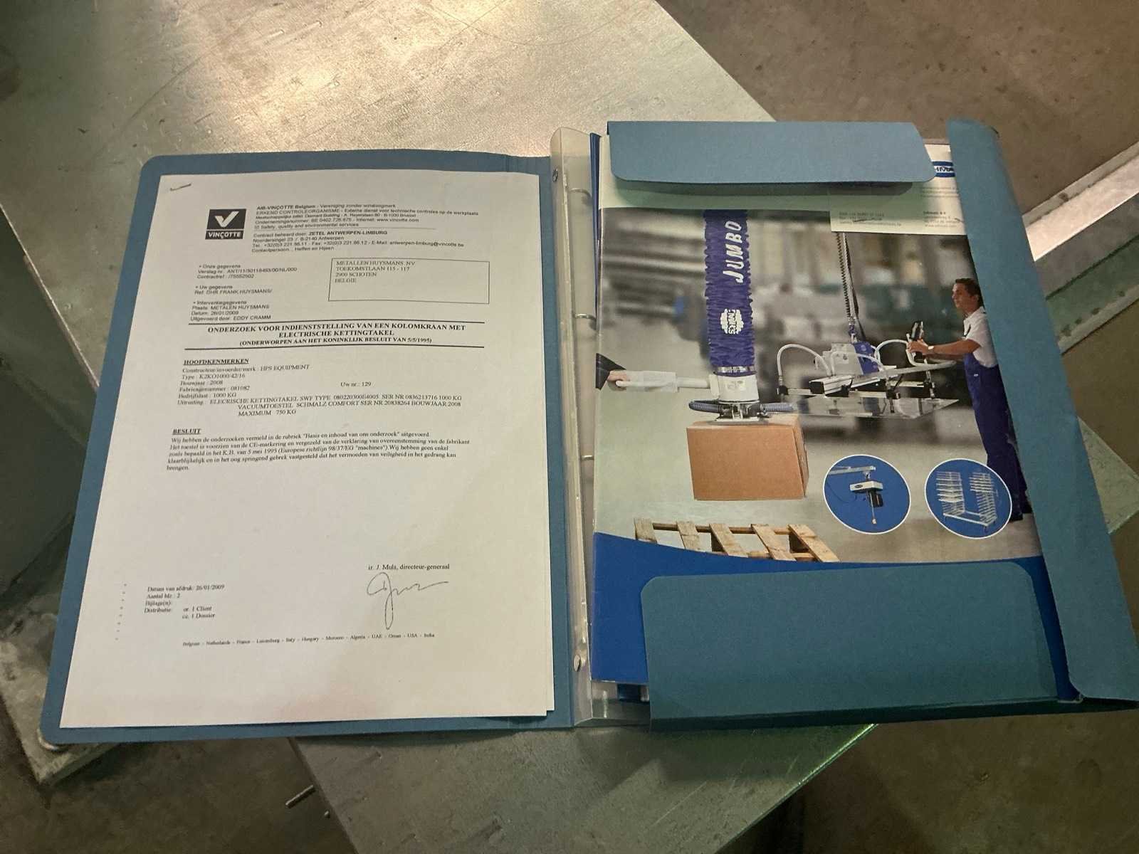 Uitgerust met elektrische kettingtakel SWF met een capaciteit van 1000kg/ inclusief vacuümheffer Schmalz type vacumaster Comfort met een capaciteit van 750 kg Nee Merk: HPS Equipment Type: K2KO1000 Bouwjaar: 2008 Hijsvermogen: 1000kg Armlengte: 4200mm Aansluiting: 380V Totale afmeting Hoogte: 3500mm
