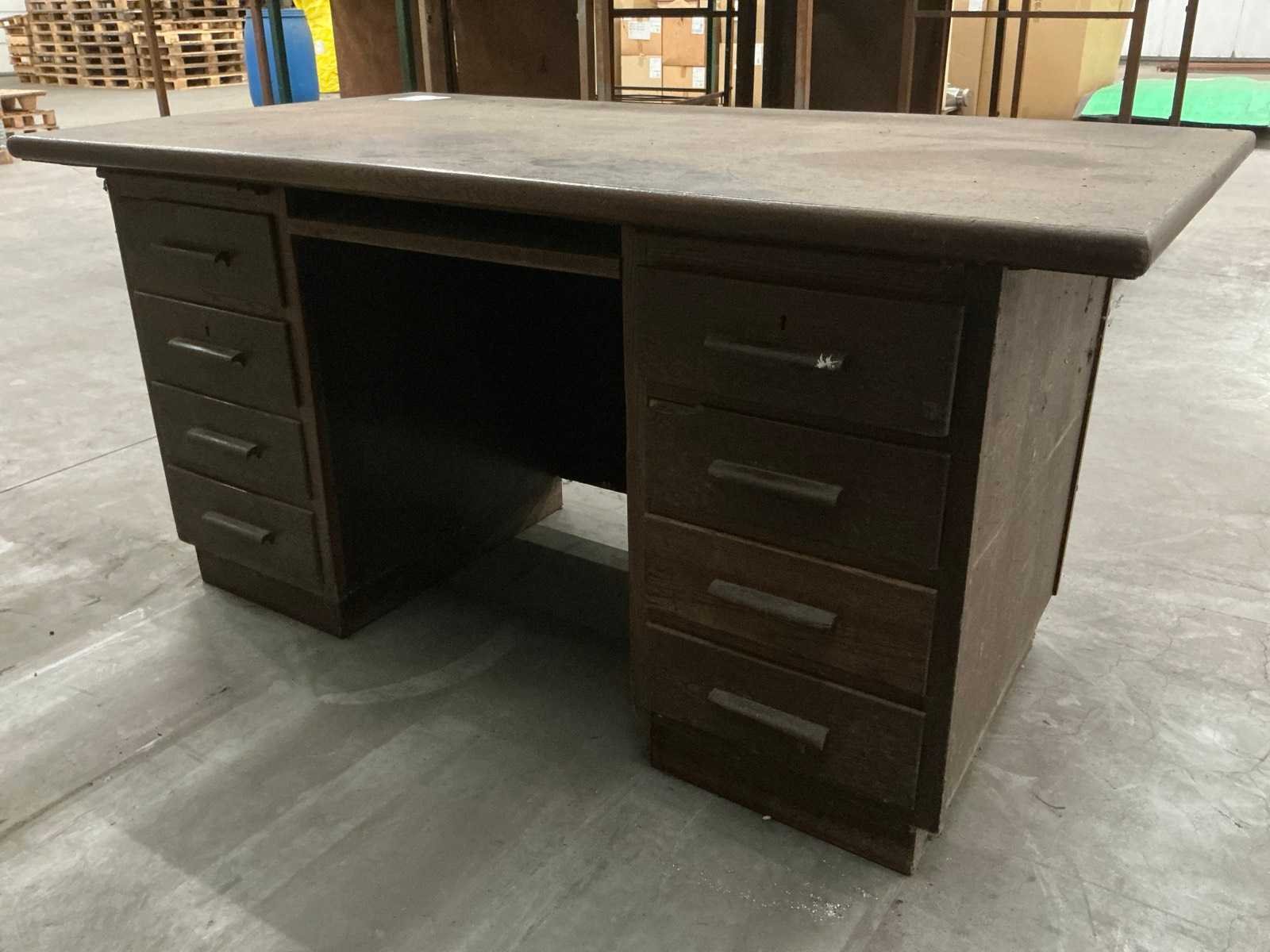 Voorzien van 8 laden, Compleet met stoffen typistestoel Nee Model: Vintage Kleur: Bruin Lengte: 160cm Breedte: 90cm Hoogte: 78cm Materiaal: Hout