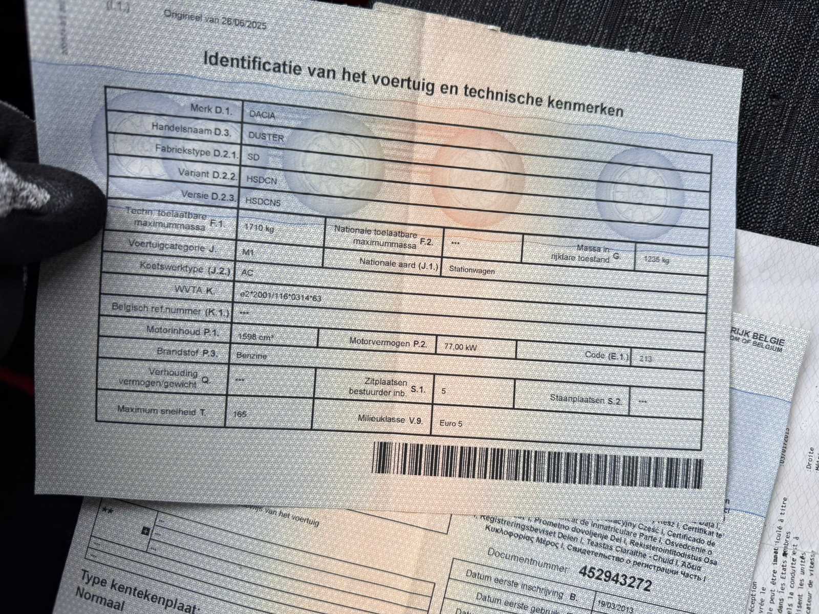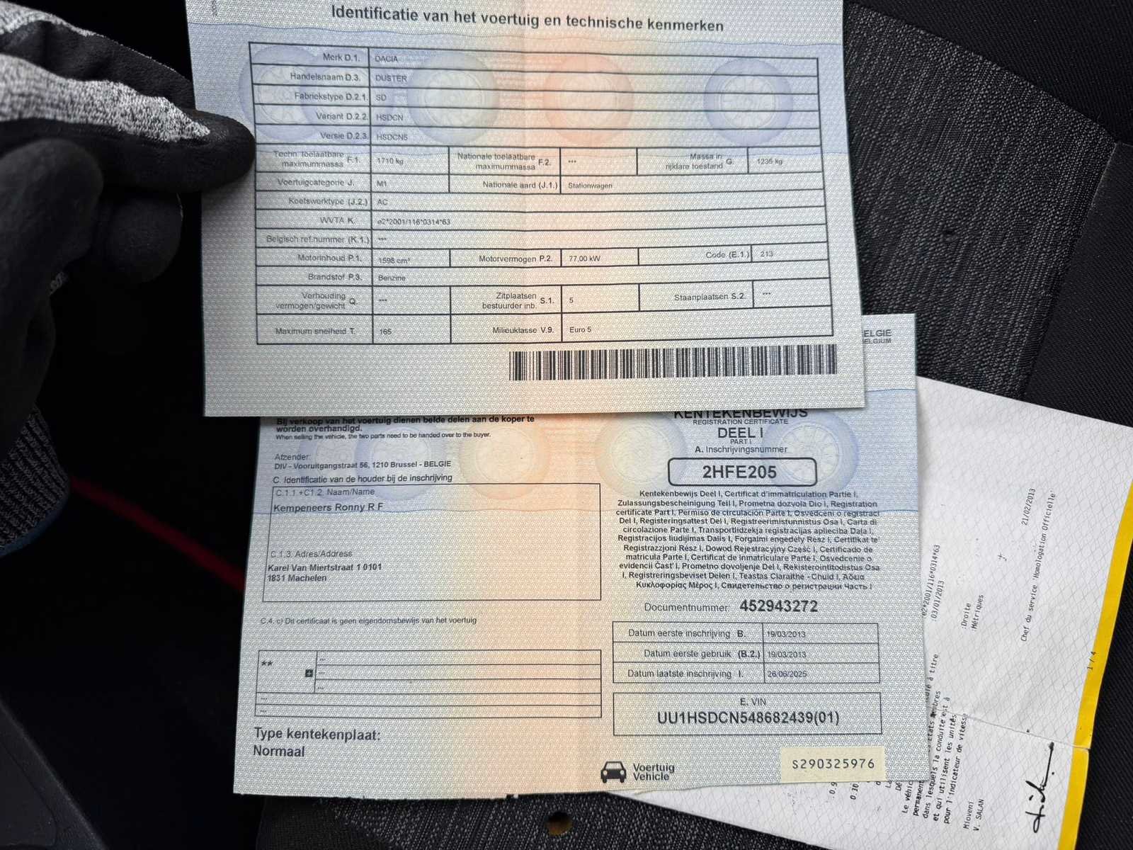 Dacia Duster van het bouwjaar 2013. De wagen start en rijdt zonder problemen. Zie foto’s voor alle details alsook de documenten. Nee Merk: Dacia Model: Duster Bouwjaar: 2013 Afgelezen kilometerstand: 186670km Cilinderinhoud: 1598cc Vermogen (kW): 77kW Brandstof: benzine Chassisnummer: UU1HSDCN548682439 Datum eerste toelating: 19/03/2013 Aantal zitplaatsen: 5 Kleur: Wit Transmissie: Handgeschakeld Nationaliteit documenten: België Start en rijdt: Ja Vavato voert geen technische keuring uit.: true Inschrijvingsbewijs - deel 1 : Aanwezig Inschrijvingsbewijs - deel 2: Aanwezig