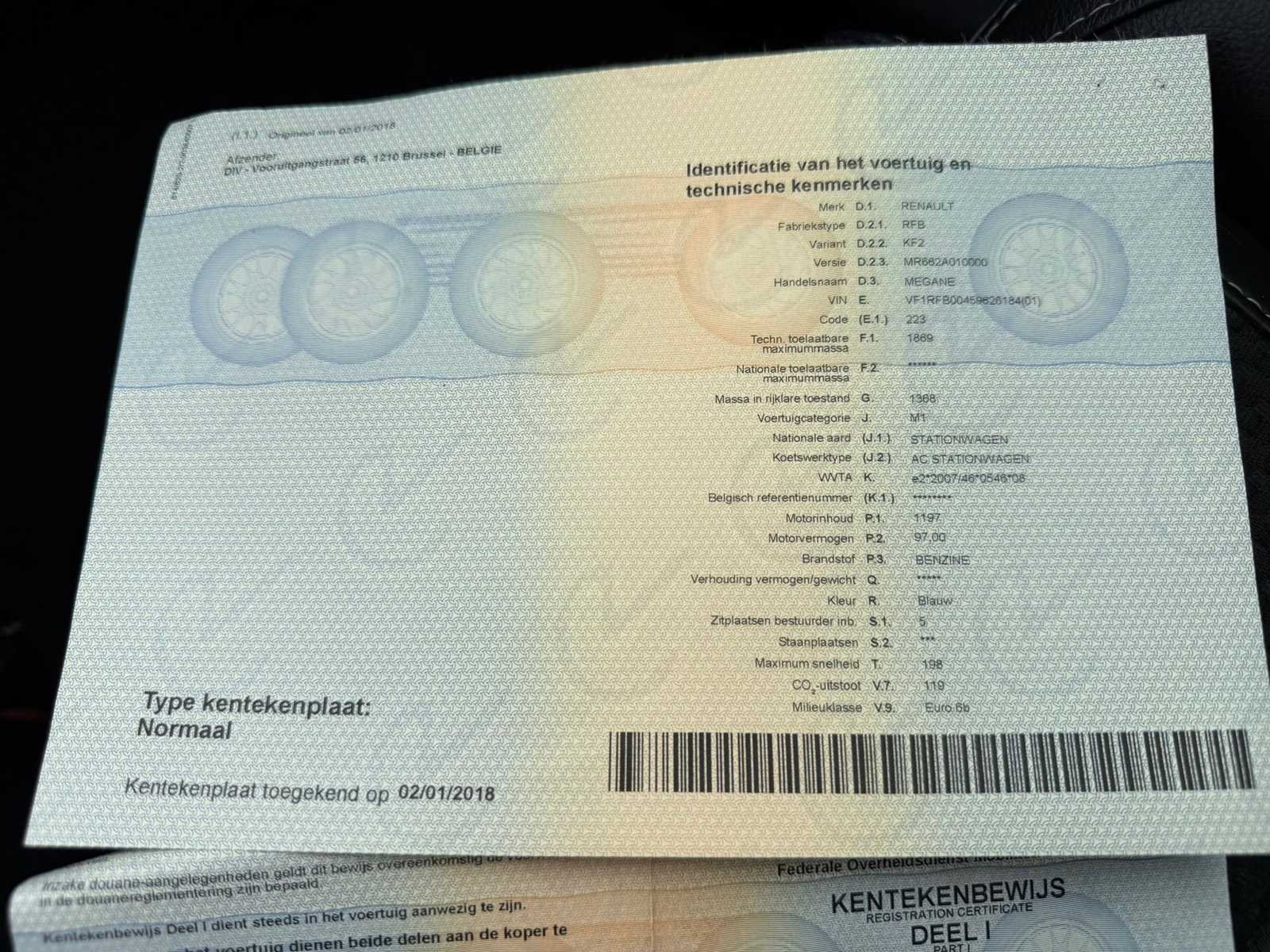 Nee Merk: Renault Model: Megane Bouwjaar: 2018 Afgelezen kilometerstand: 112055km Cilinderinhoud: 1197cc Vermogen (kW): 97kW Brandstof: benzine Chassisnummer: VF1RFB00459626184 Datum eerste toelating: 02/01/2018 Aantal zitplaatsen: 5 Kleur: Blauw Transmissie: Handgeschakeld Emissieklasse: Euro 6b Aantal sleutels: 1 Nationaliteit documenten: België Start en rijdt: Ja Vavato voert geen technische keuring uit.: true Inschrijvingsbewijs - deel 1 : Aanwezig Inschrijvingsbewijs - deel 2: Aanwezig