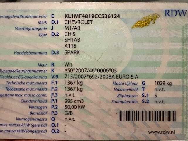 Links achter hand rem blijft soms hangen dan deze moeten vernieuwd nederlands kenteken overschrijven kosten koper . of export documenten kunnen door ons verzorgd worden tegen betaling van 100 euro. No Kenteken: 04svv9 Merk: Chevrolet Model: Spark Type: 1.0 16V LT+ Bi-Fuel Bouwjaar: 2011 Cilinderinhoud: 995cc Vermogen (kW): 50kW Datum eerste toelating: 2011-12-17 Datum eerste toelating (NL): 2011-12-17 APK vervaldatum: 2025-12-29 Aantal zitplaatsen: 5 Kleur: wit Gasinstallatie: true Emissieklasse: 5 Aantal deuren: 4 Ledig gewicht: 929kg Aantal cilinders: 4 Carrosserie: hatchback Carfax Link: https://was.carfax.eu/v0/api/ccdid/5100016408/svc/201/vinreg/04SVV9/checksum/eyJhbGciOiJIUzI1NiIsInR5cCI6IkpXVCJ9.eyJleHAiOjE3NzA5MTY1NDh9.VJTiy0ZDBhfjxYgrtM8P66baBNFAAO2aAZSacarjOjw Start en rijdt: ja startinformatie : ja