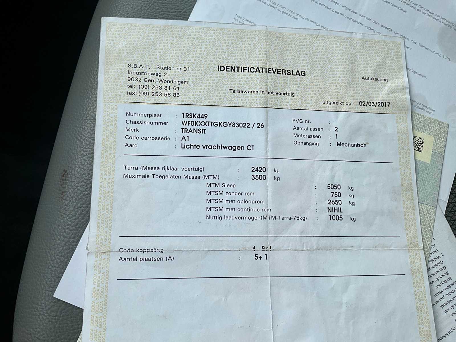 Nee Merk: Ford Model: Transit Bouwjaar: 2017 Afgelezen kilometerstand: 250063km Cilinderinhoud: 1995cc Vermogen (kW): 96kW Brandstof: diesel Chassisnummer: WF0KXXTTGKGY83022 Datum eerste toelating: 20/02/2017 Transmissie: Handgeschakeld Nationaliteit documenten: Belgisch Start en rijdt: Ja startinformatie : Start en rijdt Inschrijvingsbewijs - deel 1 : Aanwezig Inschrijvingsbewijs - deel 2: Aanwezig