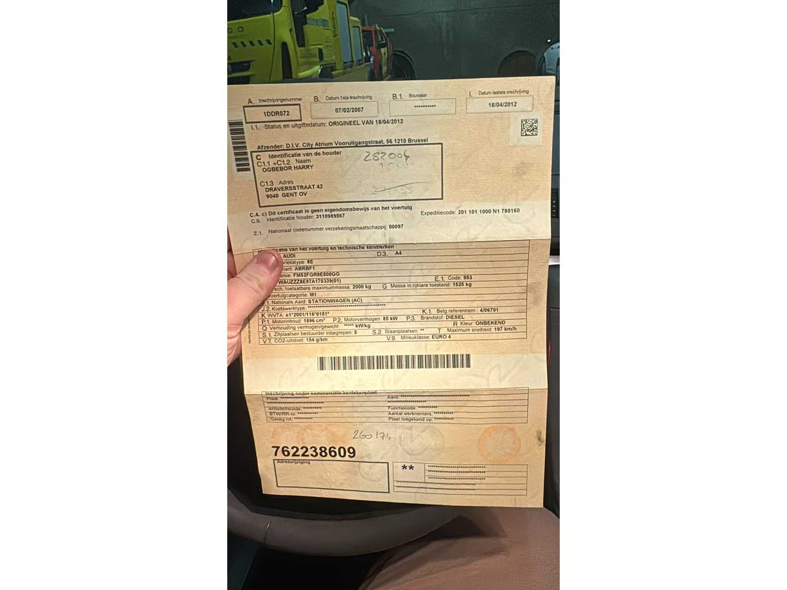 Nee Merk: Audi Model: A4 Bouwjaar: 2007 Afgelezen kilometerstand: 288534km Cilinderinhoud: 1896cc Vermogen (kW): 85kW Brandstof: diesel Chassisnummer: WAUZZZ8E87A175339 Datum eerste toelating: 07/02/2007 Transmissie: Handgeschakeld Aantal sleutels: 2 Nationaliteit documenten: Belgisch Start en rijdt: Ja startinformatie : Start en rijdt Inschrijvingsbewijs - deel 1 : Aanwezig Inschrijvingsbewijs - deel 2: Aanwezig