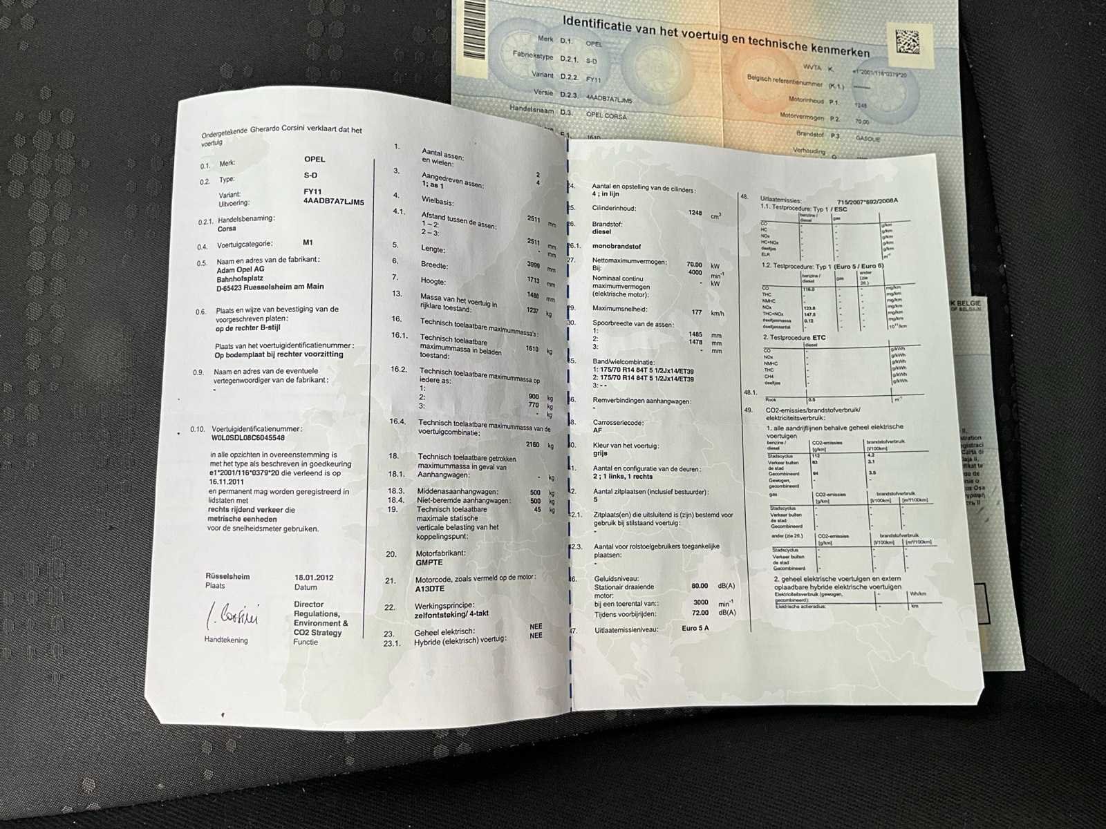 Let op, start en rijdt niet! Heeft injector problemen. Nee Merk: Opel Model: Corsa Bouwjaar: 2012 Afgelezen kilometerstand: 230000km Cilinderinhoud: 1248cc Vermogen (kW): 70kW Brandstof: diesel Chassisnummer: W0L0SDL08C6045548 Datum eerste toelating: 28/08/2012 Aantal zitplaatsen: 5 Transmissie: Handgeschakeld Emissieklasse: Euro 5 Aantal deuren: 3 Nationaliteit documenten: Belgisch Start en rijdt: Ja Vavato voert geen technische keuring uit.: true Airconditioning: true Inschrijvingsbewijs - deel 1 : Aanwezig Inschrijvingsbewijs - deel 2: Aanwezig