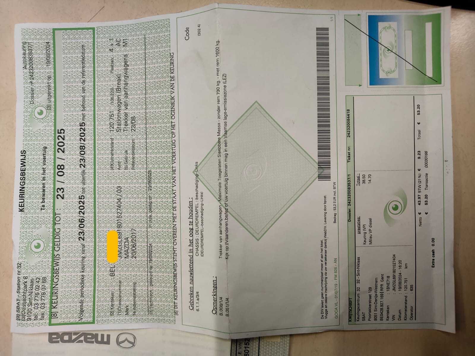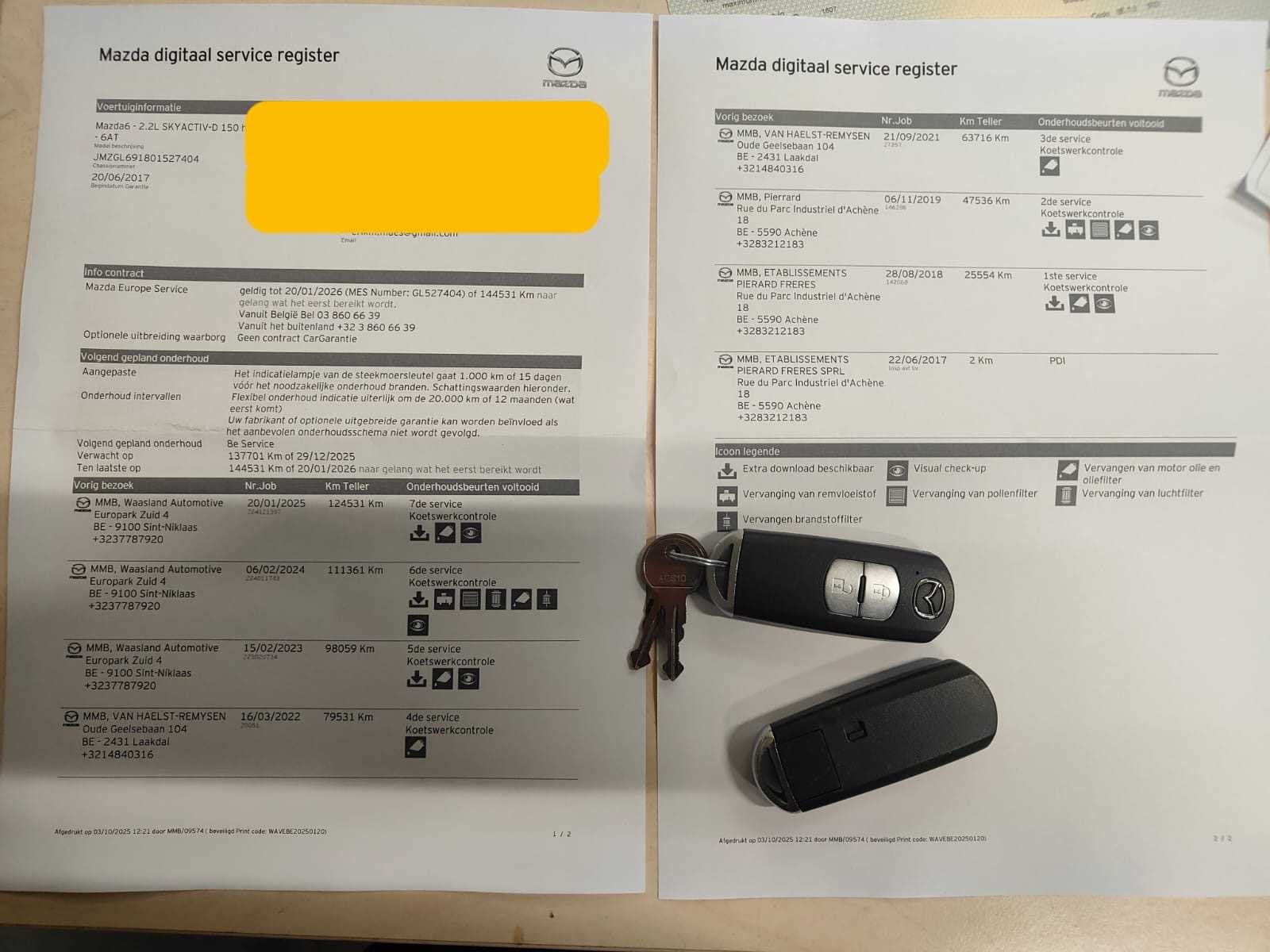 Mazda 6 Skyactive diesel 2.2 110kw Euronorm 6b Bouwjaar 2017 130.000km Full options: Lederen zetels Verstelbare zij spiegels Dodehoek sensor melding aan zij spiegels Elektrisch verstelbare zij spiegels Elektrische ruiten voor en achter Cruise controle, limiter Automatische verlichting, regensensor Start stop Automatische climaat verstellling DAB, USB,AUX,NAVI carplay, parkeer camera,parkeer sensoren voor achter Afneembare trekhaak Keyless entry 6 traps automaat Xenon Verwarmde zetels Nieuwe 19" velgen!! 4 nieuwe banden!! 2 sleutels Steeds bij erkende Mazda dealer onderhouden, aantoonbaar. !!! AERO PACK zeer zelden op een Mazda 6 !! Kleine deuk aan dorpel links voor Nee Merk: Mazda Model: 6 Bouwjaar: 2017 Afgelezen kilometerstand: 130000km Cilinderinhoud: 2191cc Vermogen (kW): 110kW Brandstof: diesel Chassisnummer: JMZGL691801527404 Datum eerste toelating: 20/06/2017 Aantal zitplaatsen: 5 Transmissie: Automaat Emissieklasse: Euro 6b Aantal deuren: 5 Aantal sleutels: 2 Nationaliteit documenten: Belgisch Start en rijdt: Ja startinformatie : Start & rijdt Vavato voert geen technische keuring uit.: true Airconditioning: true Navigatie: true Leder bekleed: true