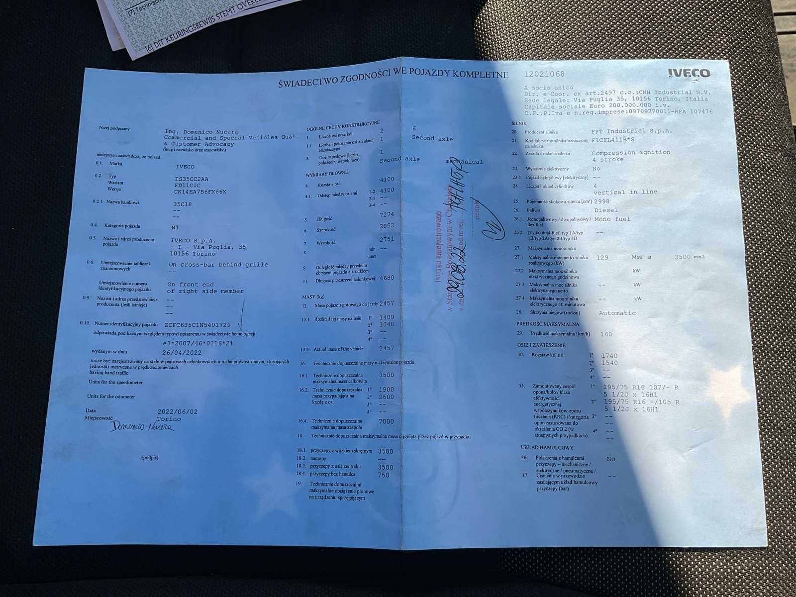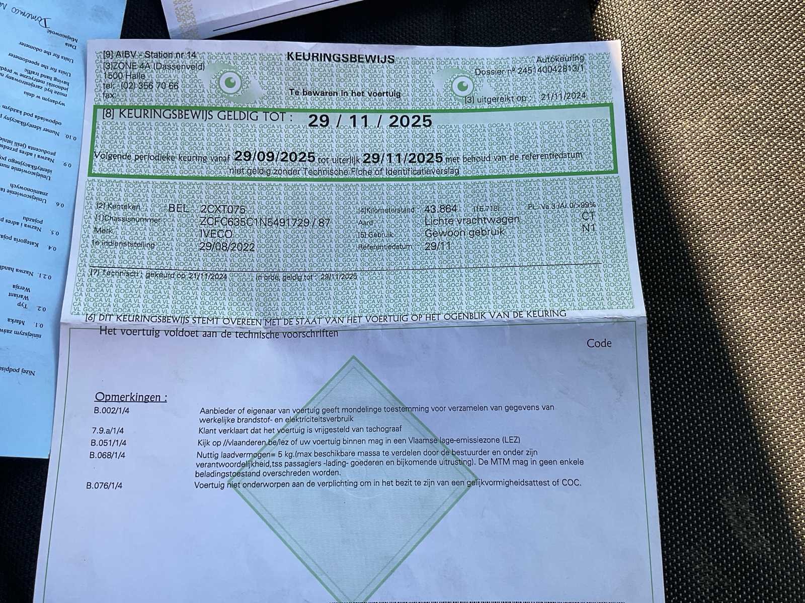 Inhoud niet inbegrepen , houten rekken wel inbegrepen. Recent banden vervangen , onderhoudshistoriek bij Iveco. L4 ( lange laadruimte) Nee Merk: Iveco Type: 35C18 Bouwjaar: 2022 Chassisnummer: ZCFC635C1N5491729 Afgelezen kilometerstand: 67206km Cilinderinhoud: 2998cc Vermogen (kW): 129kW Brandstof: diesel Datum eerste toelating: 29/08/2022 Transmissie: Automatisch Aantal zitplaatsen: 3 Kleur: Wit Nationaliteit documenten: België Stuurwiel: LHD Aantal sleutels: 2 Emissieklasse: Euro VI Kentekenpapieren compleet?: true Startinformatie: Start en rijdt Maximaal trekgewicht ongeremd: 750 Maximaal trekgewicht geremd: 3500
