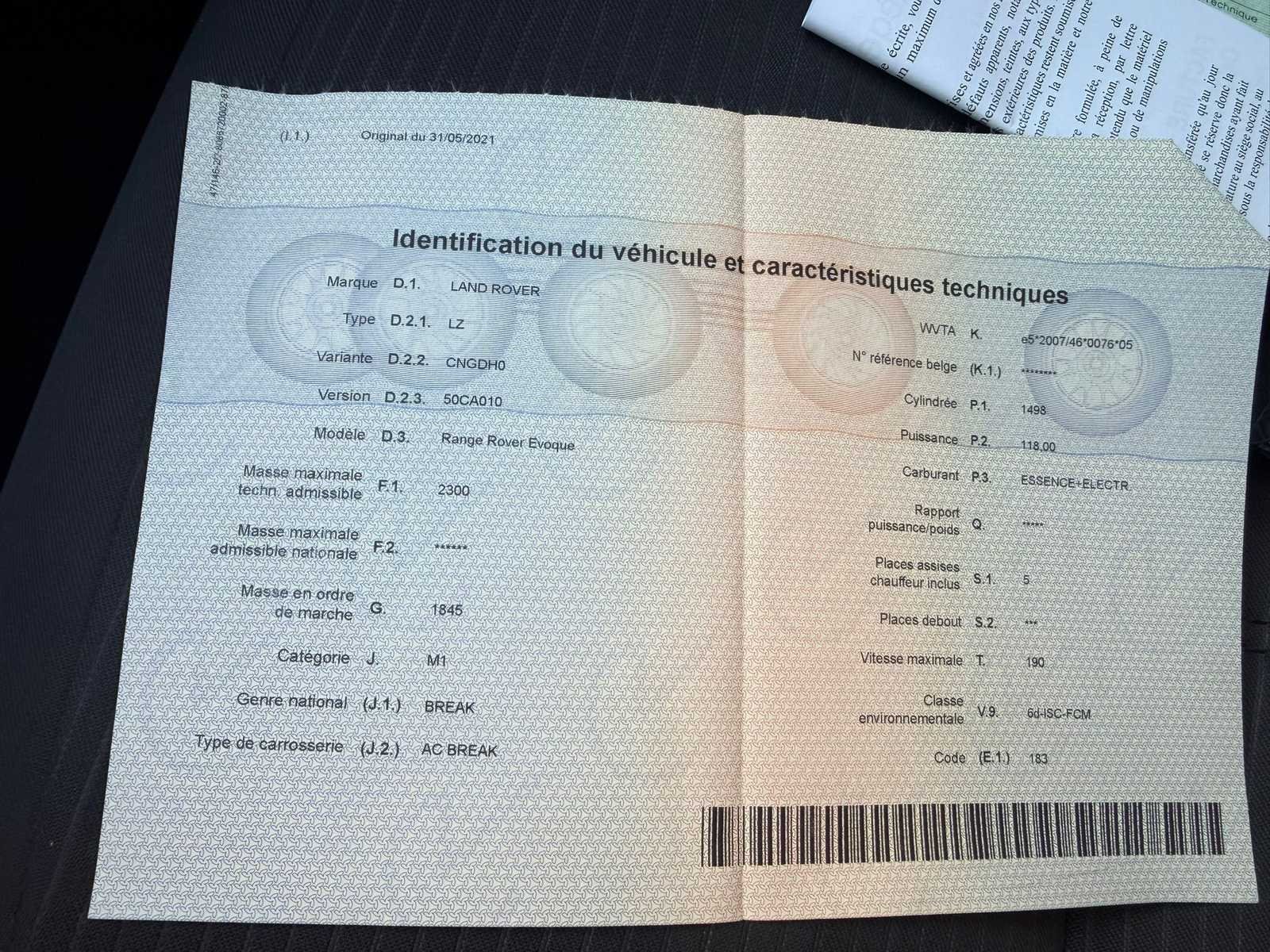 Nee Merk: Land Rover Model: Range rover Evoque Bouwjaar: 2021 Afgelezen kilometerstand: 105510km Cilinderinhoud: 1498cc Vermogen (kW): 118kW Brandstof: hybride (elektrisch+benzine) Chassisnummer: SALZB2BS1MH150193 Datum eerste toelating: 31/05/2021 Aantal zitplaatsen: 5 Transmissie: Automaat Emissieklasse: Euro 6d Aantal deuren: 5 Nationaliteit documenten: Belgisch Start en rijdt: Ja Vavato voert geen technische keuring uit.: true Airconditioning: true Navigatie: true Xenon verlichting: true Inschrijvingsbewijs - deel 1 : Aanwezig Inschrijvingsbewijs - deel 2: Aanwezig