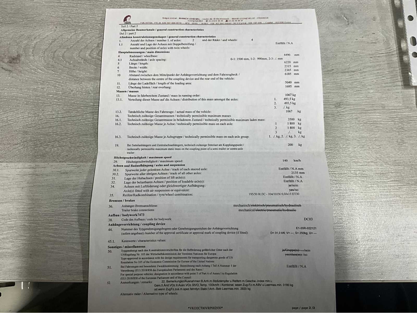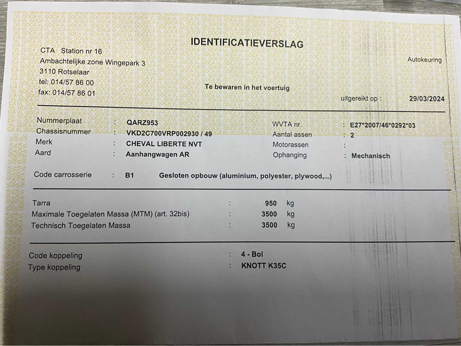 Prachtige en quasi nieuwe Cheval Liberté C7 van 2024, volledig professioneel uitgevoerd met gesloten aluminium/polyester opbouw en 3500 kg MTM. Dankzij de dubbelas en het indrukwekkende laadvermogen van 2.550 kg is deze aanhangwagen ideaal voor het transport van voertuigen, moto’s, quads, machines, materiaal of professionele cargo. De trailer is heel licht (slechts 950 kg tarra) en daardoor extra gebruiksvriendelijk, ook achter kleinere bedrijfswagens. Het verzinkte chassis en de kwalitatieve Knott K35C-koppeling garanderen duurzaamheid en veiligheid - Afmetingen (volgens COC): Totale lengte: 5.000 mm - Totale breedte: 2.135 mm - Totale hoogte: 2.365 mm - Wielbasis: 3.150 mm - Overbouw achteraan: 1.055 mm - Trackbreedte: 1.780 mm - Technisch volledig in orde — geldig keuringsbewijs tot 29/03/2026 - COC aanwezig - Kentekenbewijs deel 1 aanwezig, deel 2 wordt correct meegeleverd met officieel attest van verlies. Nee Merk: Cheval Liberté Type: C7 Model: transporttrailer Bouwjaar: 2024 Chassisnummer: VKD2C700VRP002930 Laadvermogen: 2550kg Nationaliteit documenten: B