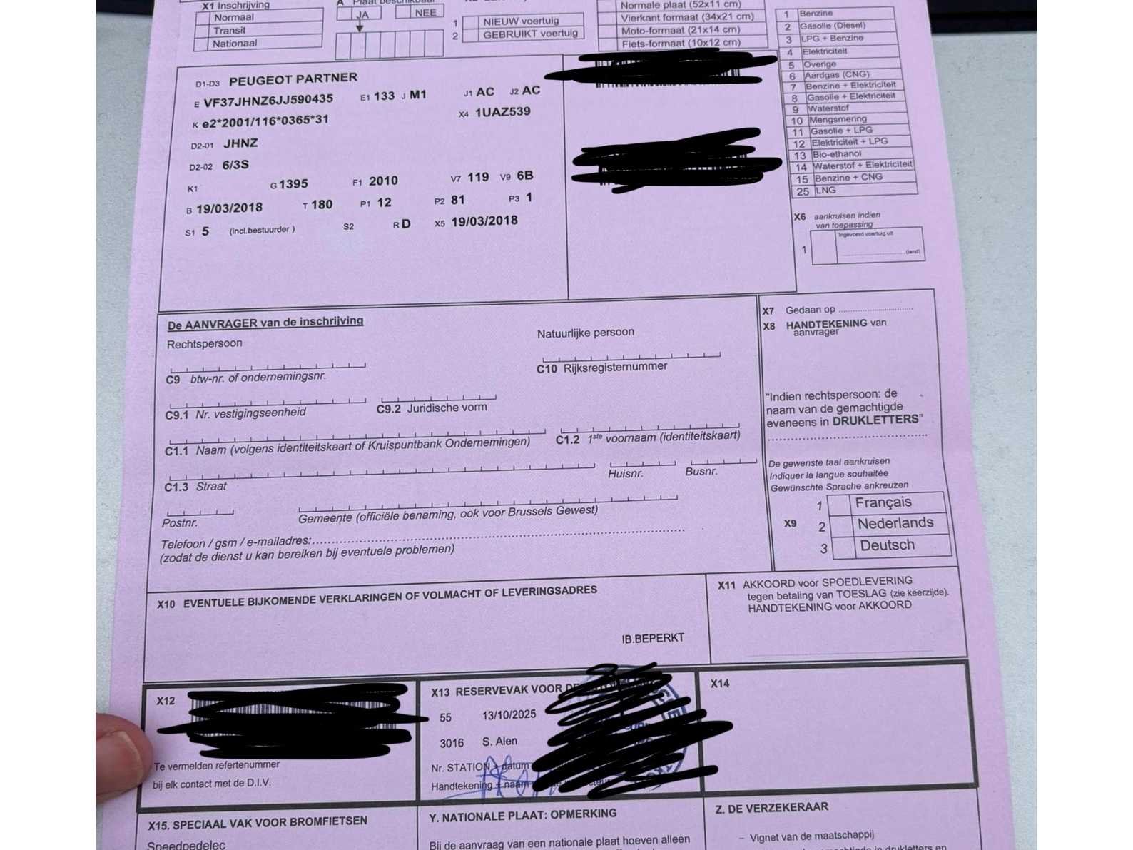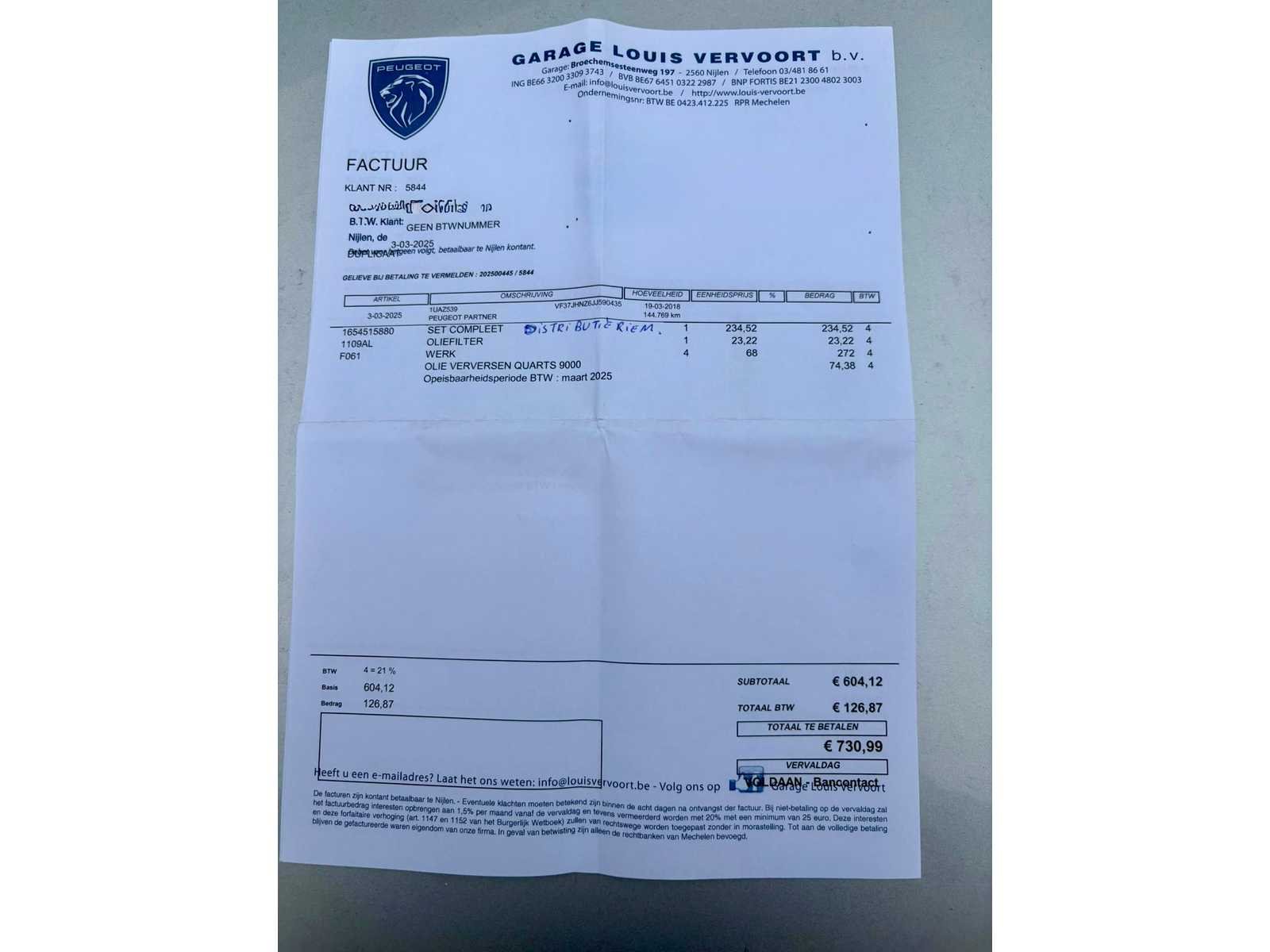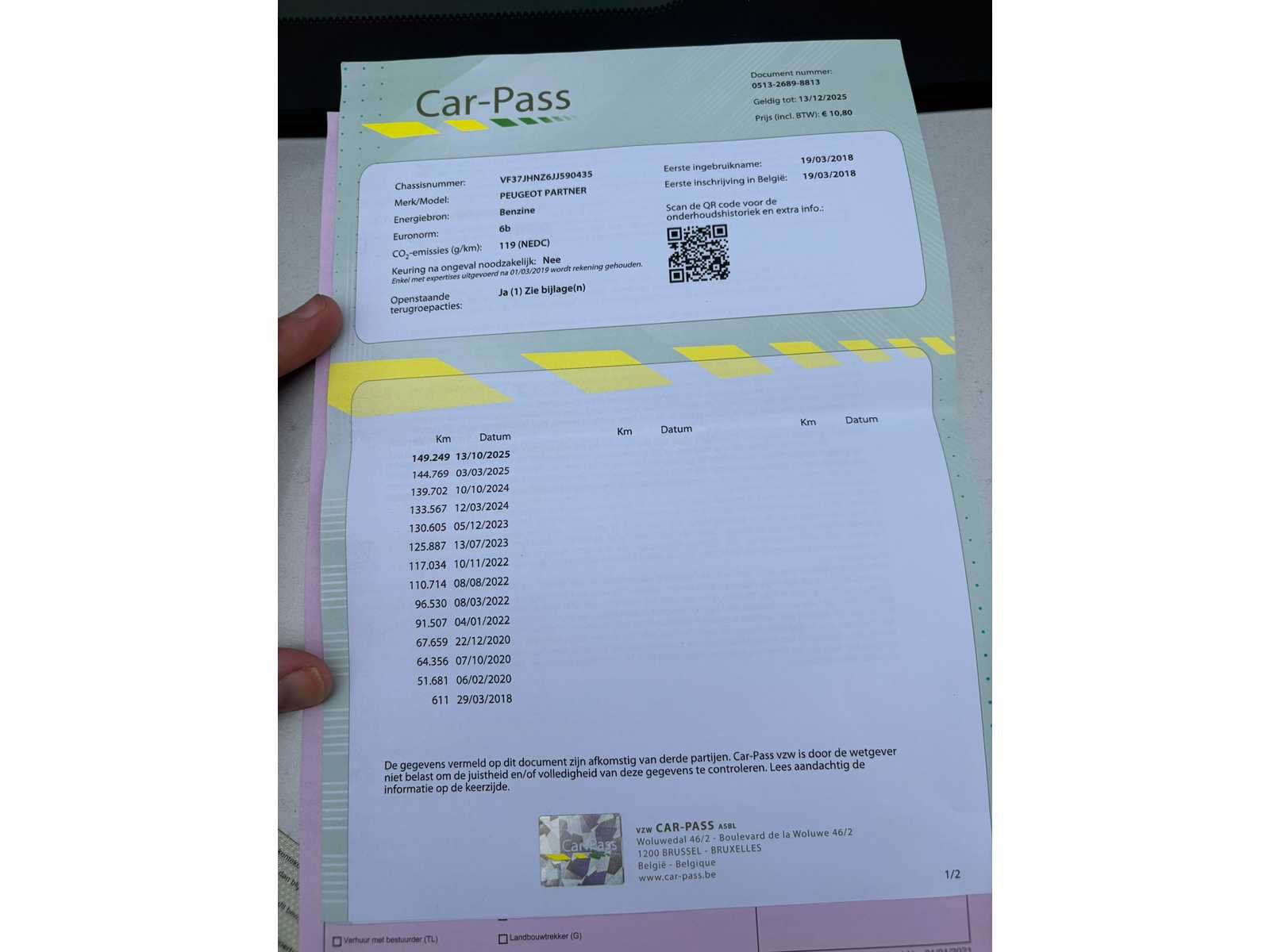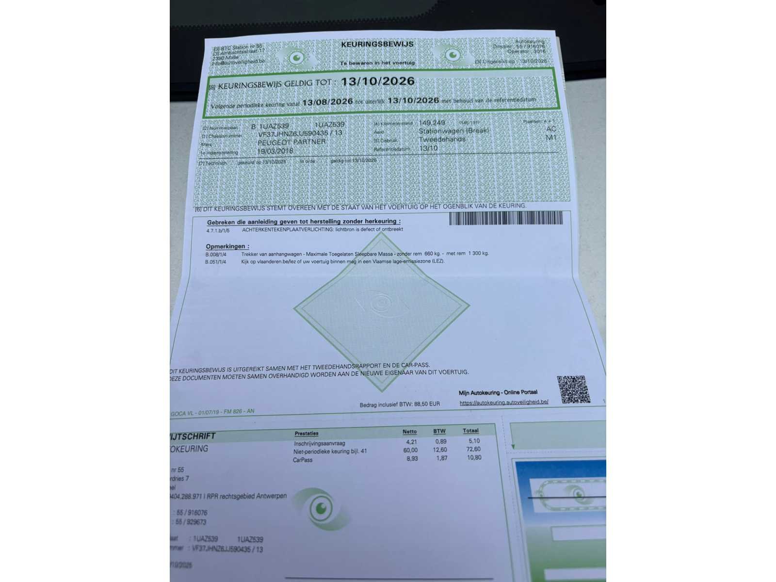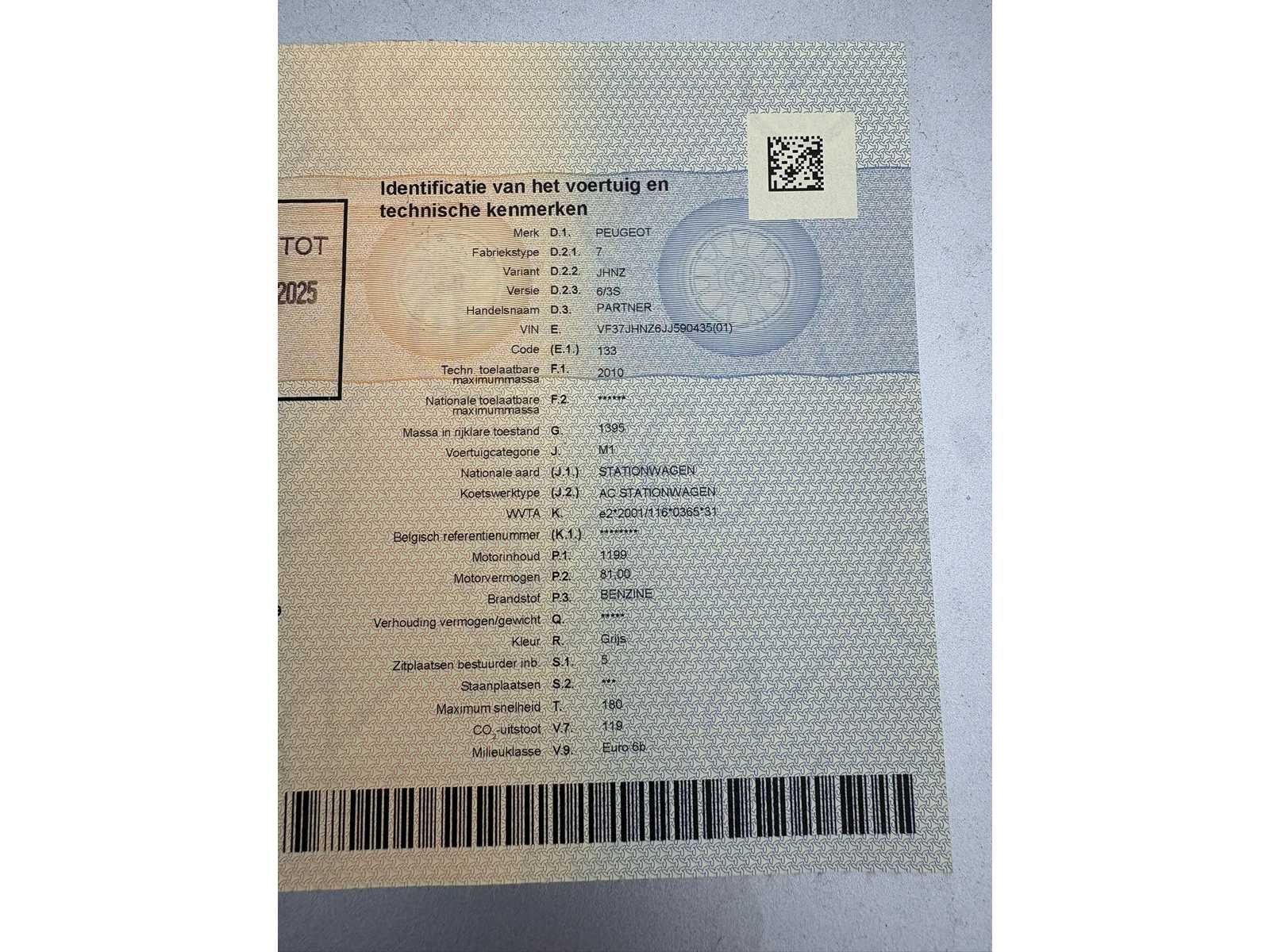 Zeer nette Peugeot Partner Tepee van eerste inschrijving 03/2018, uitgerust met de 1.2 PureTech benzinemotor (110 pk) en manuele versnellingsbak. De wagen beschikt over een volledige en correcte Car-Pass, werd recent onderhouden en is GEKEURD VOOR VERKOOP! met een quasi blanco keuringsrapport. Dankzij zijn Tepee-uitvoering combineert dit voertuig comfort, ruimte en praktische inzetbaarheid ✔️ Recent onderhoud uitgevoerd ✔️ Distributieriem vervangen (factuur aanwezig – maart 2025 ✔️ Gekeurd voor verkoop: kan onmiddellijk ingeschreven worden ✔️ Quasi blanco keuring (Enkel opmerking: achterkentekenplaatverlichting – lichtbron defect of ontbreekt) ✔️ Keuringsbewijs geldig tot 13/10/2026 ✔️ Car-Pass aanwezig ✔️ Gelijkvormigheidsattest (COC) aanwezig ✔️ Onderhoudsfacturen aanwezig ✔️ 2 sleutels aanwezig airconditioning - Navigatie - Achteruitrijcamera - Parkeersensoren achter - Trekhaak - Multifunctioneel stuur -Bluetooth / telefoonconnectiviteit - Elektrische ramen - Centrale vergrendeling Nee Merk: Peugeot Model: Partner Type: stationwagen Bouwjaar: 2018 Afgelezen kilometerstand: 149273km Cilinderinhoud: 1199cc Vermogen (kW): 81kW Brandstof: benzine Chassisnummer: VF37JHNZ6JJ590435 Datum eerste toelating: 19/3/2018 Aantal zitplaatsen: 5 Maximaal trekgewicht ongeremd: 660kg Maximaal trekgewicht geremd: 1300kg Kleur: grijs Transmissie: Handgeschakeld Emissieklasse: Euro 6b Aantal deuren: 5 Aantal sleutels: 2 Ledig gewicht: 1395kg Nationaliteit documenten: B Gelijkvormigheidsattest aanwezig: true Start en rijdt: ja Keuringsrapport geldig tot: 13/10/2026 Vavato voert geen technische keuring uit.: true Airconditioning: true Navigatie: true Inschrijvingsbewijs - deel 1 : Aanwezig Inschrijvingsbewijs - deel 2: Aanwezig