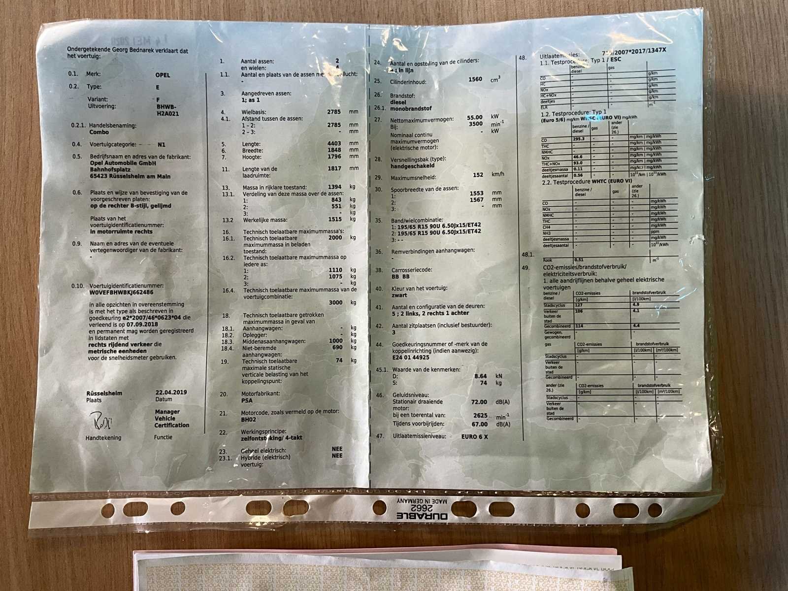 No Merk: Opel Type: Combo Bouwjaar: 2020 Chassisnummer: W0VEFBHWBKJ662486 Afgelezen kilometerstand: 93310km Cilinderinhoud: 1560cc Vermogen (kW): 55kW Brandstof: Diesel Datum eerste inschrijving: 11/05/2020 Transmissie: Handgeschakeld Aantal zitplaatsen: 3 Nationaliteit documenten: BE Aantal deuren: 3 Ledig gewicht: 1394kg Laadvermogen: 505kg Kentekenpapieren compleet?: true Boorddocumenten aanwezig?: true Maximaal trekgewicht geremd: 3000