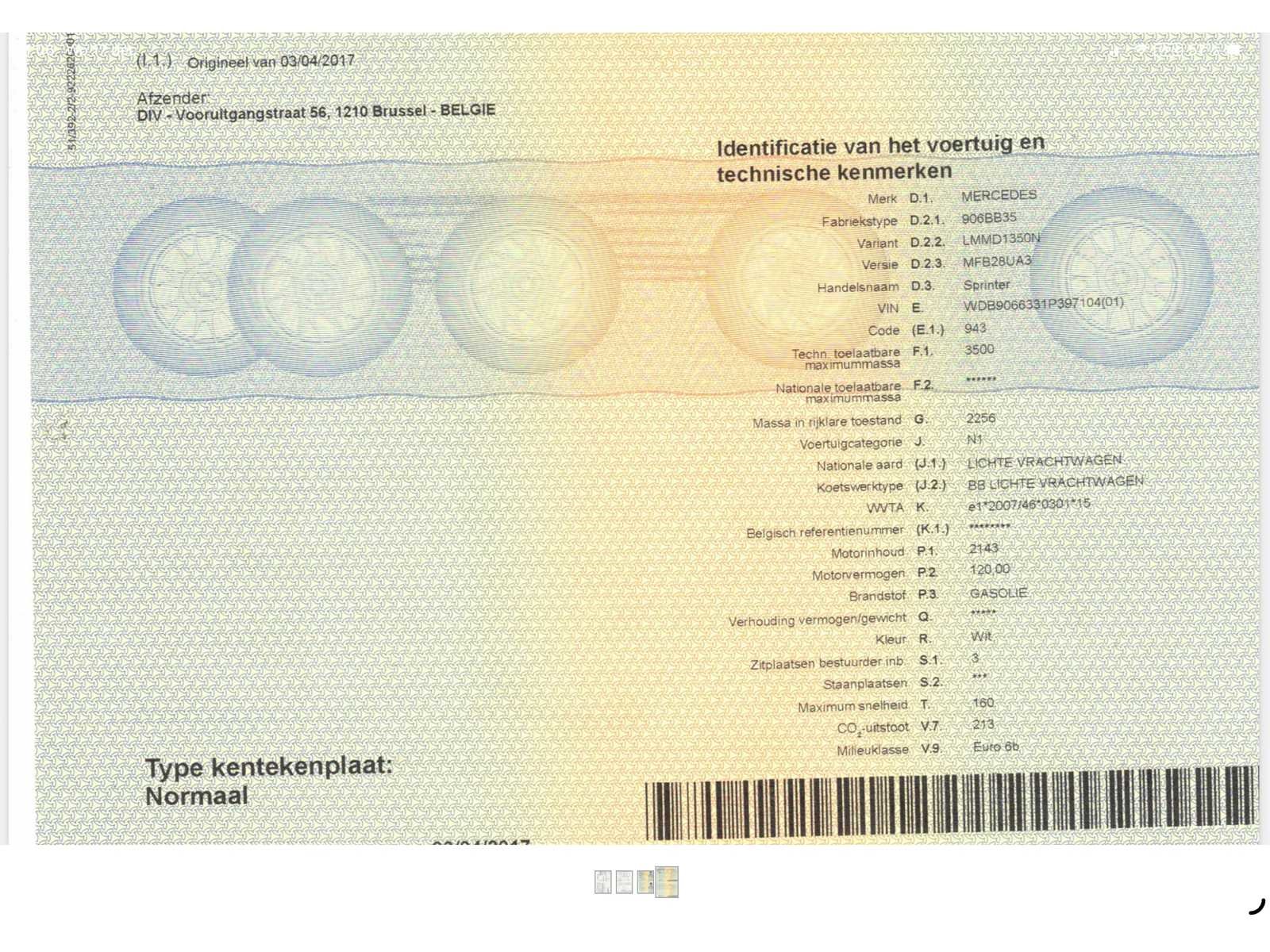 Nee Merk: Mercedes-Benz Type: Sprinter Bouwjaar: 2017 Chassisnummer: WDB9066331P397104 Afgelezen kilometerstand: 30934km Cilinderinhoud: 2143cc Vermogen (kW): 120kW Brandstof: diesel Datum eerste inschrijving: 03/04/2017 Transmissie: Automaat Aantal zitplaatsen: 3 Nationaliteit documenten: BE Aantal deuren: 4 Ledig gewicht: 2256kg Laadvermogen: 750kg Maximaal trekgewicht ongeremd: 750 Maximaal trekgewicht geremd: 2000