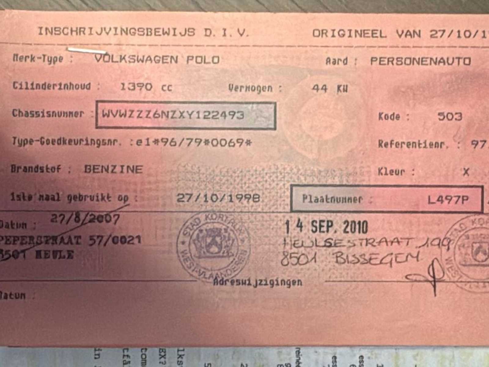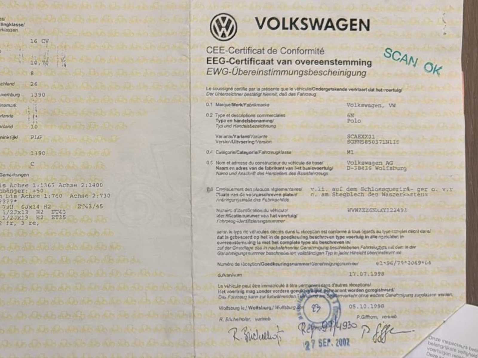 Nee Merk: Volkswagen Model: Polo Bouwjaar: 1998 Afgelezen kilometerstand: 47678km Cilinderinhoud: 1390cc Vermogen (kW): 44kW Brandstof: Benzine Chassisnummer: WVWZZZ6NZXY122493 Datum eerste toelating: 27/10/1998 Transmissie: Handgeschakeld Ledig gewicht: 992kg Nationaliteit documenten: BE Gelijkvormigheidsattest aanwezig: true Start en rijdt: Ja Keuringsrapport geldig tot: 27/10/2026 startinformatie : Start, rijdt, remt Vavato voert geen technische keuring uit.: true Inschrijvingsbewijs - deel 1 : OK Inschrijvingsbewijs - deel 2: OK