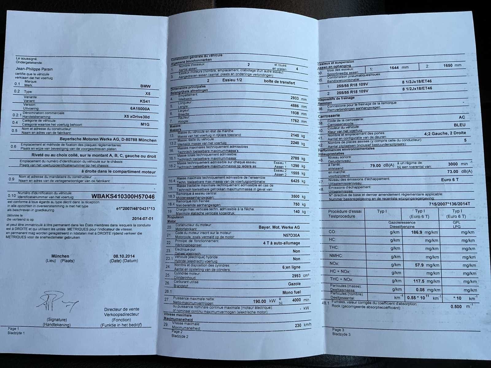 Motorisch en technisch in werkende staat. Parkeersensoren. Zetelverwarming. Oppervlakkige lakschade aan voorbumper (zie foto’s). Nee Merk: BMW Model: X5 xDrive30d Bouwjaar: 2014 Afgelezen kilometerstand: 229059km Cilinderinhoud: 2993cc Vermogen (kW): 190kW Brandstof: Diesel Chassisnummer: WBAKS410300H57046 Datum eerste toelating: 05/12/2014 Aantal zitplaatsen: 5 Kleur: Blauw Transmissie: Automaat Emissieklasse: Euro 6b Aantal deuren: 5 Aantal cilinders: 6 Nationaliteit documenten: België Gelijkvormigheidsattest aanwezig: true Start en rijdt: Ja Vavato voert geen technische keuring uit.: true Airconditioning: true Navigatie: true Leder bekleed: true Vierwielaandrijving 4x4: true Inschrijvingsbewijs - deel 1 : Ja Inschrijvingsbewijs - deel 2: Ja